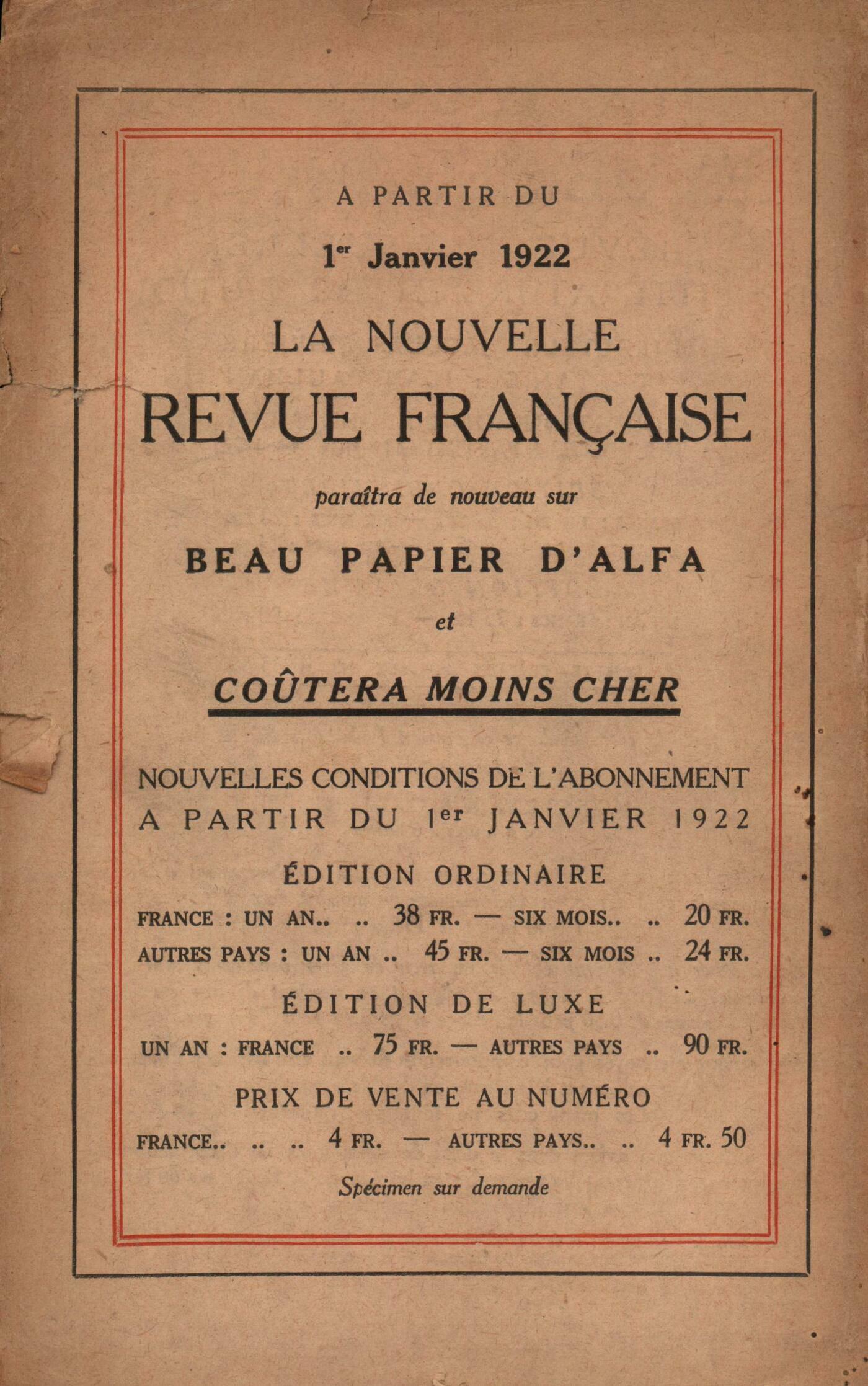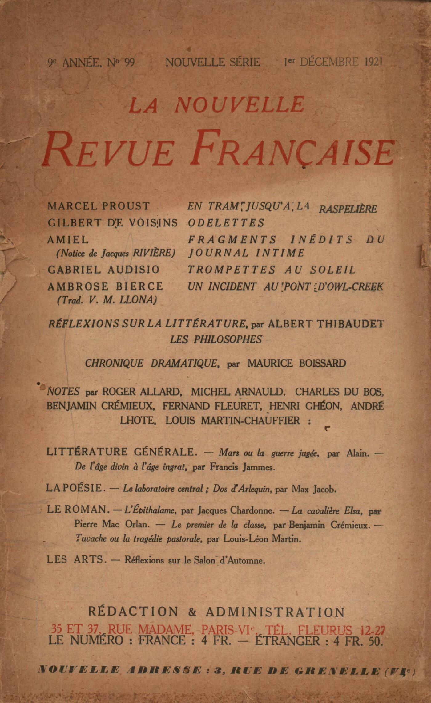 Marcel Proust, En tram jusqu'ŕ la RaspeličreAuguste Gilbert de Voisins, OdelettesJacques Rivičre, AmielHenri-Frédéric Amiel, Fragments inédits du Journal intimeGabriel Audisio, PočmesAmbrose Bierce, Un incident au pont d'Owl-CreekRéflexions ssur la littérature : Albert Thibaudet, Les philosophesMaurice Boissard, Chronique dramatiqueNotes : littérature générale : Michel Arnauld, Mars ou La guerre jugée, par Alain (Éditions de la Nouvelle Revue Française)Henri Ghéon, De l'âge divin ŕ l'âge ingrat, par Francis Jammes (Plon et Nourrit)Notes : la poésie : Roger Allard, Le Laboratoire central, par Max Jacob (Au Sans Pareil) - Dos d'Arlequin, par Max Jacob (Éditions du Sagittaire)Notes : le roman : Charles Du Bos, L'Épithalame, par Jacques Chardonne (Stock)Fernand Fleuret, La Cavaličre Elsa, par Pierre Mac Orlan (Nouvelle Revue Française)Louis Martin-Chauffier, Le premier de la classe, par Benjamin Crémieux (Grasset)Benjamin Crémieux, Tuvache ou La tragédie pastorale, par Louis-Léon Martin (Grasset)Notes : les arts : André Lhote, Réflexions sur le Salon d'Automne