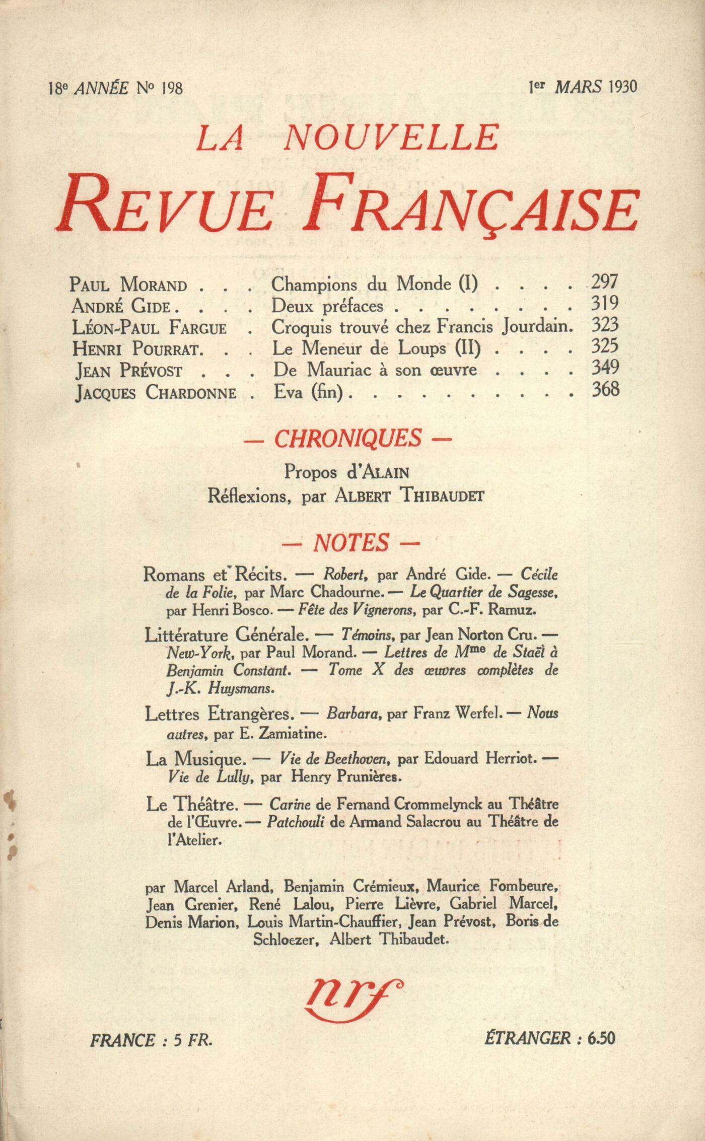 Paul Morand, Champions du monde (I)André Gide, Deux préfacesLéon-Paul Fargue, Croquis trouvé chez Francis JourdainHenri Pourrat, Le Meneur de loups (II)Jean Prévost, De Mauriac ŕ son uvreJacques Chardonne, Éva ou Le journal interrompu (Fin) Alain, ProposRéflexions : Albert Thibaudet, Romantisme et PolitiqueNotes : romans et récits : Louis Martin-Chauffier, Robert, par André Gide (Éditions de la N. R. F.)Gabriel Marcel, Cécile de la Folie, par Marc Chadourne (Plon)Jean Grenier, Le Quartier de Sagesse, par Henri Bosco (Éditions de la N. R. F.)Maurice Fombeure, Fęte des vignerons, par C. F. Ramuz (Horizons de France)Notes : littérature générale : Albert Thibaudet, Témoins, par Jean Norton Cru (Les Étincelles)René Lalou, New-York, par Paul Morand (Flammarion)Jean Prévost, Lettres de Madame de Staël ŕ Benjamin Constant (Kra)Pierre Ličvre, uvres complčtes, X, de J. K. HuysmansNotes : lettres étrangčres : Gabriel Marcel, Barbara, par Franz Werfel (Zsolnay éd.)Denis Marion, Nous autres, par Eugčne Zamiatine (Éditions de la N. R. F.)Notes : la musique : Boris de Schlzer, La vie de Beethoven, par Édouard Herriot (Éditions de la N. R. F.) - La vie de Lully, par Henry Pruničres (Plon)Notes : le théâtre : Marcel Arland, Carine ou La jeune fille folle de son âme, de Fernand Crommelynck (Théâtre de l'uvre)Divers : Benjamin Crémieux, Patchouli, d'Armand Salacrou (Théâtre de l'Atelier) Anonymes, Le monument Rupert Brooke