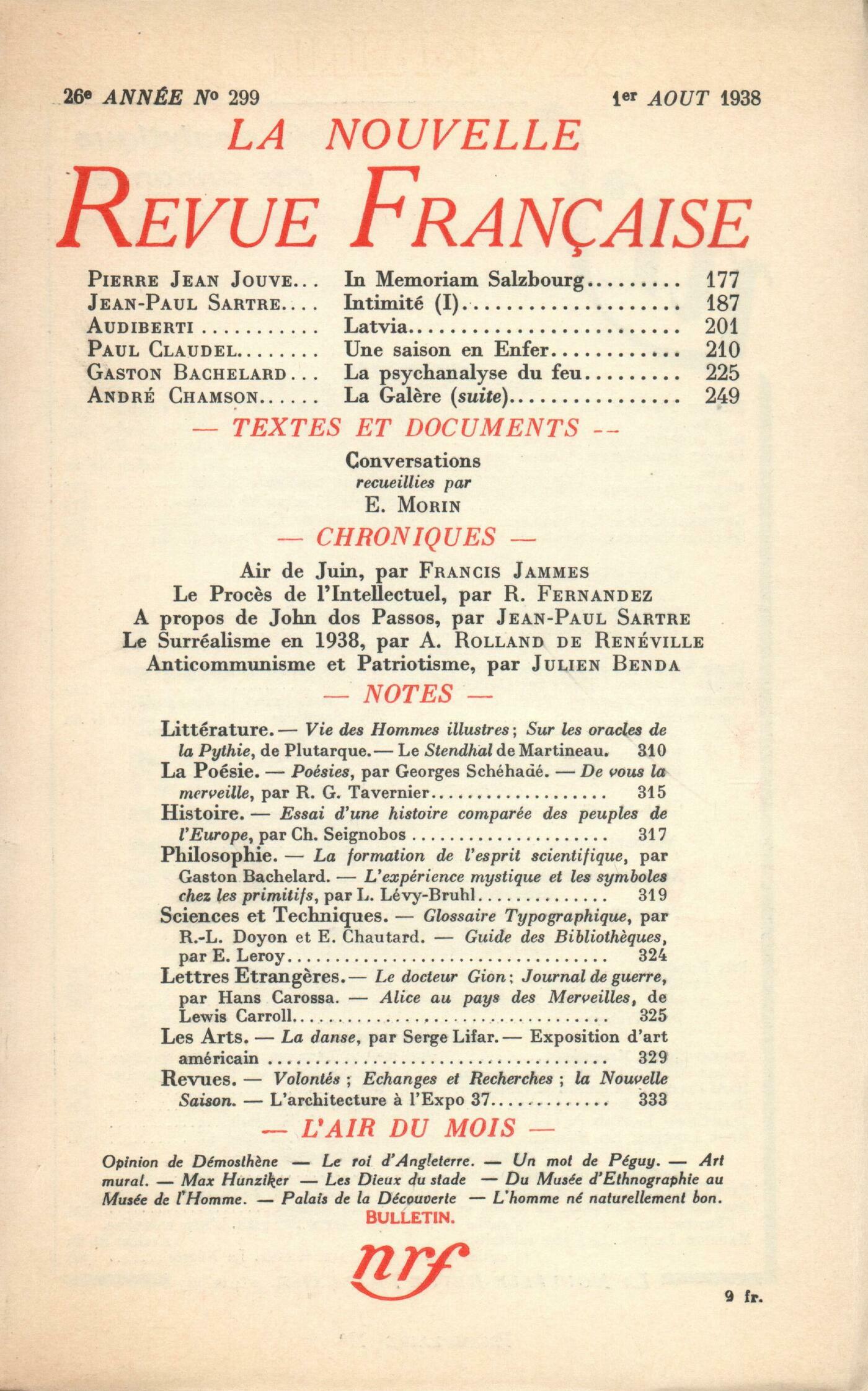 Pierre Jean Jouve, In Memoriam SalzbourgJean-Paul Sartre, Intimité (I)Jacques Audiberti, LatviaPaul Claudel, Une saison en EnferGaston Bachelard, La psychanalyse du feuAndré Chamson, La Galčre (III)Textes et documents : Edmond Morin, ConversationsChroniques : Francis Jammes, Air de juinRamon Fernandez, Le procčs de l'intellectuelJean-Paul Sartre, Ŕ propos de John Dos Passos et de 1919A. Rolland de Renéville, Le surréalisme en 1938Julien Benda, Anticommunisme et patriotismeNotes : littérature : Jean Prévost, Vie des Hommes Illustres, de Plutarque (La Pléiade)Marie Delcourt, Sur les Oracles de la Pythie, de Plutarque (Les Belles-Lettres)Pierre Ličvre, Le Stendhal de MartineauNotes : la poésie : Gabriel Bounoure, Poésies, par Georges Schéhadé (G. L. M.)Jean Wahl, De vous la merveille, par René Gérard Tavernier (Denoël)Notes : histoire : Jean Prévost, Essai d'une histoire comparée des peuples de l'Europe, par Ch. Seignobos (Rieder)Notes : philosophie : Jean Wahl, La formation de l'esprit scientifique, par Gaston Bachelard (Vrin)Roger Caillois, L'expérience mystique et les symboles chez les primitifs, par Lucien Lévy-Bruhl (Alcan) - Pages choisies, par Lucien Lévy-Bruhl (N. R. F.)Notes : sciences et techniques : Émile Dermenghem, Glossaire typographique, par René-Louis Doyon et Émile Chantard (Denoël)Julien Benda, Guide pratique des bibliothčques de Paris, par Émile Leroy (Éditions des bibliothčques nationales)Notes : lettres étrangčres : Wladimir Weidlé, Le docteur Gion, par Hans Carossa (Stock) - Journal de guerre, par Hans Carossa (Grasset)Denis de Rougemont, Alice au pays des merveilles, par Lewis Carroll (Desclée de Brouwer)Notes : les arts : Julie Sazonova, La danse, par Serge Lifar (Denoël)Maurice Sachs, Exposition d'art américain (Musée du Jeu de Paume)Les revues : Jean Wahl, Trois jeunes revuesAndré Lhote, L'architecture ŕ l'Expo 1937L'air du mois : Démosthčne, Démosthčne et l'AnschlussWladimir Weidlé, Le roi d'AngleterreJulien Benda, Un mot de PéguyAndré Lhote, Art muralRoger Gilbert-Lecomte, Max HunzikerDenis Marion, Les Dieux du StadeMichel Leiris, Du Musée d'ethnographie au Musée de l'HommeJean Ullmo, Palais de la DécouverteCharles-Albert Cingria, L'homme né naturellement bonJean Guérin, Bulletin