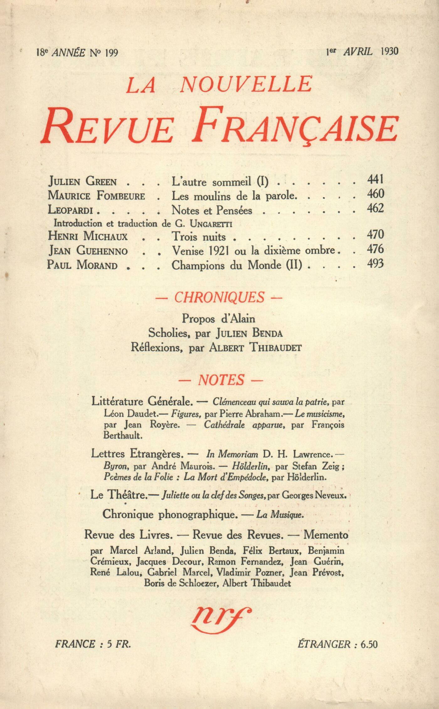 Julien Green, L'autre sommeil (I)Maurice Fombeure, Les moulins de la paroleGiacomo Leopardi, Notes et PenséesHenri Michaux, Trois nuitsJean Guéhenno, Venise 1921 ou La dixičme ombrePaul Morand, Champions du monde (II) Alain, ProposRéflexions : Albert Thibaudet, Les Deux RivesScholies : Julien Benda, Lettre ŕ Jean GuéhennoNotes : littérature générale : Julien Benda, Clemenceau qui sauva la patrie, par Léon Daudet (Le Capitole)Jean Prévost, Figures, par Pierre Abraham (Éditions de la N. R. F.)Albert Thibaudet, Le musicisme, par Jean Royčre (Messein)Jean Guérin, Cathédrale apparue, par François Berthault (Éditions de la N. R. F.)Notes : lettres étrangčres : Gabriel Marcel, In Memoriam D. H. LawrenceRamon Fernandez, Byron, par André Maurois (Grasset)Jacques Decour, Hölderlin, par Stefan Zweig (Stock) - Počmes de la folie de Hölderlin (J. O. Fourcade) - La Mort d'Empédocle, par Hölderlin (Éditions de la N. R. F.)Notes : le théâtre : Benjamin Crémieux, Juliette ou La clé des songes, de Georges Neveux (Théâtre de l'Avenue)Notes : la musique : Boris de Schlzer, Chronique phonographiqueRevue des livres : Jean Prévost, Le Sopha, par Crébillon fils (Le Divan) - Cérémonies et coutumes qui s'observent aujourd'hui parmi les Juifs, par Léon de Modčne (Rieder) - Nietzsche en Italie, par Guy de Pourtalčs (Grasset)Ramon Fernandez, Essai sur Jacques Rivičre et Alain-Fournier, par Alice Chauvet (Librairie D. Chabas)Jean Guérin, Sainte-Jeanne d'Arc, par Stanislas Fumet (Desclée de Brouwer)René Lalou, Le Rossignol américain, par Maurice Courtois-Suffit (Au Sans Pareil)Jean Guérin, Crise, par Madeleine Gautier (Charpentier)Félix Bertaux, Stendhal, par Rudolf Kayser (S. Fischer)Jean Prévost, Benoni, par Knut Hamsun (Rieder)René Lalou, La Confusion des sentiments, par Stefan Zweig (Stock)Jean Guérin, Deux prisonniers, par Lajos de Zilaby (Plon) - La Pénombre des âmes, par Arthur Schnitzler (Stock)Vladimir Pozner, Sur le Don paisible, par Michel Cholokhov (Payot)Jean Prévost, Léonard de Vinci, par Tristan Klingsor (Rieder) Anonymes, Mémento des revues - La Société Chateaubriand - Eisenstein