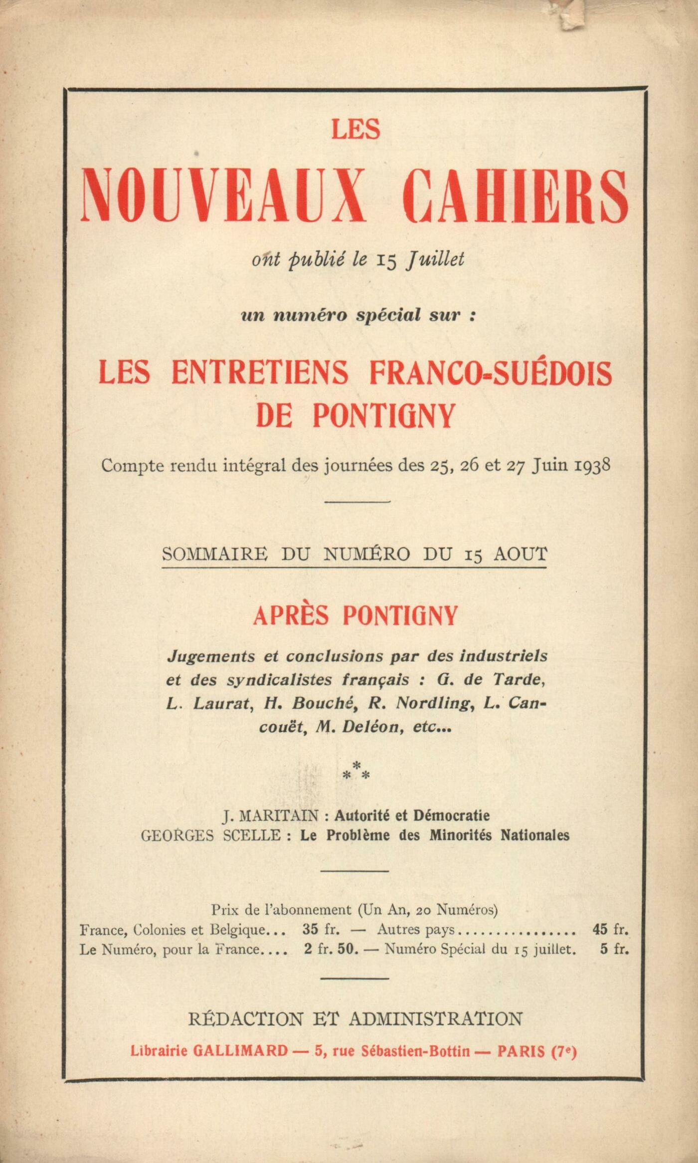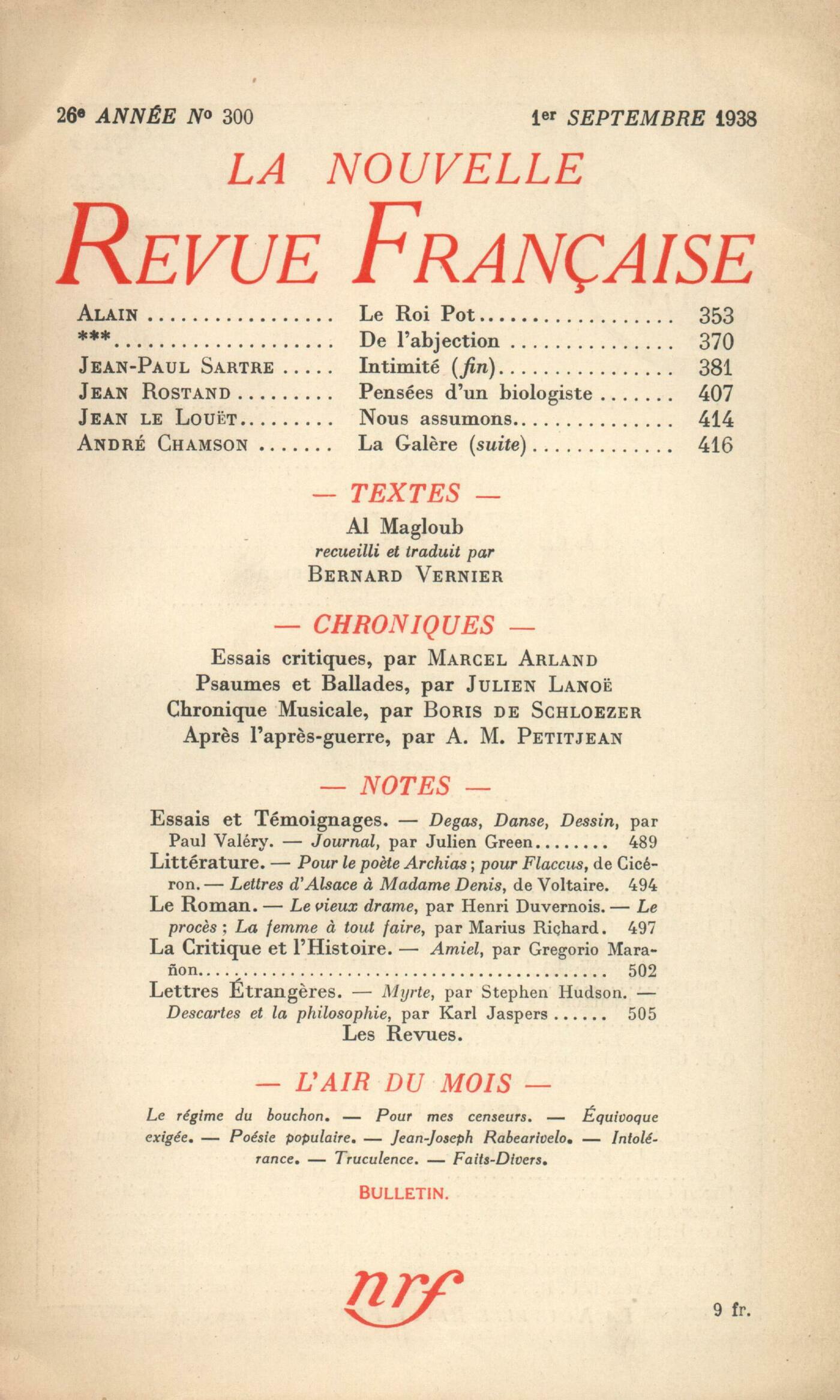 Alain, Le Roi Pot Anonymes, De l'abjectionJean-Paul Sartre, Intimité (Fin)Jean Rostand, Pensées d'un biologisteJean Le Louet, Nous assumons...André Chamson, La Galčre (IV)Textes : Bernard Vernier, Al Magloub ou Tout ŕ l'enversEssais critiques : Marcel Arland, Essai sur l'esprit d'orthodoxie, par Jean Grenier - Le moderne et son prochain, par Armand Petitjean - Besoin de grandeur, par C.-F. RamuzChroniques : Julien Lanoë, Psaumes et balladesChronique musicale : Boris de Schlzer, Critique de la CritiqueChroniques : Armand-M. Petitjean, Aprčs l'aprčs-guerreNotes : essais et témoignages : Jean Prévost, Degas Danse Dessin, par Paul Valéry (Éditions de la N. R. F.)Gabriel Marcel, Journal, de Julien Green (Plon)Notes : littérature : Marie Delcourt, Pour le počte Archias, par Cicéron (Belles-Lettres) - Pour Flaccus, par Cicéron (Belles-Lettres)Jean Prévost, Lettres d'Alsace ŕ Madame Denis, par Voltaire (Éditions de la N. R. F.)Notes : le roman : Jean Vaudal, Le Vieux Drame, par Henri Duvernois (Grasset)Jacques Debű-Bridel, Le Procčs, par Marius Richard (Corręa) - La femme ŕ tout faire, par Marius Richard (Éditions Montaigne)Notes : la critique et l'histoire : Léon Bopp, Amiel, par Gregorio Marańon (Éditions de la N. R. F.)Notes : lettres étrangčres : Wladimir Weidlé, Myrte, par Stephen Hudson (Éditions de la N. R. F.)Bernard Groethuysen, Descartes et la philosophie, par Karl Jaspers (Alcan)Les revues : Serge Essénine, Lettre ŕ sa mčreL'air du mois : Paul Claudel, Le régime du bouchonJulien Benda, Pour mes censeurs - Équivoque exigéeMaurice Fombeure, Poésie populaireRobert Boudry, Jean-Joseph RabeariveloAndré Lhote, IntoléranceCharles-Albert Cingria, TruculenceJacques Audiberti, Faits-diversJean Guérin, Bulletin