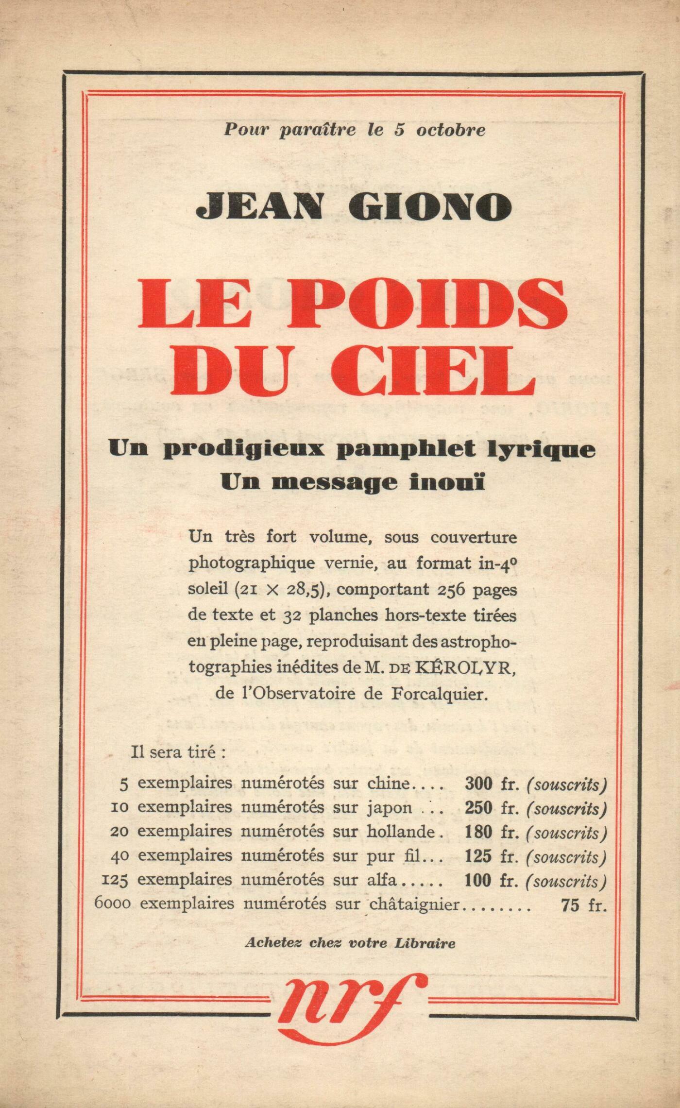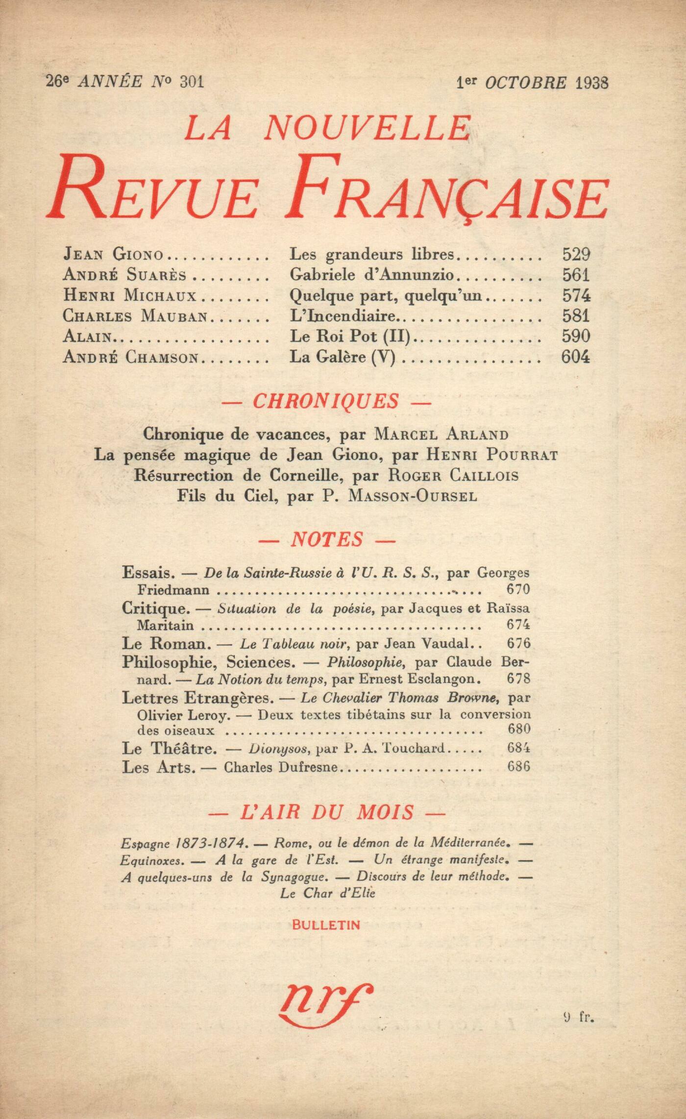 Jean Giono, Les grandeurs libresAndré Suarčs, Gabriele d'AnnunzioHenri Michaux, Quelque part, quelqu'unCharles Mauban, L'Incendiaire Alain, Le Roi Pot (II)André Chamson, La Galčre (V)Essais critiques : Marcel Arland, Chronique de vacances : Vienne Sur Poussin et le Classicisme Sur Blanche-Neige et le cinémaChroniques : Henri Pourrat, La pensée magique de Jean GionoRoger Caillois, Résurrection de CorneillePaul Masson-Oursel, Fils du Ciel, fils de DieuNottes : les essais : Jacques Soustelle, De la Sainte-Russie ŕ l'U. R. S. S., par Georges Friedmann (Éditions de la N. R. F.)Notes : la critique : Julien Lanoë, Situation de la poésie, par Jacques et Raďssa Maritain (Desclée de Brouwer)Notes : le roman : Jacques Debű-Bridel, Le Tableau noir, par Jean Vaudal (N. R. F.)Notes : philosophie, sciences : Jean Prévost, Philosophie, par Claude Bernard (Armand Colin) - La notion de temps, par Ernest Esclangon (Gauthier-Villars)Notes : lettres étrangčres : Wladimir Weidlé, Le chevalier Thomas Browne, par Olivier Leroy (Ŕ Châteauroux, chez l'auteur)René Daumal, Deux textes tibétains sur la conversion des oiseauxNotes : le théâtre : Gabriel Marcel, Dionysos, par Pierre-Aimé Touchard (Éditions Montaigne)Notes : les arts : André Lhote, Charles DufresneL'air du mois : Walt Whitman, Espagne 1873-1874Armand-M. Petitjean, Rome ou Le démon de la MéditerranéeHenri Pourrat, ÉquinoxesJacques Audiberti, Ŕ la gare de l'EstJulien Benda, Un étrange manifeste - Ŕ quelques-uns de la Synagogue - Discours de leur méthodeCharles-Albert Cingria, Le char d'ÉlieJean Guérin, Bulletin
