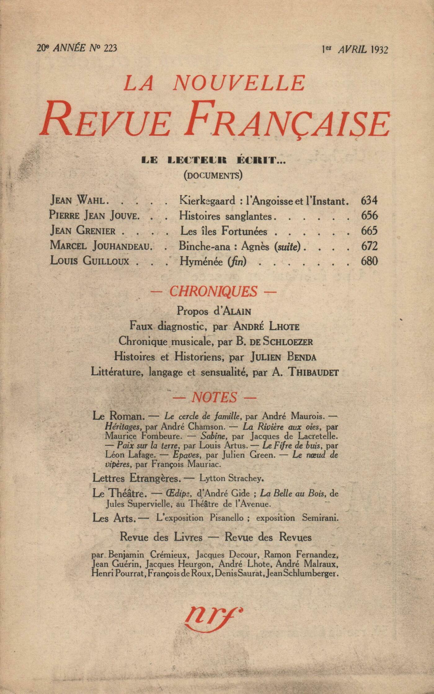 Collectifs, Le lecteur écrit...Jean Wahl, Kierkegaard : l'Angoisse et l'instantPierre Jean Jouve, Histoires sanglantesJean Grenier, Les îles FortunéesMarcel Jouhandeau, Binche-ana : Agnčs (III)Louis Guilloux, Hyménée (Fin) Alain, ProposRéflexions : Albert Thibaudet, Langage, littérature et sensualitéScholies : Julien Benda, Histoire et historiensAndré Lhote, Faux diagnosticBoris de Schlzer, Chronique musicaleNotes : le roman : Ramon Fernandez, Le Cercle de Famille, par André Maurois (Grasset)Denis Saurat, Héritages, par André Chamson (Grasset)Henri Pourrat, La Rivičre aux oies, par Maurice Fombeure (Rieder)François de Roux, Sabine, par Jacques de Lacretelle (Éditions de la N. R. F.)Jean Schlumberger, Paix sur la terre?, par Louis Artus (Grasset)Henri Pourrat, Le Fifre de buis, par Léon Lafage (Grasset)Jacques Decour, Épaves, par Julien Green (Plon)Ramon Fernandez, Le Nud de Vipčres, par François Mauriac (Grasset)Notes : lettres étrangčres : Jacques Heurgon, Lytton StracheyNotes : le théâtre : Benjamin Crémieux, dipe d'André Gide (Théâtre de l'Avenue) - La Belle au Bois, de Jules Supervielle (Théâtre de l'Avenue)Notes : les arts : André Lhote, Pisanello (Bibliothčqie Nationale) et Dessins de Pisanello (Éditions G. Van Oest)André Malraux, Exposition d'uvres de Semirani (Galerie de la N. R. F.)Revue des livres : Jean Guérin, uvre poétique, de Baudelaire (Éditions de la Pléďade) - Théâtre, de Racine (Éditions de la Pléďade) - Romans et contes, de Voltaire (Éditions de la Pléďade)Denis Saurat, Anatole France, par Léon Carias (Rieder)Julien Benda, L'Asie contre l'Europe, par A. F. Legendre (Plon)Marcel Arland, Plaidoyer pour l'inquiétude, par Paul Archambault (Spčs)Denis Saurat, L'enfance perdue et retrouvée, par Lucien Marsaux (Plon) - L'Agonisant, par Henri Deberly (Gallimard) - L'Expérience inutile, par Pierre Chardon (Nouvelle librairie française) - Ŕ l'abandon, par Bernard Nabonne (Rieder) - Goethe en Italie, par Alexandre Hérenger (Victor Attinger)Henri Pourrat, Voyage d'été sous les Tropiques, par Lafcadio Hearn (Mercure de France)Marcel Arland, Les Blaireaux, par Léonide Léonov (Rieder)Benjamin Crémieux, La Brouille, par Charles Vildrac (Émile-Paul)Revue des revues : Jean Guéhenno - Jean Guérin, Le désarmement des intellectuels Anonymes, Le Vaisseau de ThéséeJules Supervielle, Sur Anonymes, MémentoCorrespondance : Paul Petit, Une lettrePierre Jean Jouve, Une lettre