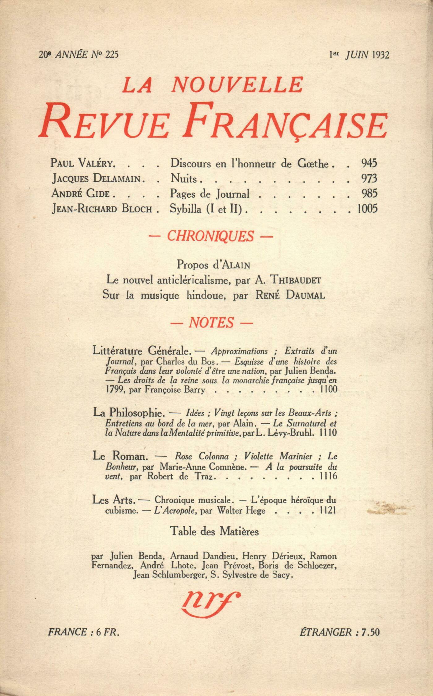 Paul Valéry, Discours en l'honneur de GoetheJacques Delamain, NuitsAndré Gide, Pages de JournalJean-Richard Bloch, Sybilla (I et II) Alain, ProposRéflexions : Albert Thibaudet, Le nouvel anticléricalismeRené Daumal, Sur la musique hindoueNotes : littérature générale : Ramon Fernandez, Approximations (quatričme série), par Charles du Bos (Éditions R.-A. Corręa) - Extraits d'un Journal, par Charles du Bos (Éditions R.-A. Corręa) - Esquisse d'une histoire des Français dans leur volonté d'ętre une nation, par Julien Benda (Éditions de la N. R. F.)Julien Benda, Les droits de la Reine sous la Monarchie française jusqu'en 1789, par Françoise Barry (Éditions Donat-Monchrestien)Notes : la philosophie : Samuel Sylvestre de Sacy, Idées, par Alain (Hartmann) - Vingt leçons sur les Beaux-Arts, par Alain (Éditions de la N. R. F.) - Entretiens au bord de la mer, par Alain (Éditions de la N. R. F.)Arnaud Dandieu, Le surnaturel et la nature dans la mentalité primitive, par Lucien Lévy-Bruhl (Alcan)Notes : le roman : Henry Dérieux, Rose Colonna, par Marie-Anne Comnčne (Éditions de la N. R. F.) - Violette Marinier, par Marie-Anne Comnčne (Éditions de la N. R. F.) - Le Bonheur, par Marie-Anne Comnčne (Éditions de la N. R. F.)Jean Schlumberger, Ŕ la poursuite du vent, par Robert de Traz (Grasset)Notes : les arts : Boris de Schlzer, Chronique musicaleAndré Lhote, L'époque héroďque du cubismeJean Prévost, L'Acropole, par Walter Hege (Lévy)
