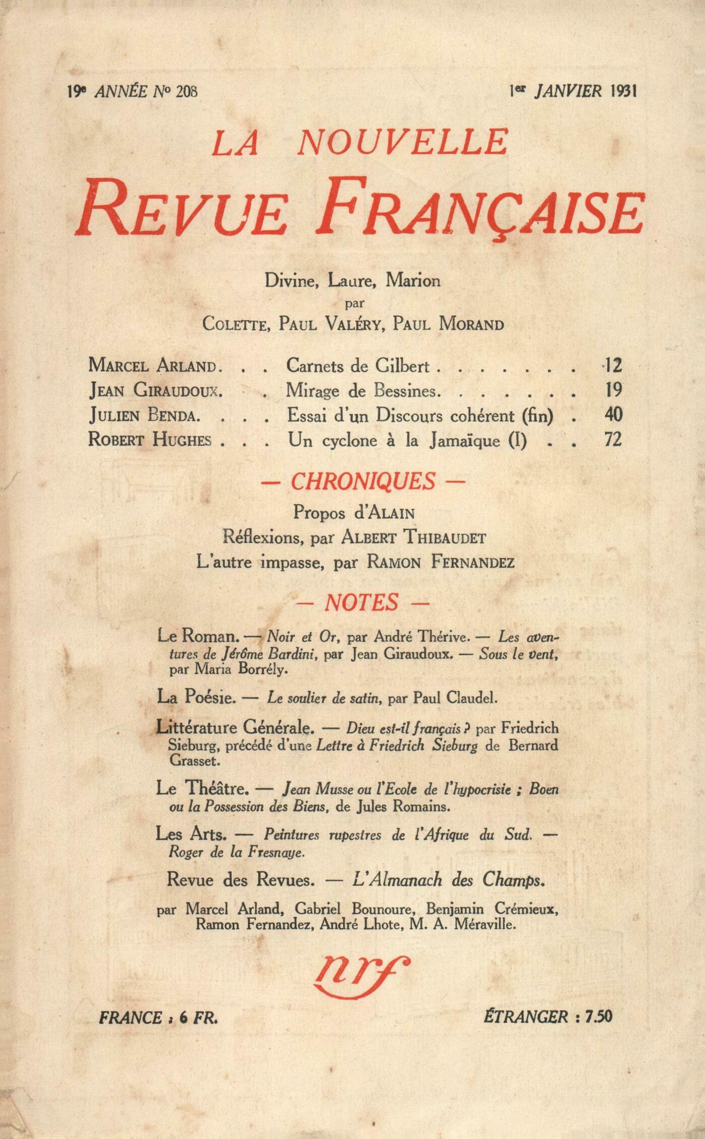 Colette, DivinePaul Valéry, LaurePaul Morand, MarionMarcel Arland, Carnets de GilbertJean Giraudoux, Mirage de BessinesJulien Benda, Essai d'un disocurs cohérent sur les rapports de Dieu et du monde (Fin)Richard Hughes, Un cyclone ŕ la Jamaďque Alain, ProposRéflexions : Albert Thibaudet, Lasserre et nous - Autour de Benjamin ConstantRamon Fernandez, L'autre impasseNotes : romans et récits : Marcel Arland, Noir et Or, par André Thérive (Grasset)Benjamin Crémieux, Aventures de Jérôme Bardini, par Jean Giraudoux (Émile-Paul)Marie-Aimée Méraville, Sous le vent, par Maria Borrély (Éditions de la N. R. F.)Notes : la poésie : Gabriel Bounoure, Le Soulier de Satin, par Paul Claudel (Éditions de la N. R. F.)Notes : littérature générale : Ramon Fernandez, Dieu est-il Français?, par Friedrich Sieburg (Grasset)Notes : le théâtre : Benjamin Crémieux, Jean Musse ou L'École de l'hypocrisie, par Jules Romains (Théâtre de l'Atelier) - Boen ou La possession des biens, par Jules Romains (Théâtre de l'Odéon)Notes : les arts : André Lhote, Les peintures rupestres de l'expédition Leo Frobenius en Afrique du SudMarcel Arland, Roger de La FresnayeLes revues : Jean Guérin, L'Almanach des Champs