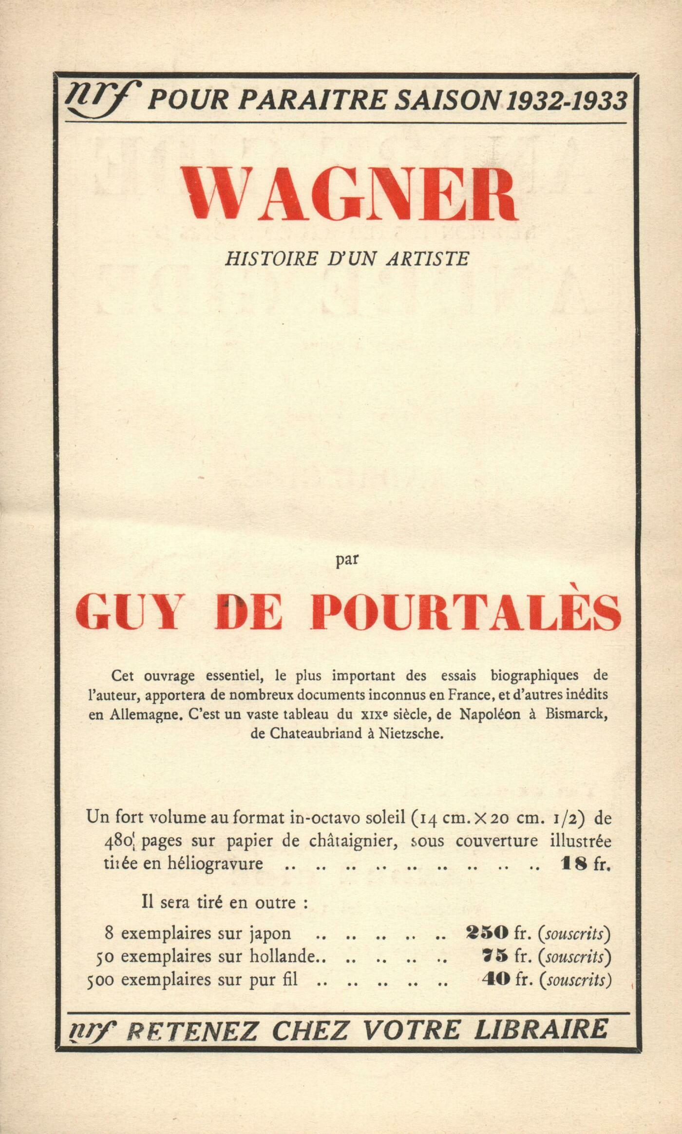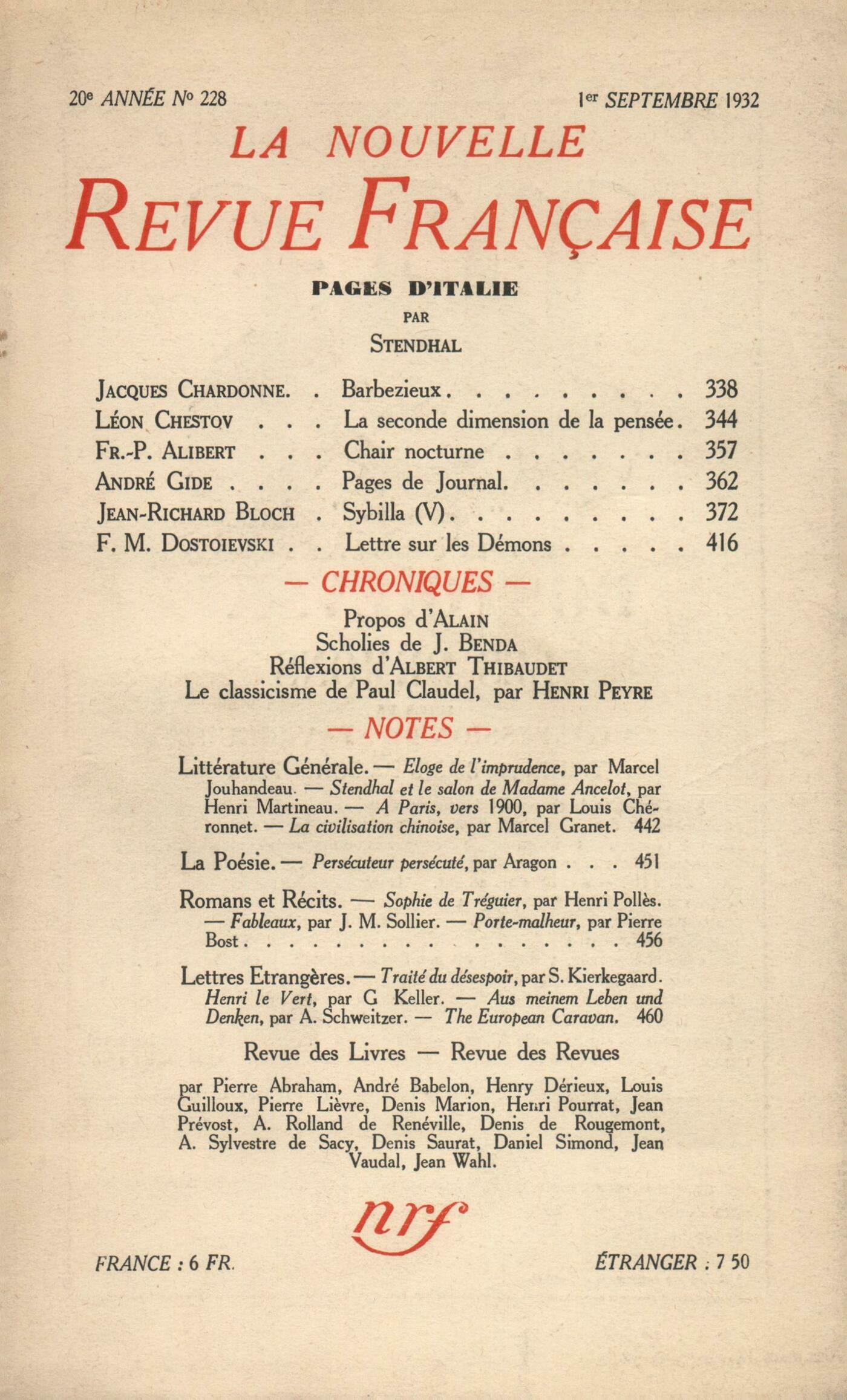Stendhal, Pages d'ItalieJacques Chardonne, BarbezieuxLéon Chestov, La seconde dimension de la penséeFrançois-Paul Alibert, Chair nocturneAndré Gide, Pages de JournalJean-Richard Bloch, Sybilla (V)Fédor Dostoďevski, Lettre sur Les Démons Alain, ProposRéflexions : Albert Thibaudet, La Tradition de JaurčsScholies : Julien Benda, Académie et démocratieHenri Peyre, Le classicisme de Paul ClaudelNotes : littérature générale : Denis de Rougemont, Éloge de l'imprudence, par Marcel Jouhandeau (Les Cahiers du Sud)Pierre Ličvre, Stendhal et le Salon de Madame Ancelot, par Henri Martineau (Le Divan) - Ŕ Paris vers 1900, par Louis Chéronnet (Éditions des Chroniques du Jour)Samuel Sylvestre de Sacy, La civilisation chinoise, par Marcel Granet (Renaissance du Livre)Notes : la poésie : A. Rolland de Renéville, Persécuteur persécuté, par Aragon (Éditions Surréalistes)Notes : le roman : Jean Vaudal, Sophie de Tréguier, par Henri Pollčs (Éditions de la N. R. F.)Jean Prévost, Fableaux, par J. M. Sollier (La Maison des Amis du Livre)Henry Dérieux, Porte-malheur, par Pierre Bost (Éditions de la N. R. F.)Notes : lettres étrangčres : André Babelon, Traité du désespoir, par Soeren Kierkegaard (Éditions de la N. R. F.)Daniel Simond, Henri le Vert, I, par Gottfried Keller (Éditions des Lettres de Lausanne)Jean Wahl, Aus Meinem Leben und Denken, par Albert Schweitzert (Meiner) - The European Caravan, I (Brewer, Warren and Putnam)Notes : le cinéma : Jean Vaudal, Mörder, de Fritz LangRevue des livres : Pierre Abraham, Balzac et le monde des affaires, par Emmanuel Faillettaz (Payot)Denis Saurat, Lettres de Laure Surville de Balzac (Plon)Henry Dérieux, Quartier réservé, par Pierre Mac Orlan (N. R. F.)Jean Vaudal, Les Augures, par Gabriel Audisio (N. R. F.)Denis Marion, Le Trottoir, par Robert Poulet (Denoël et Steele)Henri Pourrat, Terroir, par Jean Gaulmier (Rieder)Denis Marion, Préméditation, par B. [Francis] Iles (Gallimard) - La Clé de verre, par Dashiell Hammett (Gallimard)Henri Pourrat, Safari, par Martin Johnson (Stock)Jean Vaudal, Tour du monde d'un sceptique, par Aldous Huxley (Plon) - Les Bons Compagnons, par J.-B. Priestley (Stock)Denis de Rougemont, Alexandre, par Klaus Mann (Stock)Louis Guilloux, Le Musicien aveugle, par Wladimir Korolenko (Valois)Revue des revues : François Mauriac, Qui triche?Michel Puy, Novateurs et professeursCorrespondance : Rene Huyghe, Lettre ŕ André Lhote