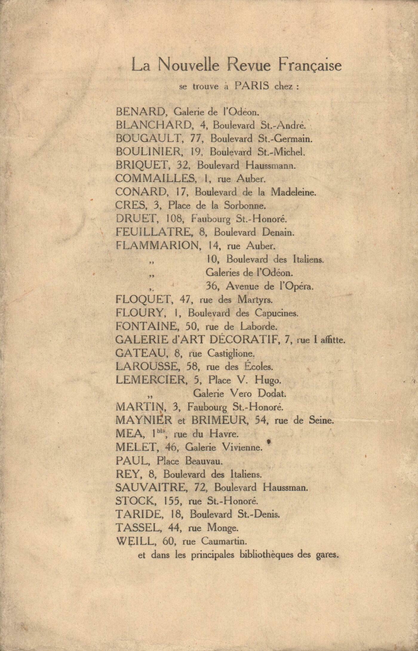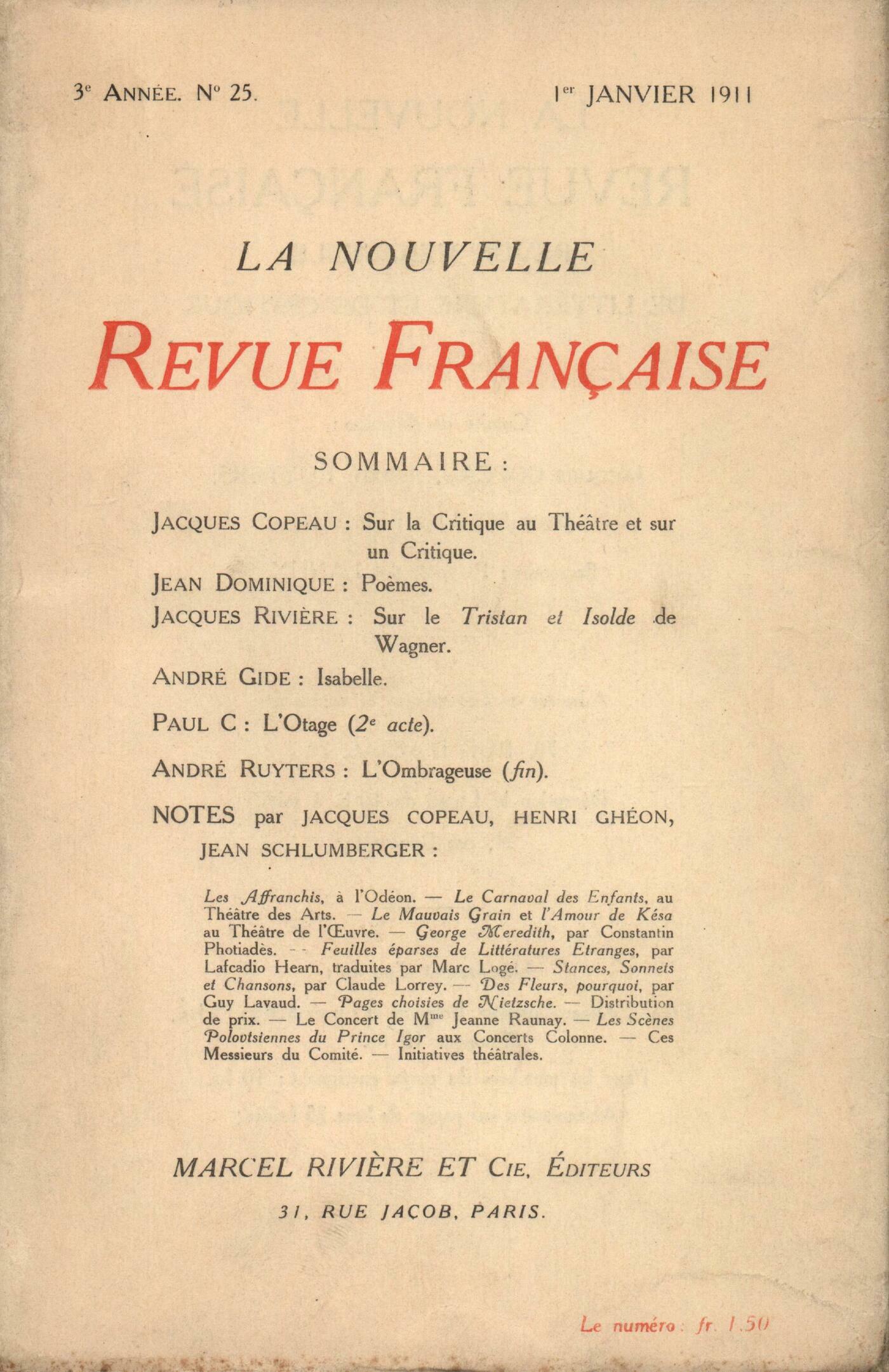 Jacques Copeau, Sur la Critique au Théâtre et sur un CritiqueJean Dominique, PočmesJacques Rivičre, Sur le Tristan et Isolde de Wagner, Isabelle, L'Otage (2e acte)André Ruyters, L'Ombrageuse (fin)Notes : Henri Ghéon, Les Affranchis, par Marie Lenéru (la premičre matinée d'avant-garde au Théâtre de l'Odéon)Jacques Copeau, Le Carnaval des EnfantsHenri Ghéon, Le Mauvais Grain et L'Amour de Késa au Théâtre de l'uvreJean Schlumberger, George Meredith, par Constantin Photiadčs (Armand Colin) - Feuilles éparses de littératures étranges, par Lafcadio Hearn (Mercure de France) - Stances, sonnets et chansons, par Claude Lorrey (Grasset)Henri Ghéon, Des fleurs, pourquoi, par Guy Lavaud (Cornély)Jean Schlumberger, Pages choisies de Nietzsche (Mercure de France)Henri Ghéon, Distribution de prix - Le concert de Mme Jeanne RaunayJacques Rivičre, Les Scčnes Polovtsiennes du Prince Igor, aux Concerts ColonneJacques Copeau, Ces messieurs du Comité Anonymes, Initiatives théâtrales