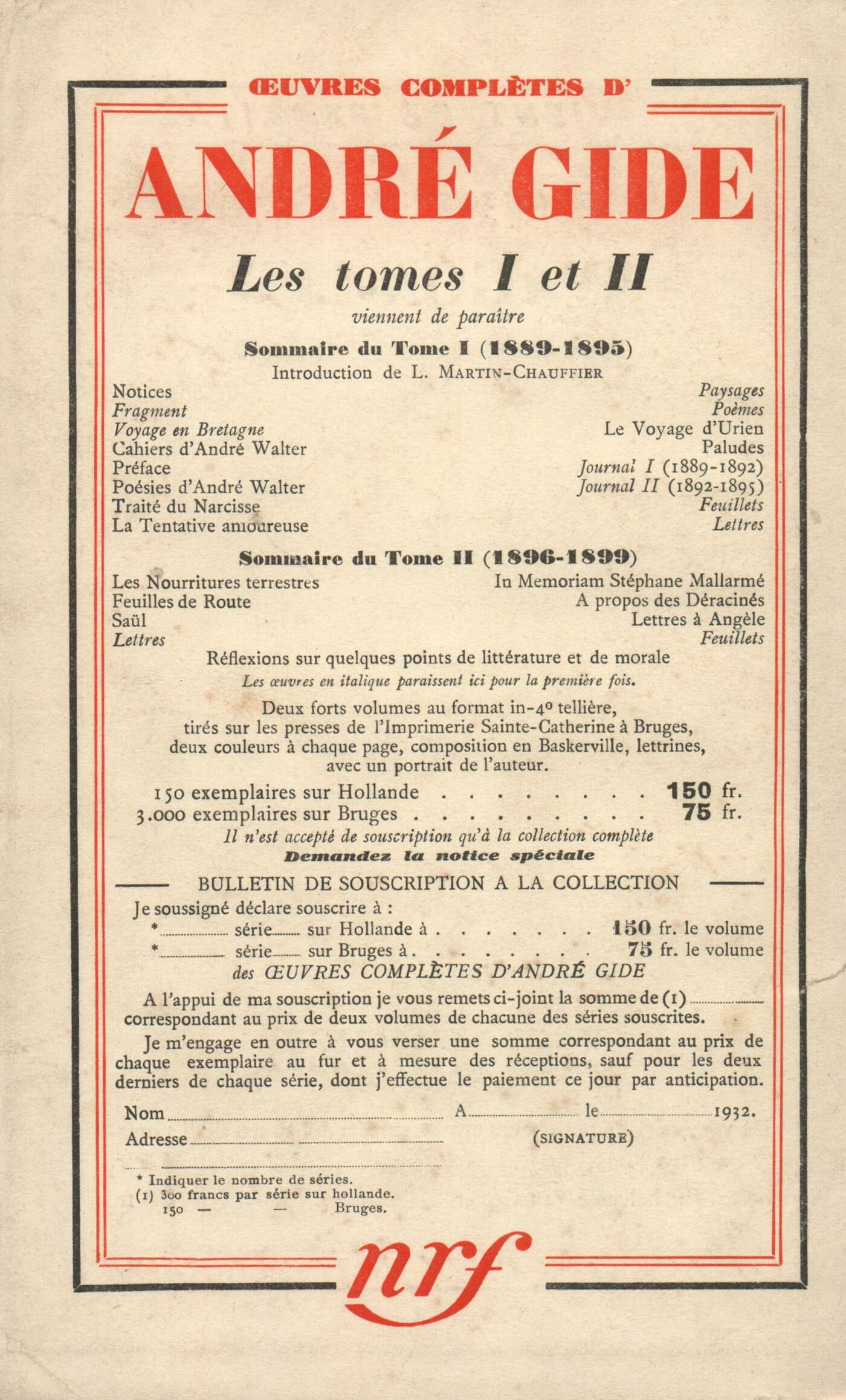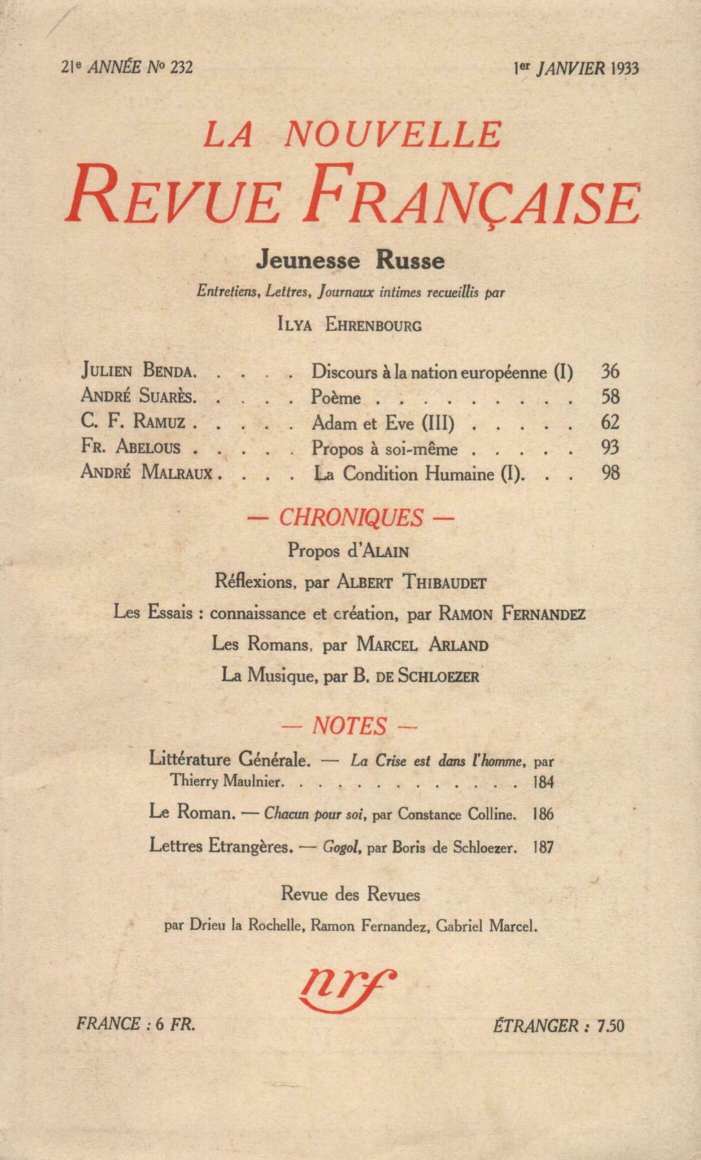 Ilya Ehrenbourg, Jeunesse russe (Entretiens, Lettres, Journaux intimes)Julien Benda, Discours ŕ la nation européenne (I)André Suarčs, PočmeCharles-Ferdinand Ramuz, Adam et Čve (III)Fr. Abelous, Propos ŕ soi-męmeAndré Malraux, La Condition humaine (I) Alain, ProposRéflexions : Albert Thibaudet, La critique de soutienLes essais : Ramon Fernandez, Connaissance et créationChronique des romans : Marcel Arland, Les Hommes de bonne volonté, par Jules Romains - Les Enfants Possédés, par Albert Soulillou - Rougé le braconnier, par René Métayer - La leçon de César, par Georges Roux - Le Marchand de sable, par Élie RabourdinBoris de Schlzer, Chronique musicaleNotes : littérature générale : Ramon Fernandez, La crise est dans l'homme, par Thierry Maulnier (Alexis Redier)Notes : le roman : Pierre Drieu la Rochelle, Chacun pour soi, par Constance Colline (Plon)Notes : lettres étrangčres : Gabriel Marcel, Gogol, par Boris de Schloezer (Plon)Revue des revues : Valery Larbaud, Lectures
