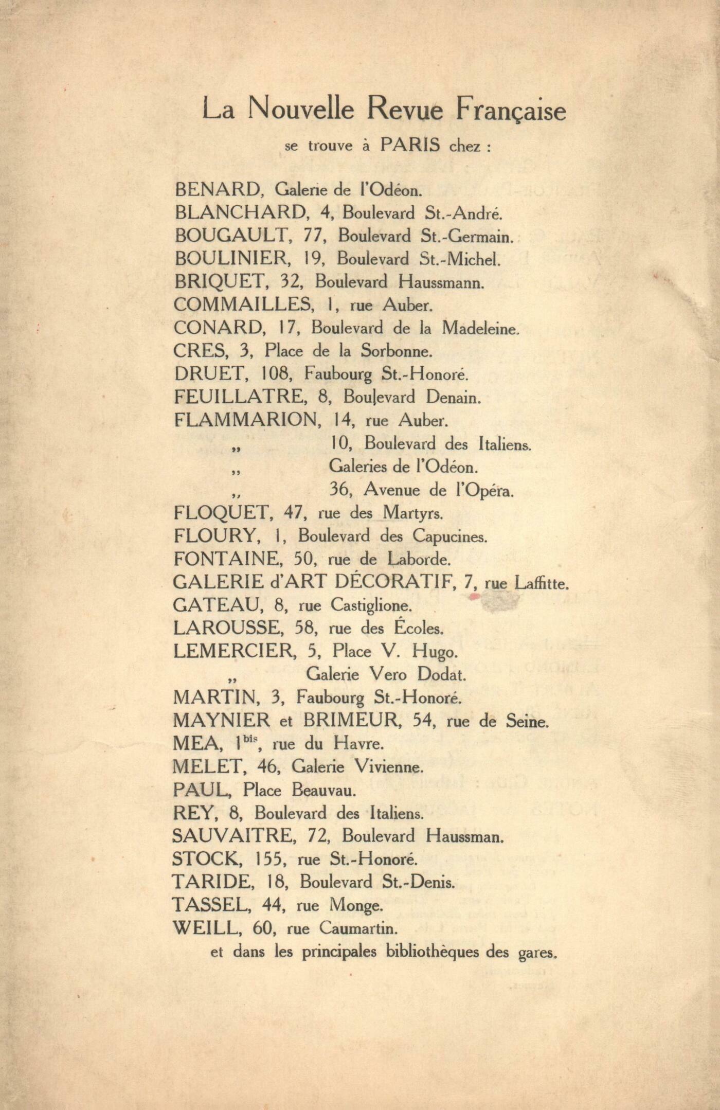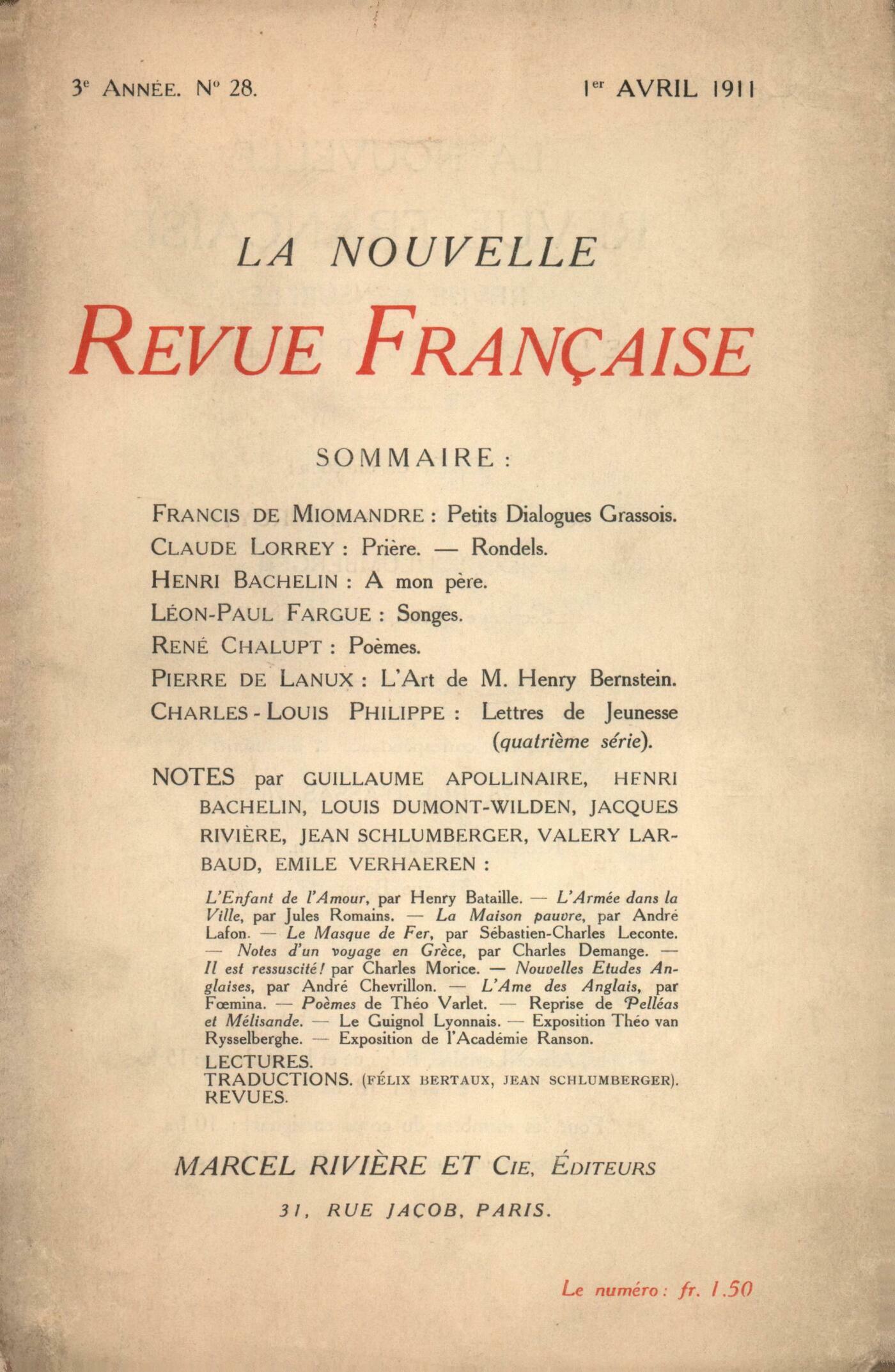 Francis de Miomandre, Petits Dialogues GrassoisClaude Lorrey, PočmesHenri Bachelin, Ŕ mon pčreLéon-Paul Fargue, SongesRené Chalupt, PočmesPierre de Lanux, L'Art de M. Henry BernsteinCharles-Louis Philippe, Lettres de Jeunesse (quatričme série)Notes : Jean Schlumberger, L'Enfant de l'amour, par Henry Bataille (Porte Saint-Martin)Guillaume Apollinaire, L'Armée dans la Ville, par Jules Romains (Odéon)Jean Schlumberger, La Maison pauvre, par André Lafon (Bibliothčque du Temps Présent) - Le Masque de fer, par Sébastien-Charles Leconte (Mercure de France)Louis Dumont-Wilden, Notes d'un voyage en Grčce, par Charles DemangeHenri Bachelin, Il est ressuscité !, par Charles Morice (Messein)Valery Larbaud, Nouvelles études anglaises, par André Chevrillon (Hachette) - L'Âme des Anglais, par Fmina (Grasset)Jacques Rivičre, Reprise de Pelléas et Mélisande (Opéra-Comique)Jean Schlumberger, Le Guignol lyonnais (Théâtre de Monsieur)Émile Verhaeren, Exposition Théo van Rysselberghe (Galerie Druet)Jean Schlumberger, Exposition de l'Académie RansonTraductions : Félix Bertaux, Emile Verhaeren. Ausgewahlte gedichte. Drei Dramen, par Stefan Zweig (Insel-Verlag, Leipzig)Jean Schlumberger, Valet de chambre, par Anton Tchékov (Calmann-Lévy)