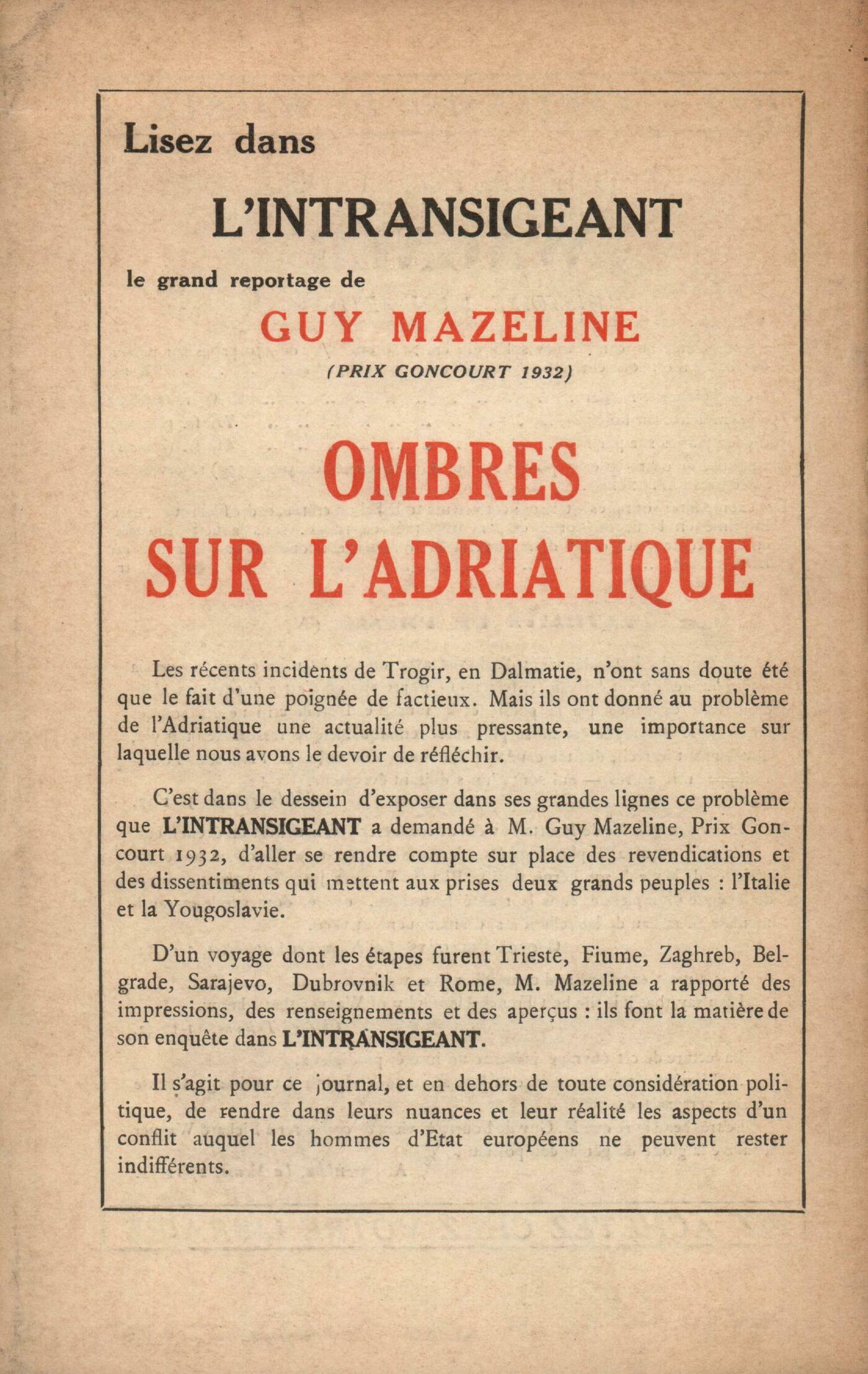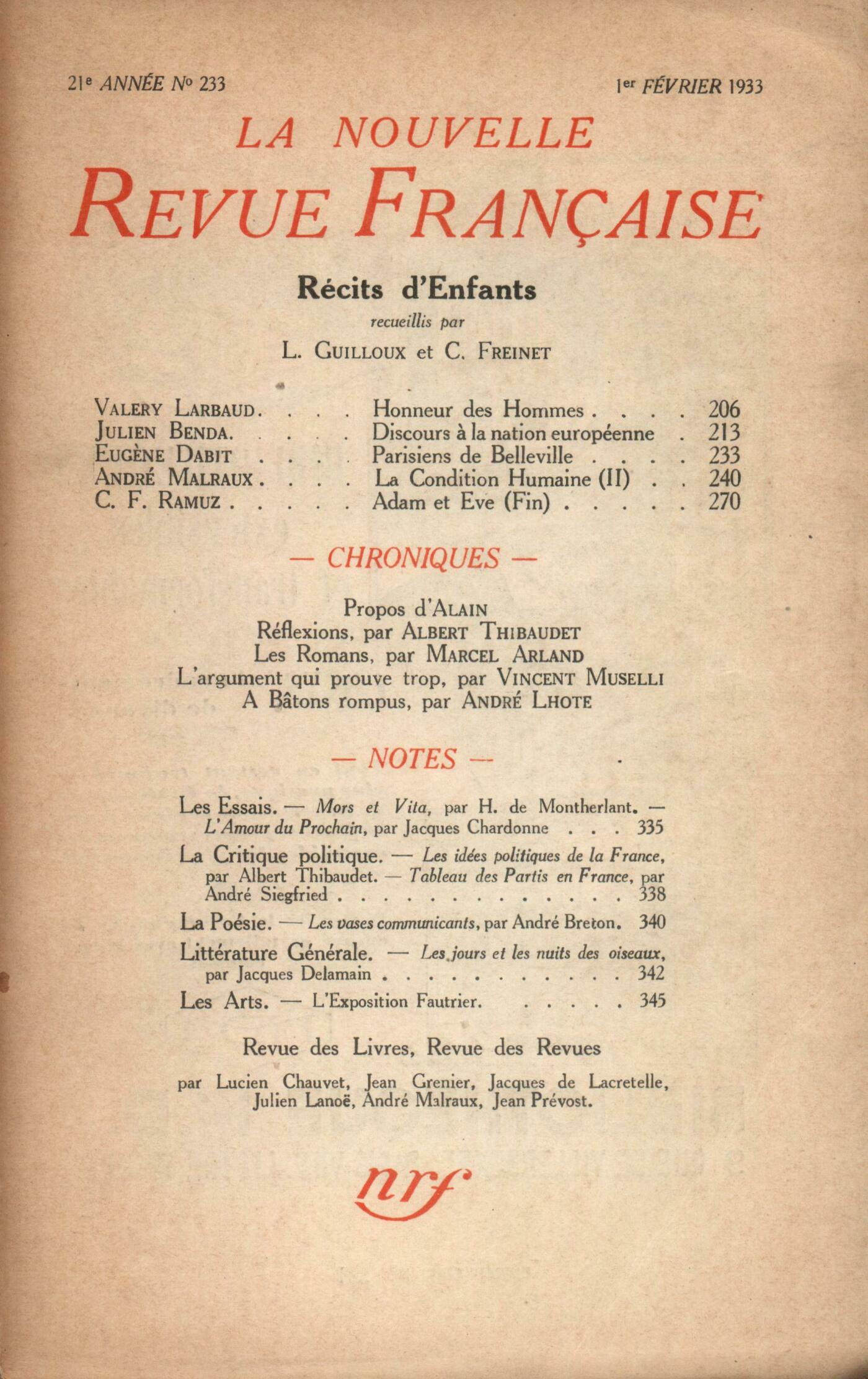 Louis Guilloux - C. Freinet, Récits d'enfantsValery Larbaud, Honneur des HommesJulien Benda, Discours ŕ la nation européenne (II)Eugčne Dabit, Parisiens de BellevilleAndré Malraux, La Condition humaine (II)Charles-Ferdinand Ramuz, Adam et Čve (Fin) Alain, ProposRéflexions : Albert Thibaudet, Vingtičme sičcle - Le maurrasismeChronique des romans : Marcel Arland, Anna, par André Thérive - Paul et Virginie, par Bernardin de Saint-Pierre - Le Portrait du Pčre, par Jean VaudalVincent Muselli, De l'argument qui prouve trop et qui, partant, ne prouve rienLes arts : André Lhote, A bâtons rompusNotes : les essais : Jean Grenier, Mors et Vita, par Henry de Montherlant (Grasset)Jacques de Lacretelle, L'amour du prochain, par Jacques Chardonne (Grasset)Notes : la critique politique : Jean Prévost, Les idées politiques de la France, par Albert Thibaudet (Stock) - Tableau des partis en France, par André Siegfried (Grasset)Notes : la poésie : Julien Lanoë, Les vases communicants, par André Breton (Éditions des Cahiers Libres)Notes : littérature générale : Lucien Chauvet, Les jours et les nuits des oiseaux, par Jacques Delamain (Stock)Notes : les arts : André Malraux, Exposition Fautrier (Galerie de la Nouvelle Revue Française)Revue des livres : Denis Saurat, uvres, II, de Charles Baudelaire (La Pléiade)Marcel Caster, Propos de table de Martin Luther (Éditions Montaigne)Denis Saurat, Introduction ŕ une maničre de sentir, par Pius Servien (Boivin)Henri Pourrat, D'homme ŕ homme, par Luc Durtain (Flammarion)Denis Saurat, Aventures de mer, par Henry de Monfreid (Grasset) - Isola, par Rose Celli (Gallimard) - Le voleur d'étincelles, par Robert Brasillach (Alexis Redier) - L'Adieu, par Georges Friedmann (Gallimard) - Histoire d'une jeune femme, par Lucien Marsaux (Alexis Redier)Revue des revues : René Daumal, Ŕ la NéanteHenri Gouhier, Recherches philosophiques Anonymes, Mémento des revues