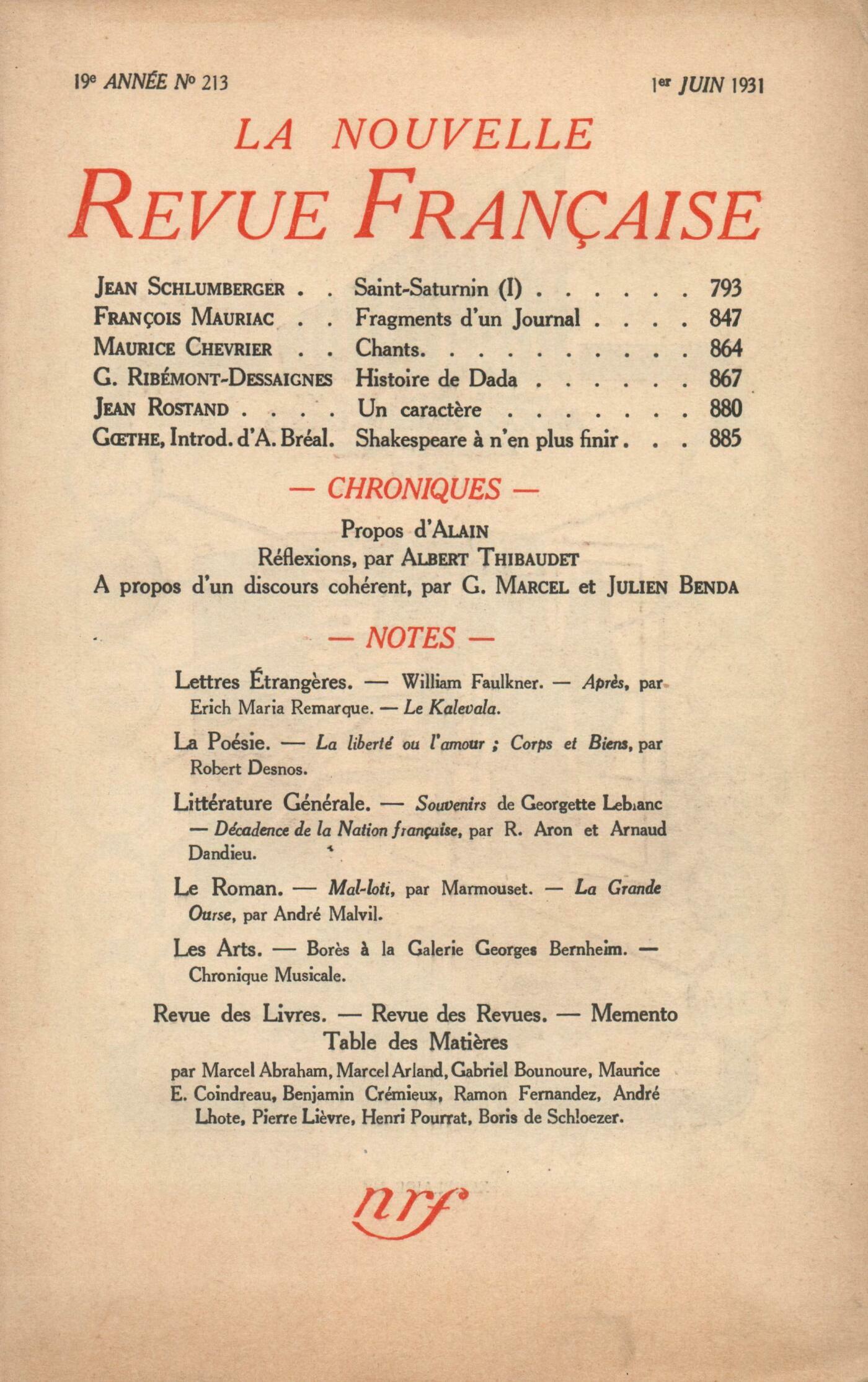 Jean Schlumberger, Saint-Saturnin (I)François Mauriac, Fragments d'un JournalMaurice Chevrier, ChantsGeorges Ribemont-Dessaignes, Histoire de DadaJean Rostand, Un caractčreJohann Wolfgang von Goethe, Shakspeare [sic] ŕ n'en pas finir Alain, ProposRéflexions : Albert Thibaudet, Autour de DrumontGabriel Marcel, Remarques sur l'Essai d'un discours cohérent...Julien Benda, Réponse ŕ Gabriel Marcel ŕ propos de l'Essai sur un discours cohérent...Notes : lettres étrangčres : Maurice-Edgar Coindreau, William FaulknerBenjamin Crémieux, Aprčs..., par Erich Maria Remarque (Éditions de la N. R. F.)Henri Pourrat, Le Kalevala, par Élias Lönnrot (Stock)Notes : la poésie : Gabriel Bounoure, La Liberté ou l'Amour, par Robert Desnos (Kra) - Corps et Biens, par Robert Desnos (Éditions de la N. R. F.)Notes : littérature générale : Pierre Ličvre, Souvenirs, par Georgette Leblanc (Grasset)Ramon Fernandez, Décadence de la nation française par Robert Aron et Arnaud Dandieu (Rieder)Notes : le roman : Pierre Ličvre, Mal-Loti, par Marmouset (Éditions de la N. R. F.)Marcel Arland, La Grande Ourse, par André Malvil (Éditions de la N. R. F.)Notes : les arts : André Lhote, Borčs (Galerie Georges Bernheim)Boris de Schlzer, Chronique musicaleRevue des livres : Ramon Fernandez, Les Bâtisseurs de l'Europe moderne, par le comte Sforza (N. R. F.)Henri Pourrat, Benjamin Franklin, par Bernard Fa˙ (Calmann-Lévy)Ramon Fernandez, La Rechute, par Paul Bourget (Plon)Henri Pourrat, Monsieur Terral, par Charles Silvestre (Plon) - La Paix, par Ernst Glaeser (Rieder) - La Saga de l'Élan, par André Haukland (Stock) - Études bouddhistes et Ręveries exotiques, par Lafcadio Hearn (Mercure de France) - Fantômes japonais, par Lafcadio Hearn (Piazza)Revue des revues : Jean Guérin, Curiosités Anonymes, MémentoCorrespondance : André Gide, Une lettre [ŕ propos d'une lettre sur Dostoďewsky]