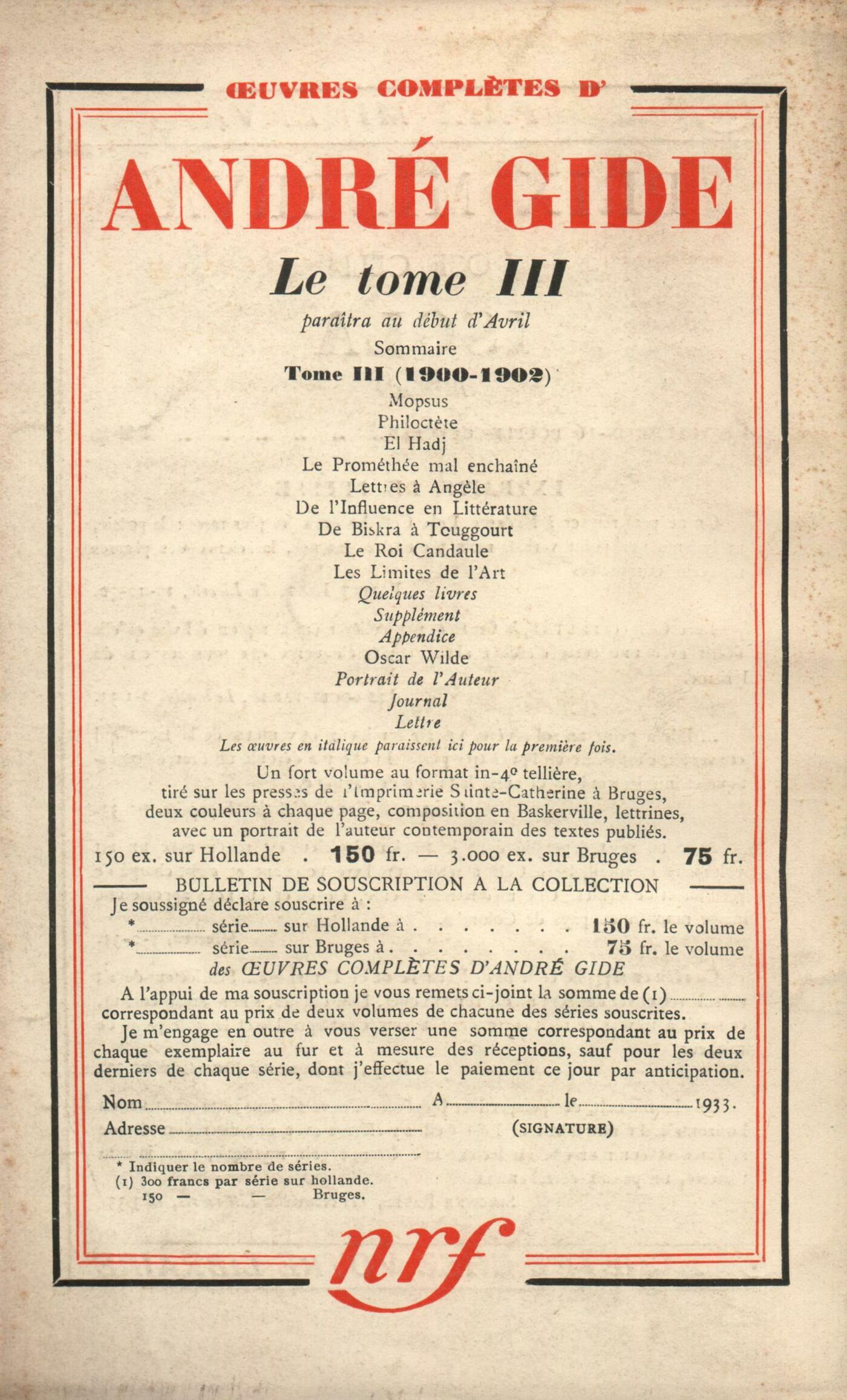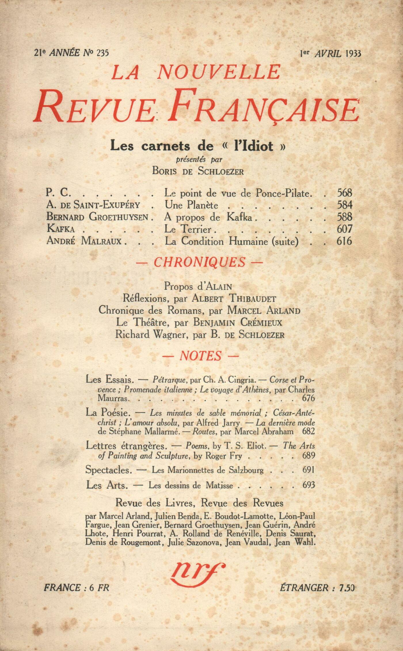 Boris de Schlzer - Fédor Dostoďevski, Les carnets de L'IdiotPaul Claudel, Le point de vue de Ponce PilateAntoine de Saint-Exupéry, Une PlančteBernard Groethuysen, Ŕ propos de KafkaFranz Kafka, Le TerrierAndré Malraux, La Condition humaine (IV) Alain, ProposRéflexions : Marcel Arland, Portrait français de MontaigneChronique des romans : Marcel Arland, Sur le roman - Les Fiançailles, par Jacques de Lacretelle - Le Mémorial secret, par Guillaume GaulčneBenjamin Crémieux, L'anti-réalisme au théâtreBoris de Schlzer, Richard WagnerNotes : littérature générale : Denis de Rougemont, Pétrarque, par Charles Albert Cingria (Les Cahiers Romands)Jean Grenier, Corse et Provence, par Charles Maurras (Flammarion) - Promenade italienne, par Charles Maurras (Flammarion) - Le Voyage d'Athčnes, par Charles Maurras (Flammarion)Notes : la poésie : A. Rolland de Renéville, Les Minutes de sable mémorial, par Alfred Jarry (Fasquelle) - L'Amour Absolu, d'Alfred Jarry (Les Marges) - La derničre Mode, par Stéphane Mallarmé (Publications of the Institute of French Studies)Léon-Paul Fargue, Routes, par Marcel Abraham (Les Terrasses de Lourmarin)Notes : lettres étrangčres : Jean Wahl, Poems 1909-1925, by T. S. Eliot (Faber and Faber)Bernard Groethuysen, The Arts of painting and sculpture, by Roger Fry (Victor Gollancz)Notes : les spectacles : Julie Sazonova, Les marionnettes de SalzbourgNotes : les arts : André Lhote, Dessins de Matisse (Galerie Pierre Colle)Revue des livres : Julien Benda, Saint François de Sales, Introduction ŕ la vie dévote, par Fabius Henrion (Mame)Jean Guérin, Correspondance, de Benjamin Constant et d'Anna Lindsay (Plon)Emmanuel Boudot-Lamotte, Paul Lecčne, par Henri Mondor (Masson)Jean Guérin, La Tourmente, par Fred Bérence (Rieder) - Le Ressac, par Maurice Betz (Émile-Paul) - Au large de l'Éden, par Roger Vercel (Albin Michel)Denis Saurat, Le roman des Quatre Jours, par Pierre Jeanneret (Alexis Redier)Jean Guérin, Comme un vol d'oiseau, par Kathleen Coyle (Plon)Denis Saurat, Les Trois Surs, par May Sinclair (Alexis Redier)Jean Guérin, Le meilleur des mondes, par Aldous Huxley (Plon)Henri Pourrat, Roses, Curs, Châteaux, par A.-P. Herbert (Plon)Revue des revues : André Gide, Le communisme et le problčme de la guerreJean Guérin, ŤTransitionť Anonymes, Mémento - ŤLe Phare de Neuilly publiera dorénavant, dans chacun de ses numéros...ť - Pour un Tableau de la Poésie en France