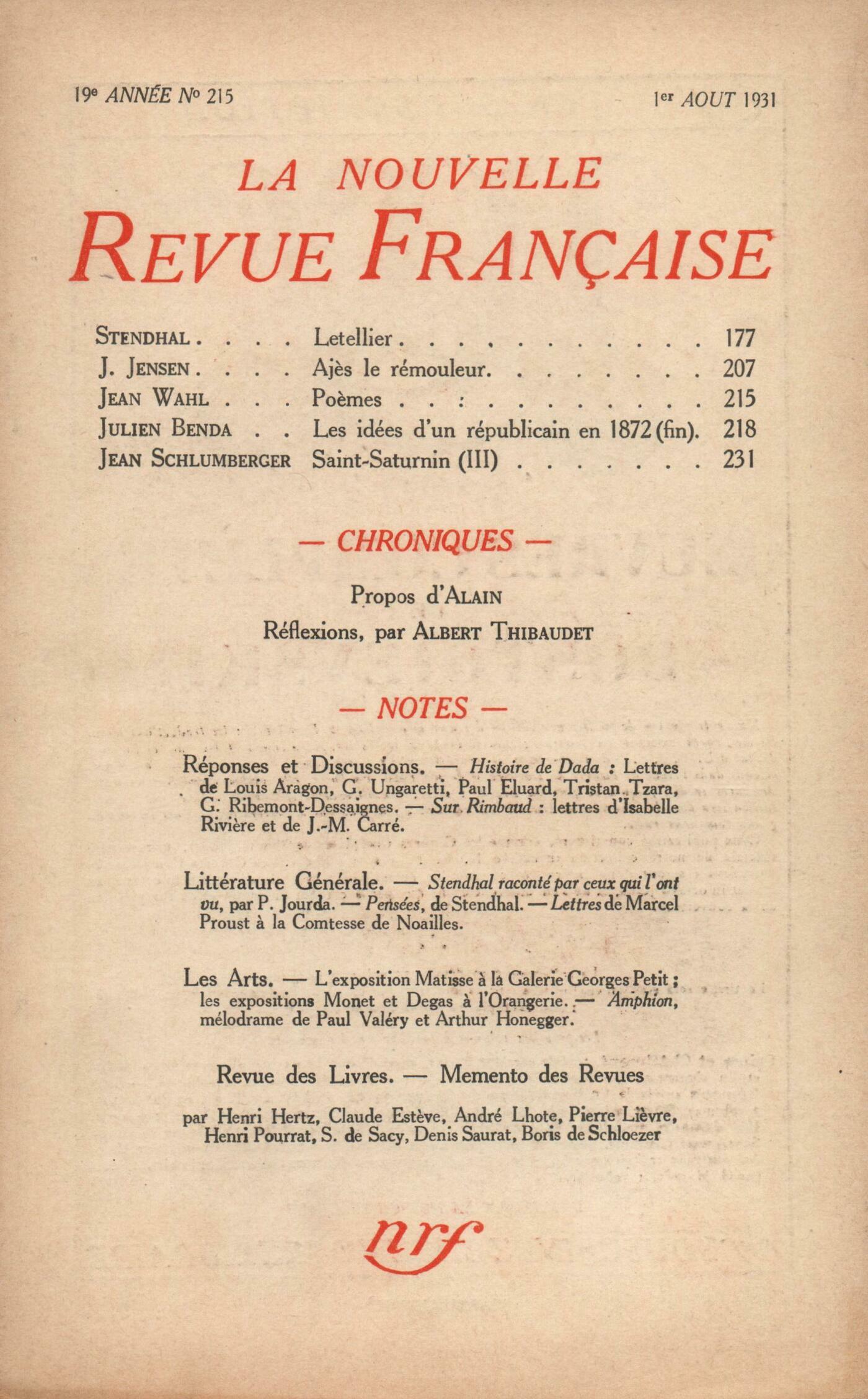 Stendhal, LetellierJohannes V. Jensen, Ajčs le rémouleurJean Wahl, PočmesJulien Benda, Les idées d'un Républicain en 1872 (Fin)Jean Schlumberger, Saint-Saturnin (III) Alain, ProposRéflexions : Albert Thibaudet, D'Alexis de Tocqueville ŕ Daniel HalévyNotes et discussions : Collectifs, Histoire de Dada : lettres de Louis Aragon, Giuseppe Ungaretti, Paul Éluard, Tristan Tzara et Georges Ribemont-Dessaignes - Rimbaud et ses critiques : lettre de Jean-Marie Carré, Isabelle Rivičre et A. Rolland de RenévilleNotes : littérature générale : Samuel Sylvestre de Sacy, Stendhal raconté par ceux qui l'ont vu (Stock)Pierre Ličvre, Pensées, par Stendhal (Le Divan)Denis Saurat, Lettres de Marcel Proust ŕ la Comtesse de Noailles (Plon)Notes : les arts : André Lhote, Matisse (Galerie Petit) - Monet, Degas (Orangerie)Boris de Schlzer, Amphion, de Paul Valéry et Arthur Honegger (Opéra)Revue des livres : Henri Pourrat, Entretiens sur J.-K. Huysmans, par Frédéric Lefčvre (Horizons de France) - L'époque réaliste, par Édouard Maynial (Les uvres Représentatives) - La Mčre, par Henriette Charasson (Nouvelle Société d'Édition) - Le Vert Galant, par Joseph Delteil (Éd. des Portiques)Henri Hertz, Chapeau Chinois, par Noël Bureau (chez l'auteur)Henri Pourrat, L'Homme aux Sangliers, par Charles-Henry Hirsch (Éd. des Portiques)Claude Estčve, L'Homme ŕ la Poupée, par Pierre et Maria Sire (Lemerre) Anonymes, Mémento des revues