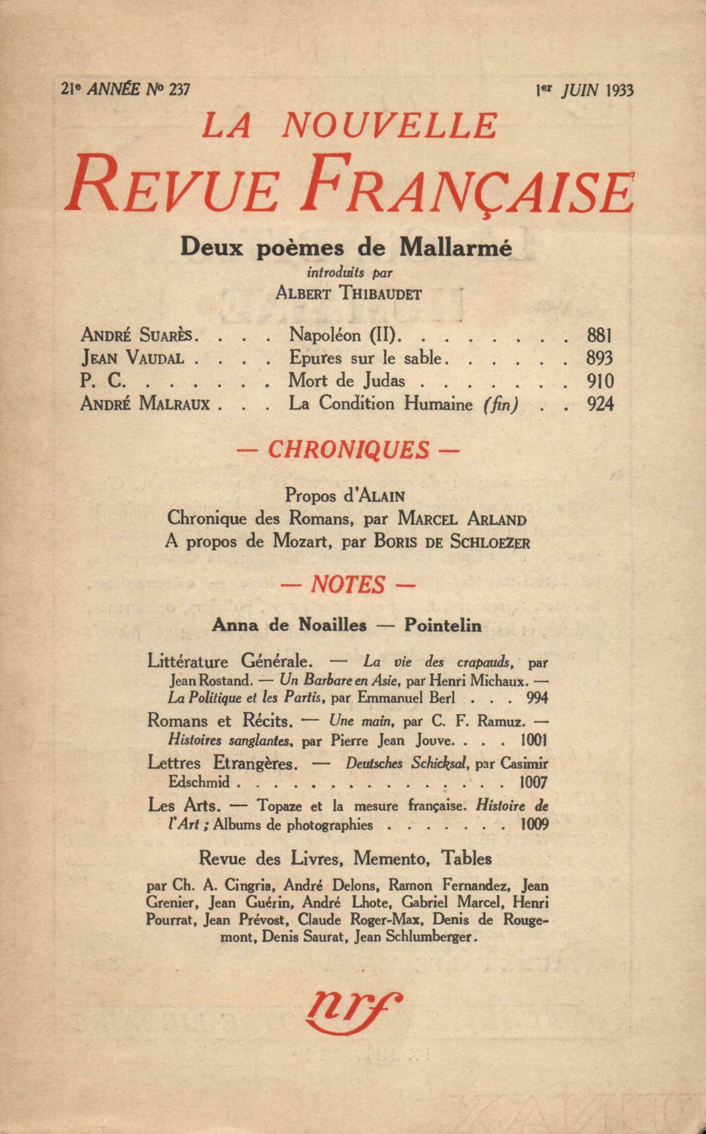 Albert Thibaudet, Ŕ l'ombre des Contemplations : Baudelaire et MallarméStéphane Mallarmé, Sa fosse est creusée !... - Sa tombe est ferméeAndré Suarčs, Vues sur Napoléon (II)Jean Vaudal, Épures sur le sablePaul Claudel, Mort de JudasAndré Malraux, La Condition humaine (Fin) Alain, ProposChronique des romans : Marcel Arland, Drôle de voyage, par Pierre Drieu la Rochelle - L'auberge de l'abîme, par André Chamson - Ŕ propos de Vieille FranceBoris de Schlzer, Ŕ propos de MozartJean Schlumberger, La comtesse de NoaillesClaude Roger-Marx, Auguste PointelinNotes : littérature générale : Charles-Albert Cingria, La vie des crapauds, par Jean Rostand (Stock)Ramon Fernandez, La politique et les partis, par Emmanuel Berl (Rieder)Jean Grenier, Un barbare en Asie, par Henri Michaux (Éditions de la N. R. F.)Notes : romans et récits : Denis de Rougemont, Une main, par C. F. Ramuz (Grasset)Andre Delons, Histoires sanglantes, de Pierre Jean Jouve (Éditions de la N. R. F.)Notes : lettres étrangčres : Gabriel Marcel, Deutsches Schicksal, par Kasimir Edschmid (Zsolnai)Notes : les arts : André Lhote, Topaze et la mesure françaiseJean Prévost, Histoire de l'art des origines ŕ nos jours, I (Larousse) - En Grčce, par Antoine Bon et Fernand Chapouthier (Hartmann) - Notre-Dame de Paris Le plafond de la Sixtine Sculptures de Michel-Ange (Éditions Tel)Revue des livres : Jean Guérin, La main tendue, par Philippe Hériat (Denoël et Steele) - Folle qui s'ennuie, par Robert Vivier (Rieder)Denis Saurat, Les dames de velours, par Jacques Spitz (Gallimard) - Message aux traîtres, par Graal (Le Rouge et le Noir) - Le pasteur des tribus, par Alexandre Sytine (Gallimard)Jean Guérin, Mon ami le pluvier, par Bengt Berg (Stock) - Catherine-soldat, par Adrienne Thomas (Stock)Henri Pourrat, Cola s'en va-t-en guerre, par Mario Puccini (Fayard)Jean Guérin, Station 3, par Ernst Johansen (Flammarion) Anonymes, Mémento des revuesMarie Dormoy, La Bibliothčque Doucet