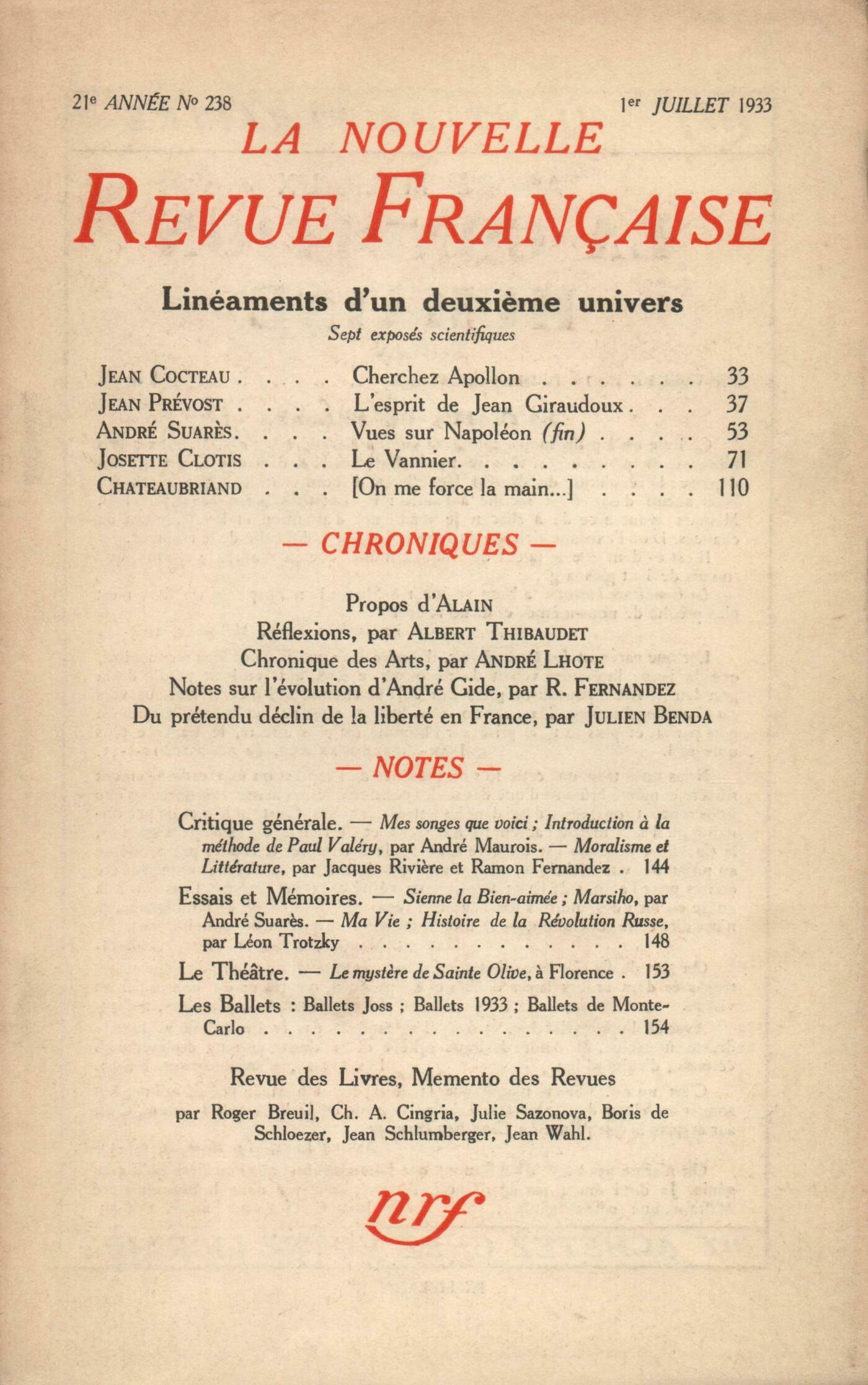 Linéaments d'un deuxičme univers : Irčne Joliot-Curie - Frédéric Joliot-Curie, Le noyau des atomes et le neutronG. Champetier, La détermination de la structure des molécules ŕ l'aide des rayons XPierre Girard, Les plus grands champs centrifugesLucien Plantefol, L'hétérogénéité de la matičre vivante et la physiologieF. Holweck, Nouvelle théorie de l'action biologique des radiationsJean Cocteau, Cherchez ApollonJean Prévost, L'esprit de Jean GiraudouxAndré Suarčs, Vues sur Napoléon (Fin)Josette Clotis, Le Vannier Alain, ProposRéflexions : Albert Thibaudet, Une voix de la Nation européenneChronique des arts : André Lhote, De 1900 au baroquisme - Chassériau et l'inquiétude moderneLes essais : Ramon Fernandez, Notes sur l'évolution d'André GideScholies : Julien Benda, Du prétendu déclin de la liberté en France - Une équivoque sur la Souveraineté nationale - Décadence du mécontentementNotes : critique générale : Jean Schlumberger, Mes songes que voici, par André Maurois (Grasset) - Introduction ŕ la méthode de Paul Valéry, par André Maurois (Éditions des Cahiers Libres)Roger Breuil, Moralisme et littérature, par Jacques Rivičre et Ramon Fernandez (Corréa)Notes : essais et mémoire : Charles-Albert Cingria, Sienne la bien-aimée, par André Suarčs (Émile-Paul) - Marsiho, par André Suarčs (Grasset) - Ma vie, par Léon Trotzky (Rieder) - Histoire de la révolution russe, par Léon Trotzky (Rieder)Notes : le théâtre : Boris de Schlzer, Le Mystčre de Sainte Olive (mis en scčne par Jacques Copeau)Julie Sazonova, La Saison chorégraphique : Ballets Joss, Ballets 1933, Ballets de Monte-CarloRevue des livres : Jean Guérin, Le fils indigne, par Henri Deberly (N. R. F.) - Fort-de-France, par Pierre Benoît (Albin Michel) - Sous les verrous, par Édouard de Nčve (Stock)Denis Marion, Rien ŕ faire, par Jack Black (Gallimard)Henri Pourrat, Tobie et l'Ange, par Stella Benson (Plon) Anonymes, Mémento des revues