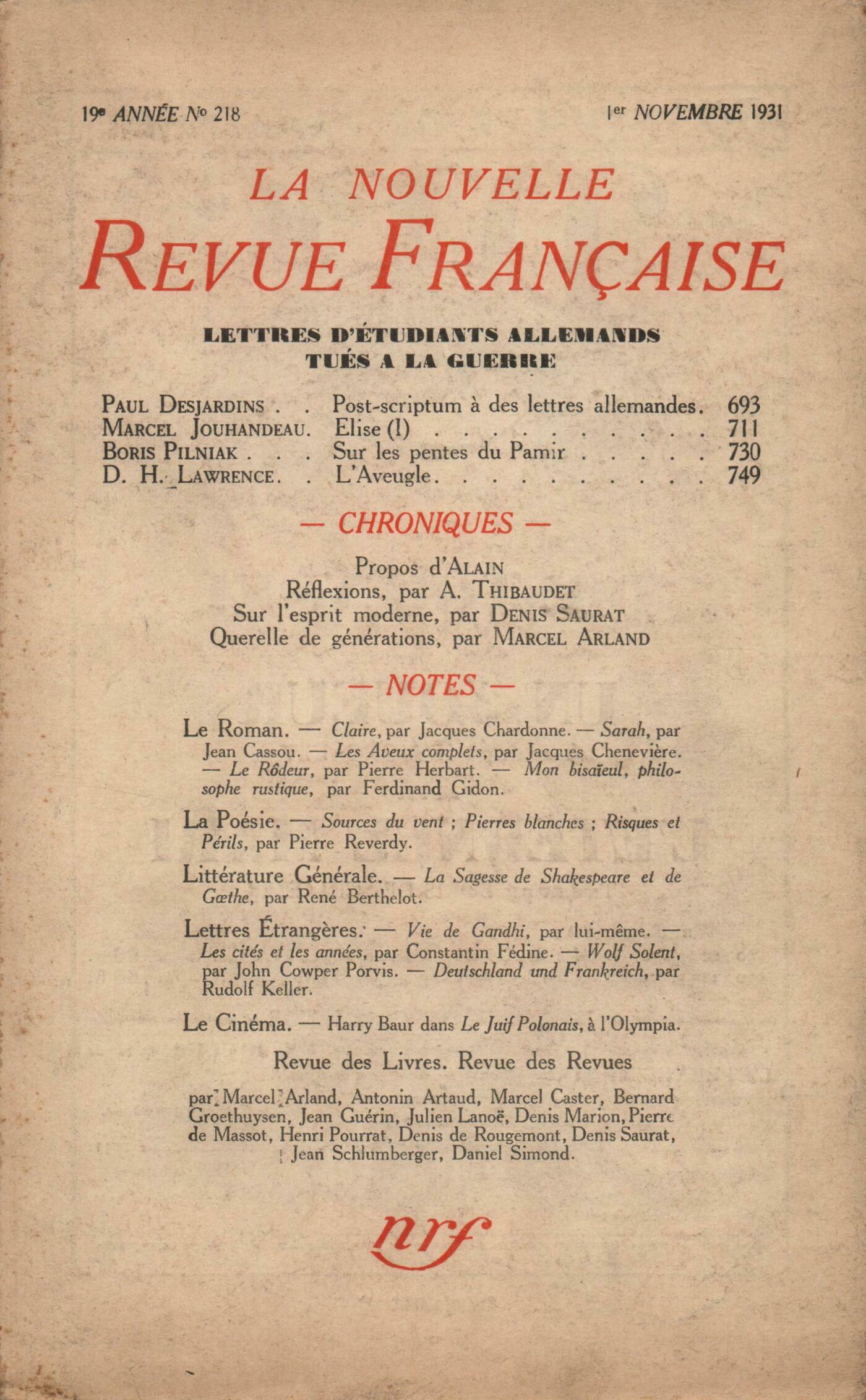 E. Herrmann, Lettres d'étudiants allemands tués ŕ la guerrePaul Desjardins, Post-scriptum français daté de 1931 ŕ des lettres allemandes datées de 1915Marcel Jouhandeau, Élise (I)Boris Pilniak, Sur les pentes du PamirD.H. Lawrence, L'Aveugle Alain, ProposRéflexions : Albert Thibaudet, L'Histoire dans l'HistoireMarcel Arland, Querelle de générationsDenis Saurat, L'aprčs-guerre : le style ŤmoderneťNotes : le roman : Marcel Arland, Claire, par Jacques Chardonne (Grasset)Denis de Rougemont, Sarah, par Jean Cassou (Corręa)Benjamin Crémieux, Le Septičme Jour, par René Trintzius (Éditions de la N. R. F.)Henri Pourrat, Les Aveux complets, par Jacques Chenevičre (Calmann-Lévy)Pierre de Massot, Le Rôdeur, par Pierre Herbart (Éditions de la N. R. F.)Bernard Groethuysen, Mon bisaďeul, philosophe rustique, par Ferdinand Gidon (Au Sans Pareil)Notes : la poésie : Julien Lanoë, Sources du vent, par Pierre Reverdy (Collection des Écrivains Audois) - Pierre blanches, par Pierre Reverdy (Collection des Écrivains Audois) - Risques et périls, par Pierre Reverdy (Éditions de la N. R. F.)Notes : littérature générale : Daniel Simond, La Sagesse de Shakespeare et de Goethe, par René Berthelot (Éditions de la N. R. F.)Notes : lettres étrangčres : Marcel Caster, Vie de M. K. Gandhi écrite par lui-męme (Rieder)Denis Marion, Les cités et les années, par Constantin Fedine (Éditions de la N; R. F.)Jean Wahl, Wolf Solent, par John Cowper Powis (Payot)Jean Schlumberger, Deutschland und Frankreich, par Rudolf Keller (Piper)Notes : le cinéma : Antonin Artaud, Le Juif Polonais (Olympia)Revue des livres : Denis Saurat, Le Vaurien, par Marcel Aymé (N. R. F.)Jean Guérin, Le Paradis des Amants, par Lucien Fabre (N. R. F.) - La Nouvelle Eurydice, par Marguerite Yourcenar (Grasset)Denis Saurat, Passage de la Folie, par Louis Émié (Cahiers du Sud) - Fortune des airs, par A. Dubois la Chartre (N. R. F.) - Pour une dame qui se croyait vivante, par Denise Cools (Tambourin)Jean Guérin, L'Homme approximatif, par Tristan Tzara (Fourcade) - César Borgia, par Paul Rival (Grasset)Denis Marion, 1932. La Guerre, par le général LudendorffBenjamin Crémieux, Tu sera soldat, par Jacques Marcireau (Les Revues)Maurice Courtois-Suffit, La Révolution espagnole, par André Germain (Grasset)Denis Saurat, Hearst, par J. K. Winkler (N. R. F.) - L'autre Amérique, par Madeleine Cazamian (Champion)Benjamin Crémieux, Venti Lettere, par Ugo Ojetti (Tręves)Jean Guérin, Golovine, par J. Wassermann (Stock)Denis Saurat, Au bout du rouleau, par Joseph Conrad (N. R. F.) - Les Pierres vivantes, par Venceslas Berent (N. R. F.)Benjamin Crémieux, Oton Joupantchitch, par Lucien Tesničres (Les Belles Lettres)Les revues : Léon Daudet, André GideLouis Gillet, James JoyceCorrespondance : Ernst Robert Curtius - Jacques Rivičre, Sur Rimbaud