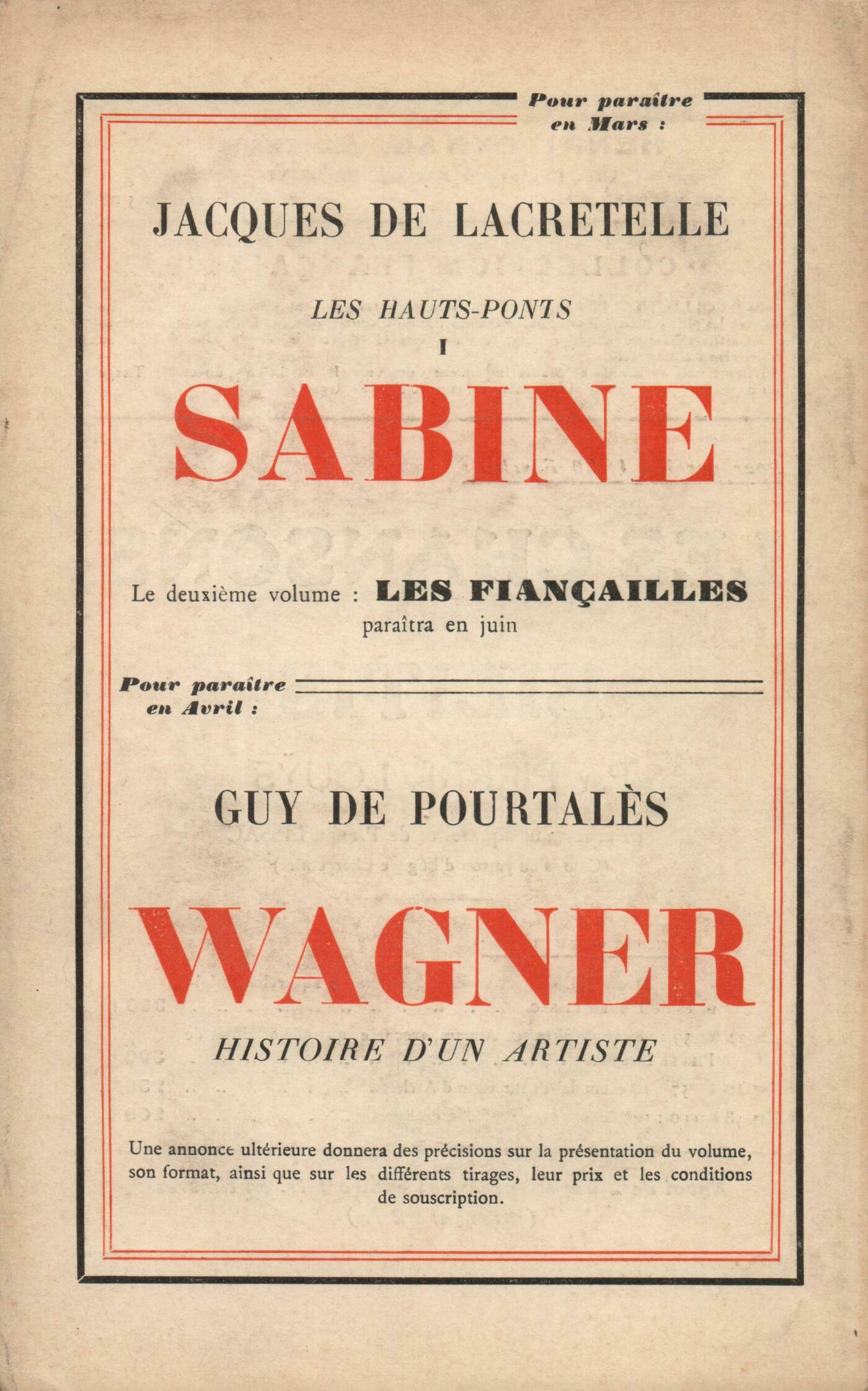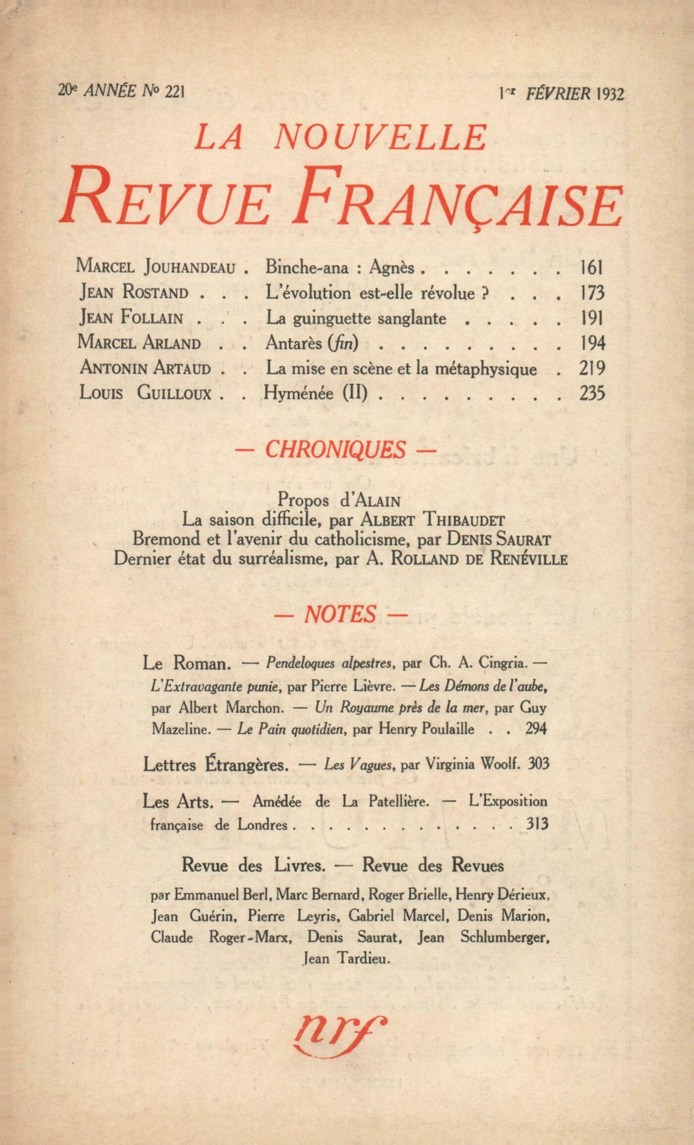 Marcel Jouhandeau, Binche-ana : AgnčsJean Rostand, L'évolution est-elle révolue?Jean Follain, La guinguette sanglante Les belles noyées Ŕ la dame du temps des BorgiaMarcel Arland, Antarčs (Fin)Antonin Artaud, La mise en scčne et la métaphysiqueLouis Guilloux, Hyménée (II) Alain, ProposRéflexions : Albert Thibaudet, La saison difficileDenis Saurat, Bremond et l'avenir du catholicismeA. Rolland de Renéville, Dernier état de la poésie surréalisteNotes : romans et récits : Pierre Leyris, Pendeloques alpestres, de Charles Albert Cingria (Mermod)Henry Dérieux, L'extravagante punie, par Pierre Ličvre (Éditions de la N. R. F.)Jean Tardieu, Les démons de l'aube, par Albert Marchon (Grasset)Henry Dérieux, Un royaume prčs de la mer, par Guy Mazeline (Éditions de la N. R. F.)Marc Bernard, Le Pain Quotidien, par Henry Poulaille (Valois)Notes : lettres étrangčres : Gabriel Marcel, Les Vagues, par Virginia Woolf (The Hogarth Press)Notes : les arts : Roger Brielle, Amédée de La PatelličreClaude Roger-Marx, L'exposition d'art français ŕ LondresRevue des livres : Denis Saurat, La Carne, par Georges David (Rieder) - Les Armes reposées, par Pierre Chanlaine (Tallandier) - Carnet de route du Juif Errant, par Alexandre Arnoux (Grasset)Jean Guérin, Trois histoires de la nuit, par Claude Aveline (Émile-Paul)Denis Saurat, Écho, par Violette Trefusis (Plon)Benjamin Crémieux, Cagayous, par MusetteDenis Saurat, Biologie de l'invention, par Charles Nicolle (Alcan)Jean Guérin, Un officier d'infanterie ŕ la guerre, par F. Boillot (Presses Universitaires)Jean Schlumberger, Esquisse des problčmes franco-allemands, par Bernard Lavergne (J. Gamber) - Frankreichs rote Kinder, Vendée, par Friedrich Sieburg (Societaets Verlag)Denis Saurat, Lettres ŕ un ami, par Rabindranath Tagore (Rieder) - La Septičme République : le Tadjikstan, par Boris Pilniak (Rieder) - Les Indifférents, par Alberto Moravia (Rieder)Denis Marion, Banjo, par Claude Mc Kay (Rieder)Revue des revues : Boris de Schlzer, ChopinJulien Benda, ŤComment écrivez-vous?ťCorrespondance : Emmanuel Berl, Lettre ŕ Ramon Fernandez