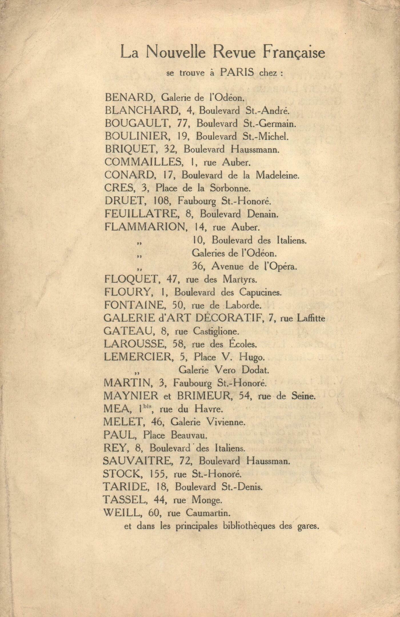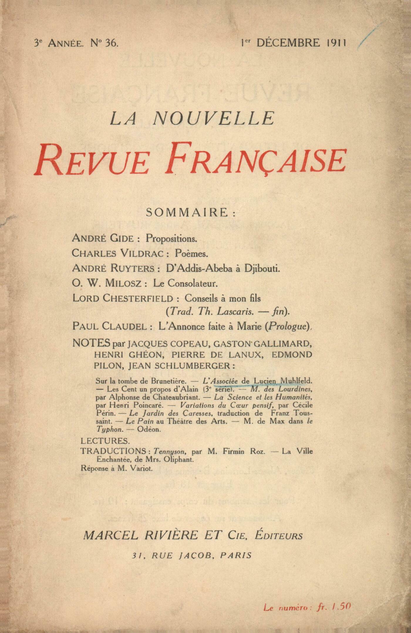 André Gide, PropositionsCharles Vildrac, PočmesAndré Ruyters, D'addis-Abeba ŕ DjiboutiO.W. Milosz, Le ConsolateurLord Chesterfield, Conseils ŕ mon fils (suite et fin)Paul Claudel, L'Annonce faite ŕ Marie (Prologue)Notes : Anonymes, Sur la tombe de BrunetičreJacques Copeau, L'Associée, par Lucien Muhlfeld (Calmann Lévy)Gaston Gallimard, Les cent un Propos d'Alain (Édition de la Dépęche de Rouen)Edmond Pilon, Monsieur des Lourdines, par Alphonse de Châteaubriand (Bernard Grasset)Pierre de Lanux, La Science et les Humanités, par Henri Poincaré (Fayard)Edmond Pilon, Variations du cur pensif, par Cécile Périn (E. Sansot)Jean Schlumberger, Le Jardin des Caresses, Anonymes (Piazza) Anonymes, Ŕ propos des représentations du Pain au Théâtre des ArtsJean Schlumberger, M. de Max dans Le Typhon de M. Melchior Lengyel (Théâtre Sarah Bernhardt) - OdéonLectures : Anonymes, Le Porche du Mystčre de la Deuxičme Vertu, par Charles PéguyTraductions : Henri Ghéon, Tennyson, par Firmin Roz (Bloud et Cie) Anonymes, La Ville enchantée, par Mrs Oliphant, préface de Maurice Barrčs (Émile Paul)François Bellet, Une lettreJacques Copeau, Réponse ŕ M. Variot
