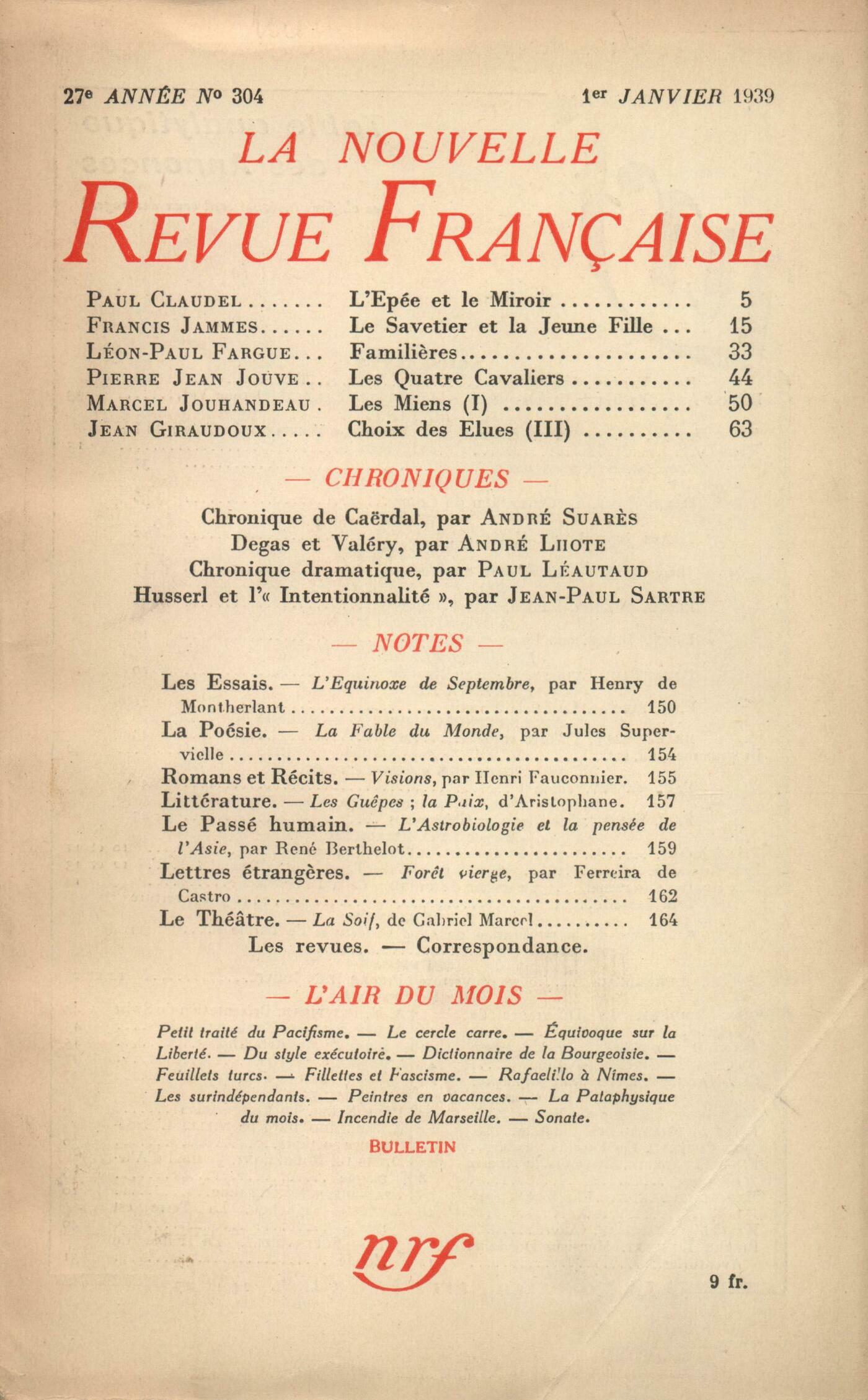 Paul Claudel, L'Épée et le MiroirFrancis Jammes, Le Savetier et la Jeune FilleLéon-Paul Fargue, FamiličresPierre Jean Jouve, Les Quatre CavaliersMarcel Jouhandeau, Les Miens (I)Jean Giraudoux, Choix des Élues (III)Chroniques : André Suarčs, Chronique de CaërdalJean-Paul Sartre, Une idée fondamentale de la ŤPhénoménologieť de Husserl, l'intentionalitéAndré Lhote, Degas et ValéryChronique dramatique : Paul Léautaud, Les Parents Terribles, de Jean Cocteau (Théâtre des Ambassadeurs)Notes : les essais : Roger Caillois, L'Équinoxe de Septembre, par Henry de Montherlant (Bernard Grasset)Notes : la poésie : Julien Lanoë, La Fable du Monde, par Jules Supervielle (N. R. F.) - Reconnaissance ŕ Supervielle (Regains)Notes : romans et récits : Gabriel Marcel, Visions, par Henri Fauconnier (Stock)Marie Delcourt, Les Guępes La Paix, d'Aristophane (Belles-Lettres)Notes : le passé humain : Jean Prévost, L'astrobiologie et la pensée de l'Asie, par René Berthelot (Payot)Notes : lettres étrangčres : Charles-Albert Cingria, Foręt vierge, de Ferreira de Castro (Grasset)Notes : le théâtre : Jean Schlumberger, La Soif, par Gabriel Marcel (Desclée de Brouwer)Les revues : Jean Giono, Les seules véritésHenry de Montherlant, La France de 1938Correspondance : Pierre Jean Jouve, Une lettreL'air du mois : Jean Paulhan, Petit traité du pacifismeJean Grenier, Le cercle carré (Suite)Julien Benda, Équivoque sur la liberté - Du style exécutoire - Dictionnaire de la bourgeoisiePierre Béarn, Feuillets turcsArmand-M. Petitjean, Fillettes et fascismeMichel Leiris, Rafaelillo le 9 octobre ŕ NîmesAndré Lhote, Les Surindépendants - Peintres en vacancesRené Daumal, La pataphysique du moisJacques Audiberti, Incendie de MarseilleCharles-Albert Cingria, SonateJean Guérin, Bulletin