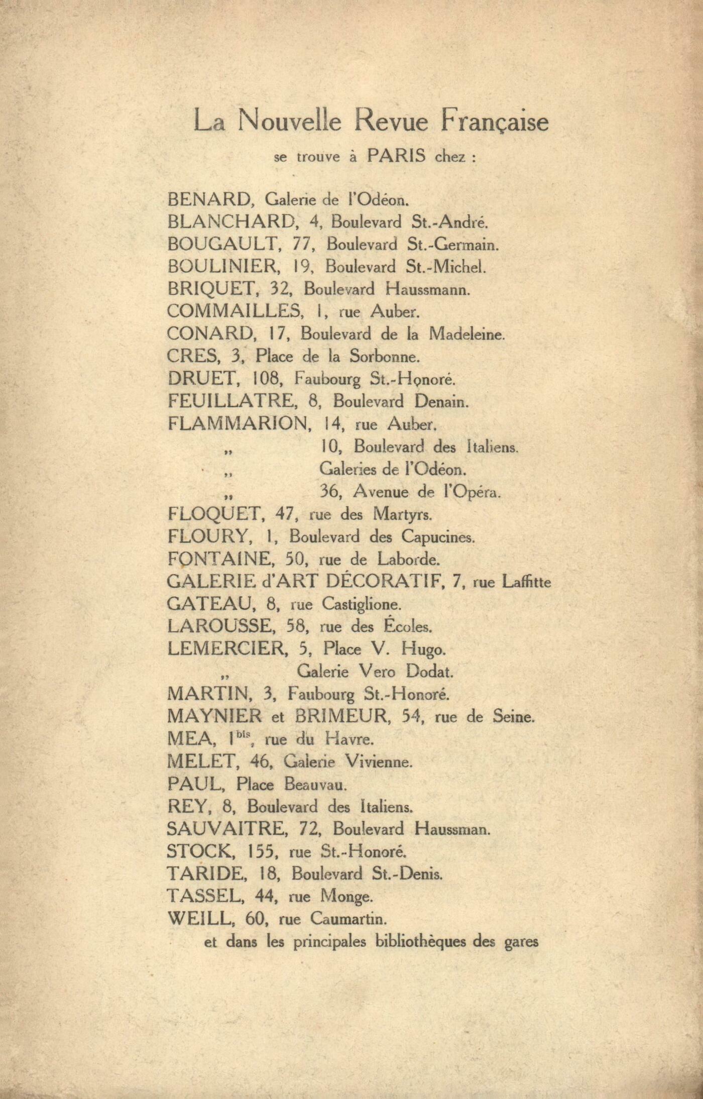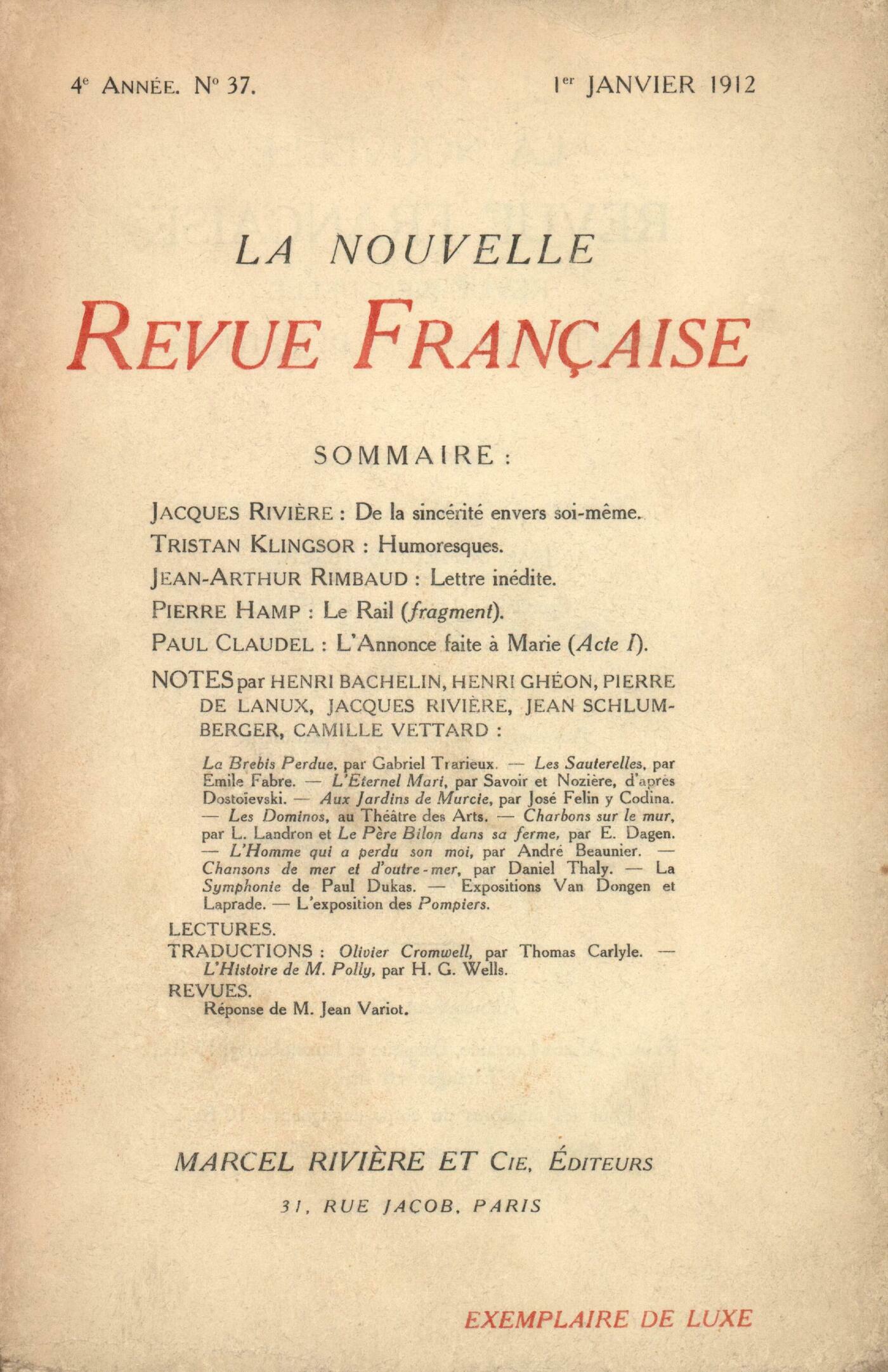 Jacques Rivičre, De la sincérité envers soi-męmeTristan Klingsor, HumoresquesArthur Rimbaud, Lettre inéditePierre Hamp, Le Rail (La peine des hommes) (fragment)Paul Claudel, L'Annonce faite ŕ Marie (Acte I)Notes : Jean Schlumberger, La Brebis perdue, par Gabriel Trarieux (Comédie Française) - Les Sauterelles, par Émile Fabre (Vaudeville)Pierre de Lanux, L'Éternel Mari, par MM. Savoir et Nozičre, d'aprčs Dostoďevsky (Théâtre Antoine)Jean Schlumberger, Aux jardins de Murcie, par José Felin y Codina (Odéon)Henri Ghéon, Les Folies-Françaises ou Les Dominos (Théâtre des Arts)Henri Bachelin, Charbons sur le mur, par Louis Landron (Bernard Grasset) - Le pčre Billon dans sa ferme, par E. Dagen (Bernard Grasset)Camille Vettard, L'Homme qui a perdu son moi, par André Beaunier (Plon)Henri Ghéon, Chansons de mer et d'outre-mer, par Daniel Thaly (La Phalange) - La Symphonie de Paul Dukas (Concerts du Conservatoire) - Exposition Van Dongen (Galerie Bernheim) - Exposition Laprade (Galerie Druet)Jacques Rivičre, Ŕ propos d'une prochaine exposition des PompiersTraductions : Henri Ghéon, Olivier Cromwell, sa correspondance, ses discours, par Thomas Carlyle (Mercure de France) - L'Histoire de M. Polly, par H. G. Wells (Mercure de France)Jean Variot, Réponse ŕ Jacques Copeau [et ŕ André Gide]
