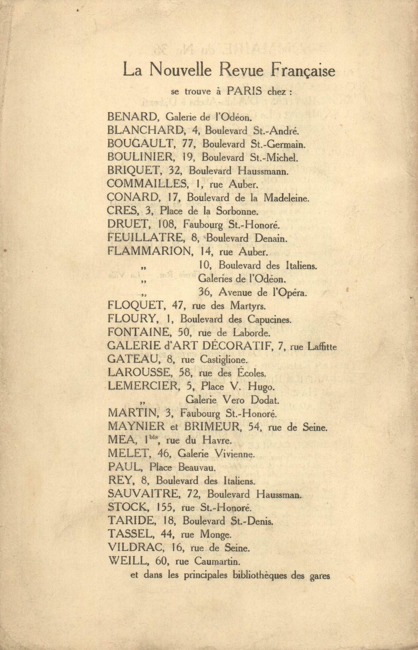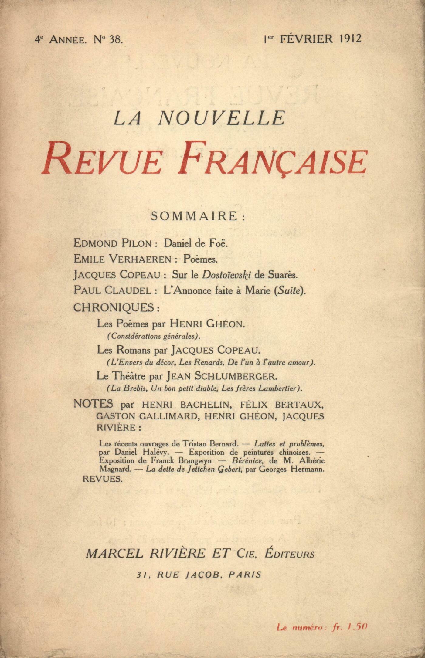 Edmond Pilon, Daniel de FoëÉmile Verhaeren, PočmesJacques Copeau, Sur le Dostoďevsky de SuarčsPaul Claudel, L'Annonce faite ŕ Marie (Acte II)Chronique des počmes : Henri Ghéon, Considérations généralesChronique des romans : Jacques Copeau, L'Envers du décor, par Paul Bourget (Plon-Nourrit) - Les Renards, par Abel Hermant (Louis Michaud) - De l'un ŕ l'autre amour, par Noëlle Roger (Perrin)Chronique du Théâtre : Jean Schlumberger, La Brebis, par Edmond Sée (Théâtre Michel) - Un bon petit diable, par Rosemonde et Maurice Rostand - Les Frčres Lambertier, par Cahrles Hell et Villeroy (Odéon)Notes : Henri Bachelin, Les récents ouvrages de Tristan BernardHenri Ghéon, Luttes et problčmes, par Daniel Halévy (Marcel Rivičre et Cie)Jacques Rivičre, Exposition de peintures chinoises (Galerie Durand-Ruel)Gaston Gallimard, Exposition de dessins, d'eaux-fortes et de lithographies de Frank Brangwyn (Galerie Durand-Ruel)Henri Ghéon, Bérénice, par Albéric Magnard (Opéra Comique)Félix Bertaux, La dette de Jettchen Gebert, par Georges Hermann (Hachette)