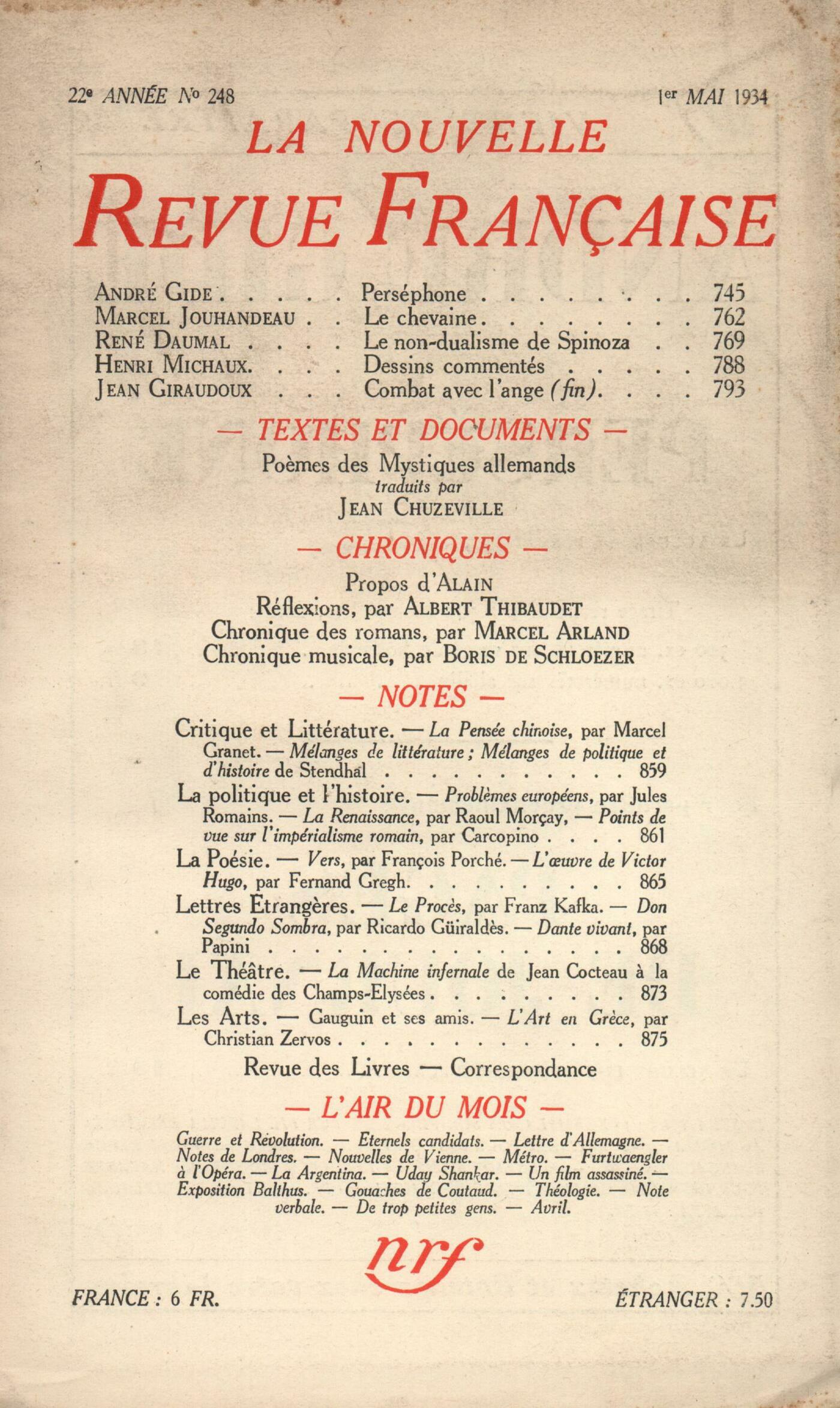 André Gide, PerséphoneMarcel Jouhandeau, Le chevaineRené Daumal, Le non-dualisme de Spinoza ou La dynamite philosophiqueHenri Michaux, Dessins commentésJean Giraudoux, Combat avec l'Ange (Fin)Jean Chuzeville, Les počtes mystiques de l'Allemagne Collectifs, Počmes des Mystiques allemands Alain, ProposRéflexions : Albert Thibaudet, Hermione sans paradoxeChronique des romans : Marcel Arland, Le Visionnaire, par Julien Green - La Comédie de Charleroi, par Drieu la Rochelle - Denier du ręve, par Marguerite YourcenarBoris de Schlzer, Chronique musicaleNotes : critique et littérature : Jean Louverné, La pensée chinoise, par Marcel Granet (Renaissance du Livre)Jean Prévost, Mélanges de littérature, de Stendhal (Le Divan) - Mélanges de politique et d'histoire, de Stendhal (Le Divan)Notes : la politique et l'histoire : Benjamin Crémieux, Problčmes européens, par Jules Romains (Flammarion)Charles-Albert Cingria, La Renaissance, par Raoul MorçayJean Prévost, Points de vue sur l'impérialisme romain, par Carcopino (Le Divan)Notes : la poésie : Raymond Schwab, Vers, par François Porché (Flammarion) - L'uvre de Victor Hugo, par Fernand Gregh (Flammarion)Notes : lettres étrangčres : Denis de Rougemont, Le Procčs, de Franz Kafka (Gallimard)Denis Saurat, Don Segundo Sombra, par Ricardo Guiraldčs (Éditions de la N. R. F.)Benjamin Crémieux, Dante vivant, par Giovanni Papini (Grasset)Notes : le théâtre : Jean Schlumberger, La Machine infernale, de Jean Cocteau (Comédie des Champs-Élysées)Notes : les arts : André Lhote, Gauguin et ses amis (Galerie des Beaux-Arts)Jean Prévost, L'art en Grčce, par Christian Zervos (Cahiers d'Art)Revue des livres : Raymond Schwab, La Cinquičme Saison, par Jean Hytier (Cahiers du Sud) - Les Signatures naturelles, par Raymond Daltheil (Cahiers du Journal des Počtes) - Cophetuesques, par Alphonse Métérié (Cahiers de la Quinzaine) - Vingt počmes de juin, par Gilbert Trolliet (Présence) - Corps et âme, par Pierre Flouquet (Journal des Počtes) - Boules de naphtaline, par Pierre Moussarie (La Bouteille ŕ la Mer) - Arden, par Gilbert Lély (Librairie du Luxembourg)Correspondance : Benjamin Crémieux, Question posée ŕ Charles MaurrasRobert Dreyfus, De Gobineau ŕ Boisjoslin Collectifs, Un appel aux travailleursL'air du mois : Pierre Drieu la Rochelle, Guerre et révolutionJean Grenier, Éternels candidats, éternels prisonniersH. B., Une lettre d'AllemagneDenis Saurat, Notes de LondresJ. B., Nouvelles de VienneEugčne Dabit, MétroBoris de Schlzer, Furtwaengler ŕ l'OpéraAuguste Bréal, Ŕ propos des danses de Ťla ArgentinaťRené Daumal, Uday Shankar - Un film assassinéAntonin Artaud, Exposition Balthus ŕ la Galerie PierreMarc Bernard, Gouaches de Lucien Coutaud ŕ la Galerie VignonL. S., ThéologieCharles-Albert Cingria, Note verbaleL. Rivier, De trop petites gensHenri Pourrat, Avril