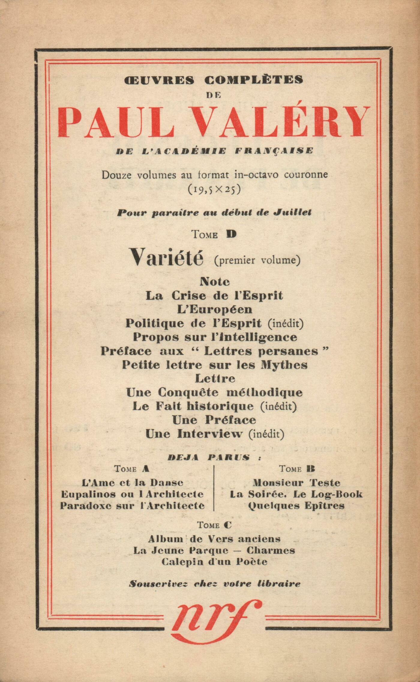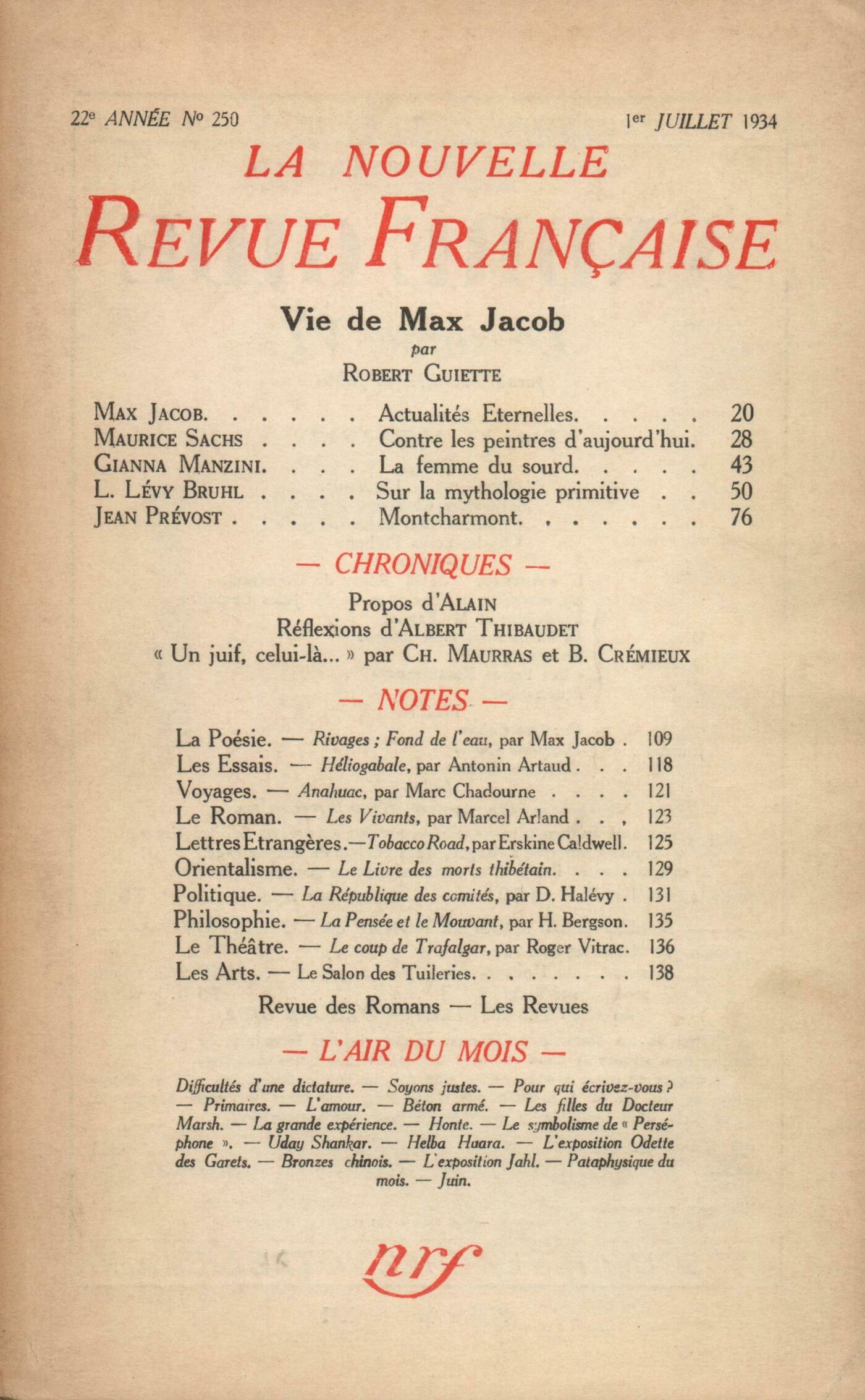 Robert Guiette, Vie de Max Jacob (I)Max Jacob, Actualités éternellesMaurice Sachs, Contre les peintres d'aujourd'huiGianna Manzini, La femme du sourdLucien Lévy-Bruhl, Vues sur la mythologie primitiveJean Prévost, Montcharmont Alain, ProposRéflexions : Albert Thibaudet, Les Partis et les Idées - Au pays parisien - Intéręts et idéesCharles Maurras, ŤUn Juif, celui-lŕ...ť (Lettre ŕ la N. R. F.)Benjamin Crémieux, ŤUn Juif, celui-lŕ...ť (Réponse ŕ Charles Maurras)Notes : la poésie : Gabriel Bounoure, Les pénitents en maillots roses, par Max Jacob (Kra) - Visions infernales, par Max Jacob (Éditions de la N. R. F.) - Fond de l'eau, par Max Jacob (Éditions des Cahiers Libres) - Rivage, par Max Jacob (Éditions des Cahiers Libres)Notes : les essais : Charles-Albert Cingria, Héliogabale ou L'anarchiste couronné, par Antonin Artaud (Denoël et Steele)Notes : voyages : Benjamin Crémieux, Anahuac ou L'Indien sans plumes, par Marc Chadourne (Plon)Notes : le roman : Jean Schlumberger, Les Vivants, par Marcel Arland (Éditions de la N. R. F.)Notes : lettres étrangčres : Maurice-Edgar Coindreau, Tobacco Road, par Erskine Caldwell (Charles Scribners Sons) - From Flushing to Calvary, par Edward Dahlberg (Harcourt Brace and Co)Notes : orientalisme : A. Rolland de Renéville, Bardo Thodol ou Livre des morts tibétains (Maisonneuve)Notes : politique : Jean Prévost, La République des Comités, par Daniel Halévy (Grasset)Notes : philosophie : Ramon Fernandez, La pensée et le mouvant, par Henri Bergson (Alcan)Notes : le théâtre : Antonin Artaud, Le Coup de Trafalgar, par Roger Vitrac (Théâtre de l'Atelier)Notes : les arts : André Lhote, Le Salon des TuileriesRevue des romans : Jean Guérin, Individu, par Raymond Houssilane (Grasset) - Tels que nous sommes, par Gaston Rageot (Plon) - Clochemerle, par Gabriel Chevallier (Rieder) - Charline, par Martial-Piéchaud (Plon) - La Route aux embűches, par Maurice Rué (N. R. F.) - Le comte Serge, par Guillaume Gaulčne (Baudiničre) - Sous l'étendard vert, par Joseph Peyré (Grasset) - Gens de mer, par Édouard Peisson (Grasset)Les revues : Jean Grenier, Prudence des philosophes Anonymes, MémentoCorrrespondance : Jean Grenier, Une lettreJulien Benda, Réponse ŕ Jean GrenierPaul Nizan, Une lettreL'air du mois : Jean Prévost, Les difficultés d'une dictatureJulien Benda, Soyons justes - Pour qui écrivez-vous?Jean Grenier, Primaires - L'amourJacques Audiberti, Béton arméAlexandre Vialatte, Les quatre filles du docteur MarshRené Daumal, La Grande Expérience (Salle Pleyel) - Honte (Contre-plan) (Salle Pleyel)Adrienne Monnier, Le symbolisme de PerséphoneBoris de Schlzer, Uday Shankar et la musique indoueJulie Sazonova, Danses d'Uday ShankarRené Daumal, Helba HuaraAndré Lhote, Odette des Garets (Galerie Druet)Jean Louverné, Bronzes chinois ŕ l'OrangerieJean Cassou, Exposition Jahl (Galerie Castel)René Daumal, La pataphysique du moisHenri Pourrat, Juin