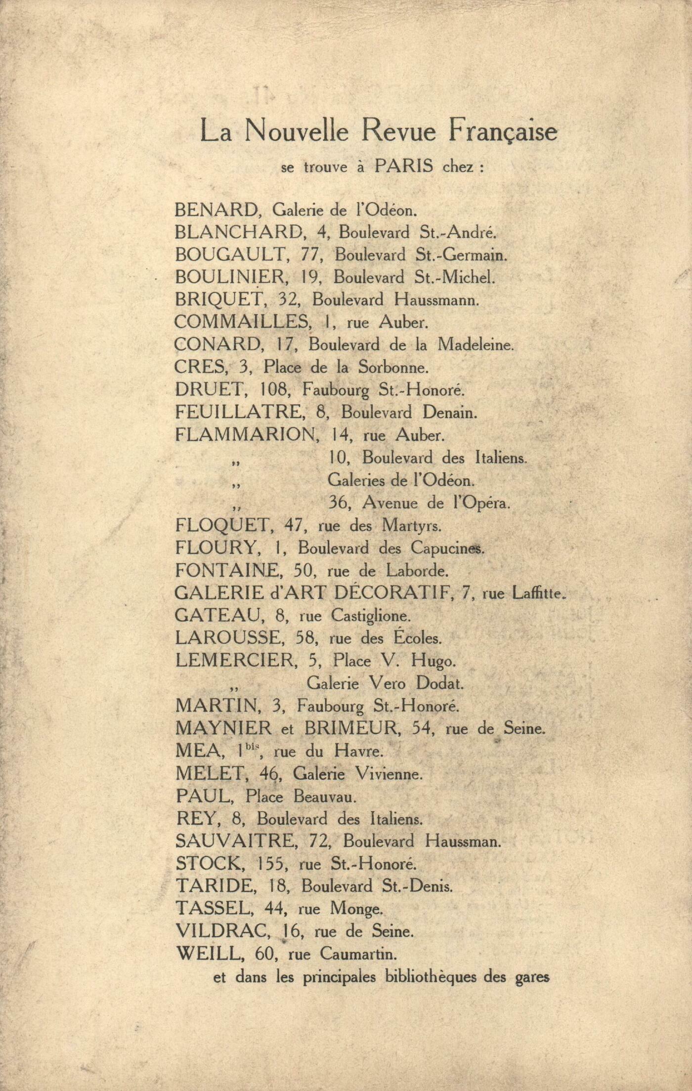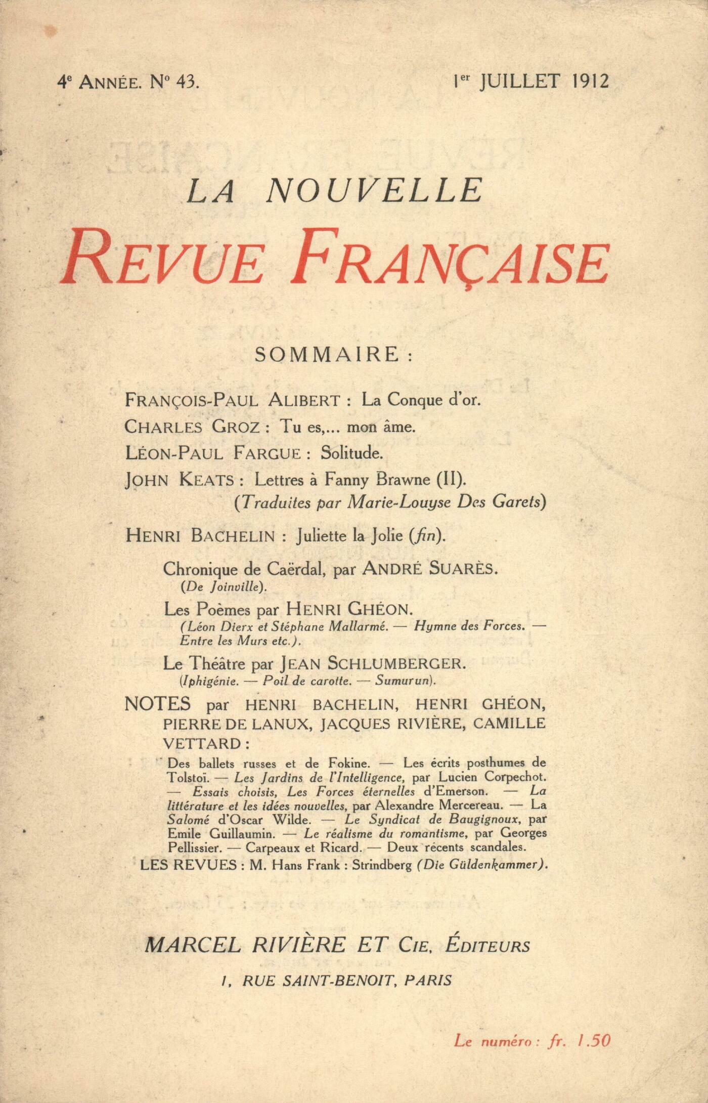 François-Paul Alibert, La Conque d'orCharles Groz, Tu es,... mon âmeLéon-Paul Fargue, SolitudeJohn Keats, Lettres ŕ Fanny Brawne (II)Henri Bachelin, Juliette la Jolie (fin)Chronique de Caërdal : André Suarčs, De JoinvilleChronique des počmes : Henri Ghéon, Léon Dierx et Stéphane Mallarmé - Hymne des Forces, par Martin Barzun (Mercure de France) - La Marche ŕ l'Étoile, par Albert Londres (Sansot) - Entre les Murs, par Ch. Troufleau (Lecčne et Oudin) - Prisme étrange de la maladie, par M. Porché - Les Impalpables, par René d'Avril (La Phalange) - Fumée d'Ardenne, par Thomas Braun (Deman éd.)Chronique du Théâtre : Jean Schlumberger, Iphigénie et Poil de Carotte (Comédie Française) - Sumurun (Vaudeville)Notes : Jacques Rivičre, Des Ballets Russes et de FokineCamille Vettard, Les écrits posthumes de TolstoďHenri Ghéon, Les jardins de l'intelligence, par Lucien CorpechotCamille Vettard, Essais choisis (Alcan) et Les forces éternelles et autres essais (Mercure) d'EmersonHenri Ghéon, La Littérature et les idées nouvelles, par Alexandre MercereauPierre de Lanux, La Salomé d'Oscar Wilde, au ChâteletHenri Bachelin, Le Syndicat de Baugignoux, par Émile Guillaumin (Fasquelle)Camille Vettard, Le Réalisme du Romantisme, par Georges Pellissier (Hachette)Henri Ghéon, Carpeaux et Ricard au Jeu de Paume - Deux récents scandales : le Faune de Nijinski et la Salomé de Regnault Anonymes, PrécisionsRevues : Anonymes, Sur Strindberg...