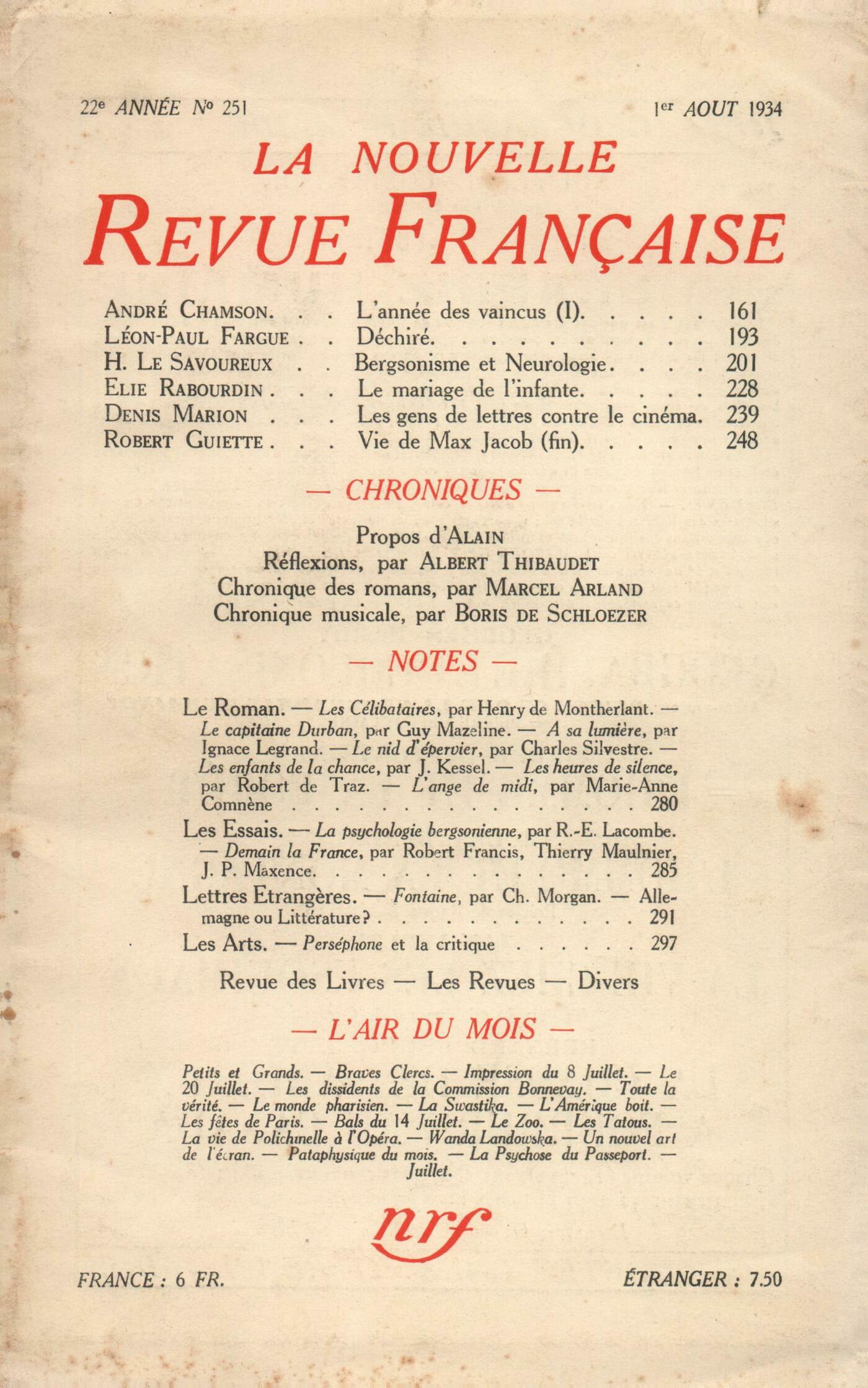 André Chamson, L'année des vaincus (I)Léon-Paul Fargue, DéchiréH. Le Savoureux, Bergsonisme et neurologieÉlie Rabourdin, Le mariage de l'infanteDenis Marion, Les gens de lettres contre le cinémaRobert Guiette, Vie de Max Jacob (Fin) Alain, ProposRéflexions : Albert Thibaudet, Conclusions sur FlaubertChronique des romans : Marcel Arland, Les Célibataires, par Henry de Montherlant - Le capitaine Durban, par Guy Mazeline - Ŕ sa lumičre, par Ignace Legrand - Le nid d'épervier, par Charles SilvestreBoris de Schlzer, Chronique musicaleNotes : romans et récits : Benjamin Crémieux, Les Enfants de la Chance, par Joseph Kessel (Gallimard)Jean Schlumberger, Les heures de silence, par Robert de Traz (Grasset)Henri Martineau, L'Ange de Midi, par Marie-Anne Comnčne (Éditions de la N. R. F.)Notes : les essais : Julien Benda, La psychologie bergsonienne, par Roger-E. Lacombe (Alcan)Pierre Drieu la Rochelle, Demain la France, par Robert Francis, Thierry Maulnier et Jean-Pierre Maxence (Grasset)Notes : lettres étrangčres : Roger Breuil, Fontaine, par Charles Morgan (Stock)Félix Bertaux, Allemagne? ou littérature?Notes : les arts : Jean Guérin, Alfred SavoirCharles-Albert Cingria - Boris de Schlzer, Perséphone et la critiqueAndré Lhote, L'exposition Georges Rouault (Amis de l'Art Contemporain)Revue des livres : Jean Guérin, Victor Hugo, pontife de la démagogie, par G. Batault (Plon) - Témoins du spirituel, par Paul Archambault (Bloud et Gay)Ferdinand Alquié, Le rendez-vous d'un soir d'hiver, par Joë Bousquet (René Debresse)Jean Guérin, L'amant de la solitude, par M. de Laborderie (Figuičre)Henri Pourrat, La transhumance, par J. Jacoupy (Stock)Jean Guérin, Cayenne, par Alexis Danau (Fayard)Henri Pourrat, Aventures en Arabie, par W.-B. Seabrook (Gallimard)Correspondance : René Groos, Une lettreL'air du mois : Julien Benda, Petits et grands - Braves clercs - Impression du 8 juillet - Impression du 20 juillet - Les dissidents de la commission BonnevayGuillaume de Tarde, Toute la véritéPierre Drieu la Rochelle, Le monde pharisienAdrienne Monnier, La swastikaHélčne Harvitt, L'Amérique boitJean Guérin, Les fętes de ParisMarc Bernard, Quatorze juillet de banlieueJean Prévost, Le zoo de VincennesJean Guérin, Les tatousBoris de Schlzer, La vie de Polichinelle, de N. Nabokov (Grand-Opéra)Benjamin Crémieux, Concerts ŕ Saint-Leu-la-ForętRené Daumal, Un nouvel art de l'écran - La pataphysique du mois - La psychose du passeportHenri Pourrat, Juillet