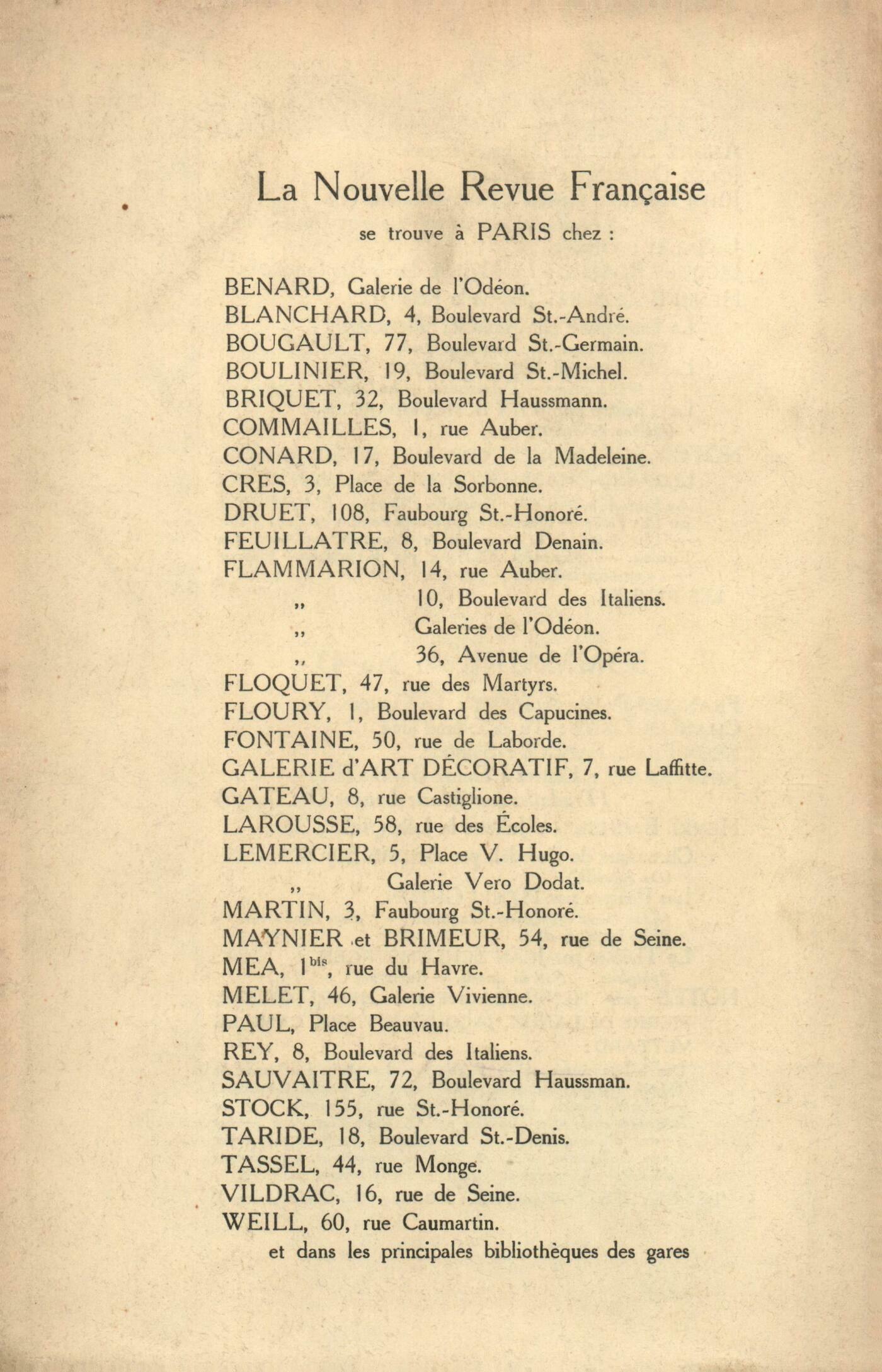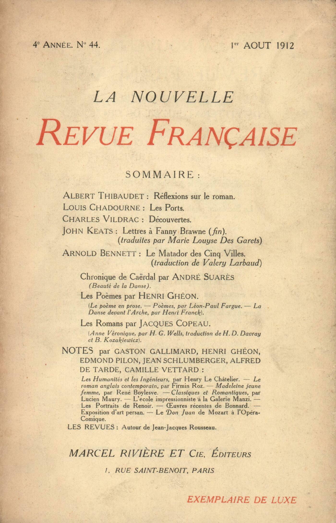 Albert Thibaudet, Réflexions sur le romanLouis Chadourne, Les PortsCharles Vildrac, DécouvertesJohn Keats, Lettres ŕ Fanny Brawne (fin)Arnold Bennett, Le Matador des Cinq VillesChronique de Caërdal : André Suarčs, Beauté de la DanseChronique des počmes : Henri Ghéon, Le počme en prose - Počmes, par Léon-Paul Fargue - La Danse devant l'Arche, par Henri FranckChronique des romans : Jacques Copeau, Anne Véronique, par H. G. Wells (Mercure de France)Notes : Alfred de Tarde, Les Humanités et les ingénieurs, par Henry Le Châtelier (Fayard)Camille Vettard, Le Roman anglais contemporain, par Firmin Roz (Hachette)Henri Ghéon, Madeleine jeune femme, par René BoylesveEdmond Pilon, Classiques et Romantiques, par Lucien Maury (Perrin et Cie)Henri Ghéon, L'École impressionniste ŕ la Galerie ManziGaston Gallimard, Exposition de portraits de Renoir (Galerie Durand-Ruel) - uvres récentes de Bonnard (Galerie Bernheim)Jean Schlumberger, Exposition d'Art persan (Pavillon de Marsan)Henri Ghéon, Le Don Juan de Mozart ŕ l'Opéra-ComiqueLucien Descaves, Une lettre [ŕ la NRF]Revues : Anonymes, Autour de Jean-Jacques Rousseau