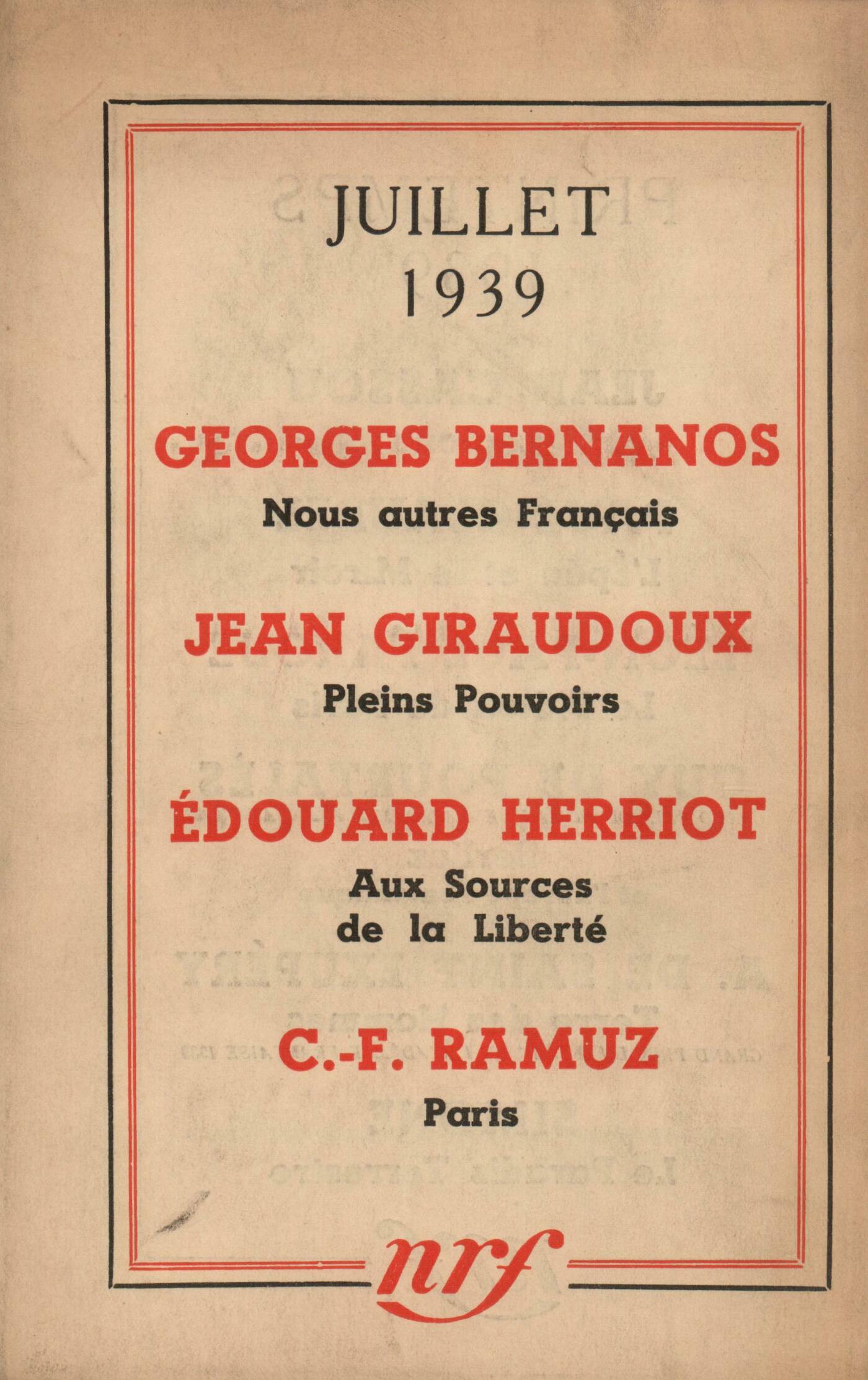 Jules Romains, Essai de réponse ŕ la plus vaste questionPatrice de La Tour du Pin, PočmesClaire Sainte-Soline, MagnoliaPaul Claudel, La cathédrale de Strasbourg Alain, Le déjeuner chez LapérouseRichard Hughes, Péril en mer (Fin)Documents : Charles-Louis Philippe, Lettres ŕ Valery LarbaudChroniques : André Suarčs, Chronique de CaërdalRoger Caillois, Sociologie du clercEssais critiques : Marcel Arland, Introduction ŕ la poésie française, par Thierry Maulnier - Gérard de Nerval, par Kléber Haedens - Odilon-Jean Périer, par Auguste MarinNotes : la poésie : Jean Wahl, Nous n'irons plus au bois, par Jacques Givet (G. L. M.) - Sens de la solitude, par René Tavernier (Librairie Véga) - Les Solitudes de la Matičre, par Pericle Patocchi (Librairie de l'Université de Fribourg) - Midis Gagnés, par Tristan Tzara (Denoël) - Finisterre, par Charles Massonne (Éditions du Cuvier)Notes : les essais : Henri Pourrat, Vues sur l'Europe, par André Suarčs (Grasset)Jean Prévost, Convulsion de la force, par Alain (Éditions de la N. R. F.) - Échec ŕ la force, par Alain (Éditions de la N. R. F.) - Minerve ou De la sagesse, par Alain (Hartmann) - Idées, par Alain (Hartmann)Notes : l'Histoire : Jean Prévost, Saint Augustin et la fin de la culture antique, par Henri-Irénée Marrou (De Boccard)Joë Bousquet, Jacques Cartier et la découverte de l'Amérique du Nord, par Gaston Martin (N. R. F.)Armand-M. Petitjean, La Commune, par Albert Ollivier (Éditions de la N. R. F.)Notes : lettres étrangčres : Lucien Maury, uvres complčtes d'Henrik Ibsen (Plon)Notes : les arts : Marcel Arland, Hiéronymus Bosch, par Charles de Tolnay (Éditions Holbein)Les revues : Paul Claudel - Jacques Maritain - Jean Guérin, ŤAttendez qu'elle ait műri...ťCorrespondance : Jean Wahl, Une lettreAndré Gide, Lettre ŕ M. H. DommartinL'air du mois : Jules Supervielle, L'arbre entre tousJacques Audiberti, Les voyagesFernand Auberjonois, Par la fenętre de LénoreÉmile Dermenghem, La taničre de la féeMichel Pontremoli, Les bennes excavatricesJulien Benda, L'intellectuel et les réalités - Refus des idées distinctes - AutolâtrieAndré Lhote, James Ensor ŕ ParisJulien Lanoë, Le Prado ŕ GenčveRené Daumal, La pataphysique du moisCharles-Albert Cingria, Rois fainéantsJean Guérin, Bulletin