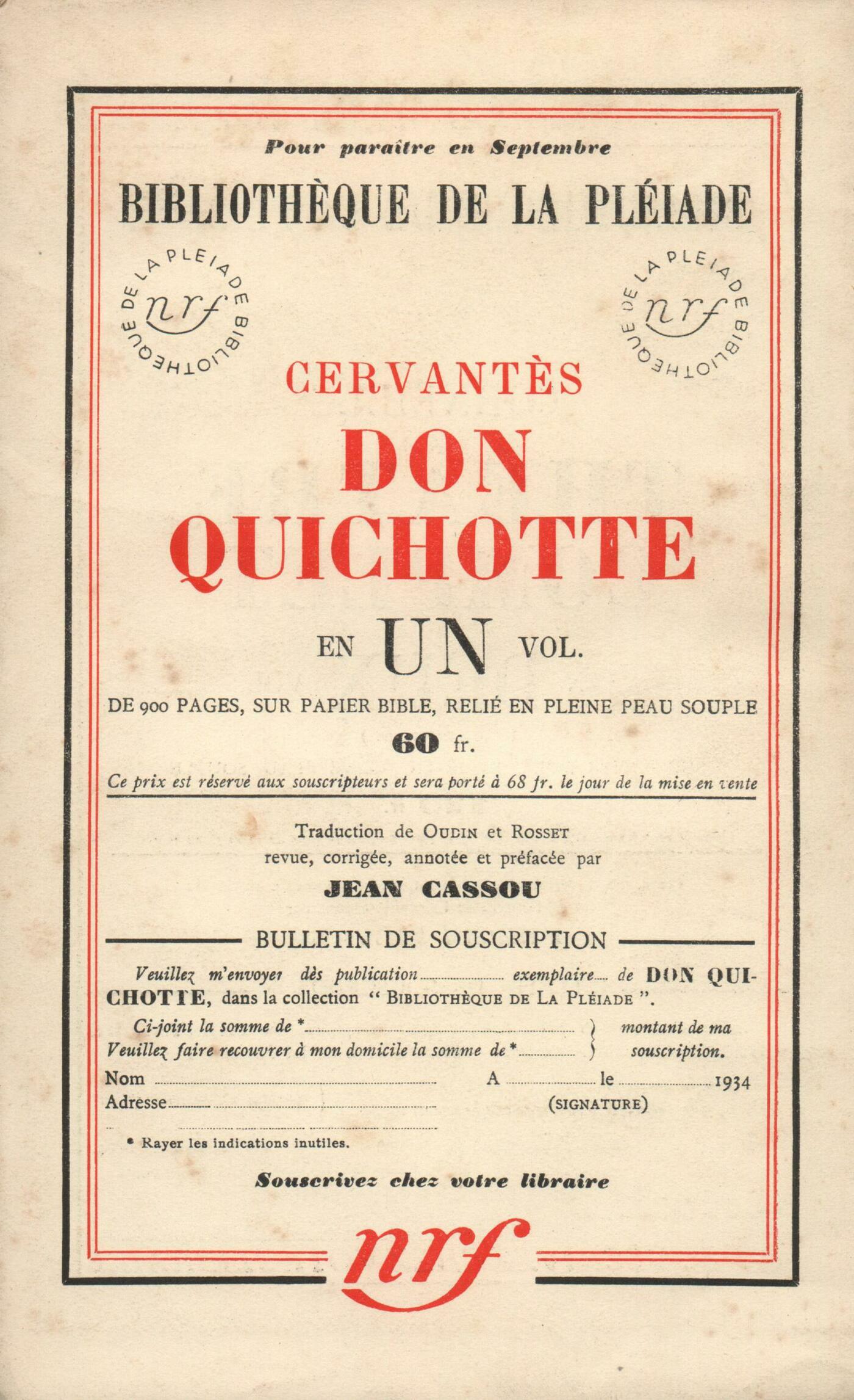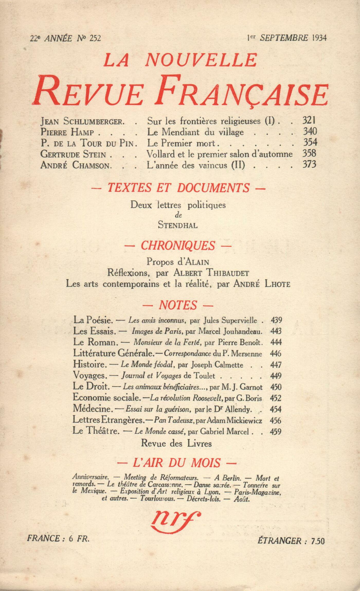 Jean Schlumberger, Sur les frontičres religieuses (I)Pierre Hamp, Le Mendiant du villagePatrice de La Tour du Pin, Le Premier MortGertrude Stein, Vollard et le premier Salon d'AutomneAndré Chamson, L'année des vaincus (II) Stendhal, Deux lettres politiques Alain, ProposRéflexions : Albert Thibaudet, Sur un Plan universitaireAndré Lhote, Les Arts contemporains et la réalitéNotes : la poésie : A. Rolland de Renéville, Les Amis inconnus, par Jules Supervielle (Éditions de la N. R. F.)Notes : les essais : Charles-Albert Cingria, Images de Paris, par Marcel Jouhandeau (Gallimard)Notes : le roman : Jean Vaudal, Monsieur de la Ferté, par Pierre Benoît (Albin Michel)Notes : littérature générale : Henri Gouhier, Correspondance, I, du P. Marin Mersenne, religieux minime (Beauchesne)Notes : histoire : Jean Prévost, Le monde féodal, par Joseph Calmette (Presses Universitaires)Notes : voyages : Jean Grenier, Journal et voyages, par P.-J. Toulet (Le Divan)Notes : le droit : Jean Grenier, Les animaux bénéficiaires de libéralités, par Marc-Jean Garnot (Les Presses bretonnes)Notes : économie sociale : Guillaume de Tarde, La Révolution Roosevelt, par Georges Boris (Éditions de la N. R. F.)Notes : médecine : A. Rolland de Renéville, Essai sur la guérison, par René Allendy (Denoël et Steele)Notes : lettres étrangčres : Henri Pourrat, Pan Tadeusz, par Adam Mickiewicz (Alcan)Notes : le théâtre : Julien Lanoë, Le Monde cassé, de Gabriel Marcel (Desclée de Brouwer)Revue des livres : Jean Grenier, D'autres bętes qu'on appelle sauvages, par André Demaison (Les Écrivains Français)Denis Marion, Tchad, par Denise Moran (N. R. F.)Henri Fontenoy, Japon 1934, par Maurice Lachin (Gallimard)René Daumal, Les religions révélées, par Henri Roger (Les uvres Représentatives)Fr. Abelous, Montaigne et son temps, par Jean Plattard (Boivin)Raymond Schwab, Choix de poésies, par Marceline Desbordes-Valmore (Fasquelle) - Amitié des choses, par Jean Bordeaux (Messein) - Confidence des îles, par Yanette Delétang-Tardif (Corręa) - Ces dieux les jours! par Paule Reuss (Le Rouge et le Noir)Bernard Groethuysen, The Horizon of Experience, par Delisle Burns (George Allen and Unwin)Georges Lafourcade, Die Charaktere in der Romanen. Joseph Conrads, par Hildegard Bennewitz (Greifswald)Revues et journaux : Julien Benda, La crise de la probitéL'air du mois : Charles-Albert Cingria, IntroductionJacques Audiberti, AnniversaireJulien Benda, Meeting de réformateursGeorges Neveux, Ŕ BerlinRobert Sébastien, Mort et remordsGaston Bonheur, Le théâtre antique de CarcassonneRené Daumal, Danse sacréeJean Vaudal, Tonnerre sur le MexiqueJean Wahl, Une exposition d'art religieux ŕ LyonJean Guérin, Paris-magazine, etc.Jacques Audiberti, TourlourousL. Rivier, Décrets-loisHenri Pourrat, Aoűt