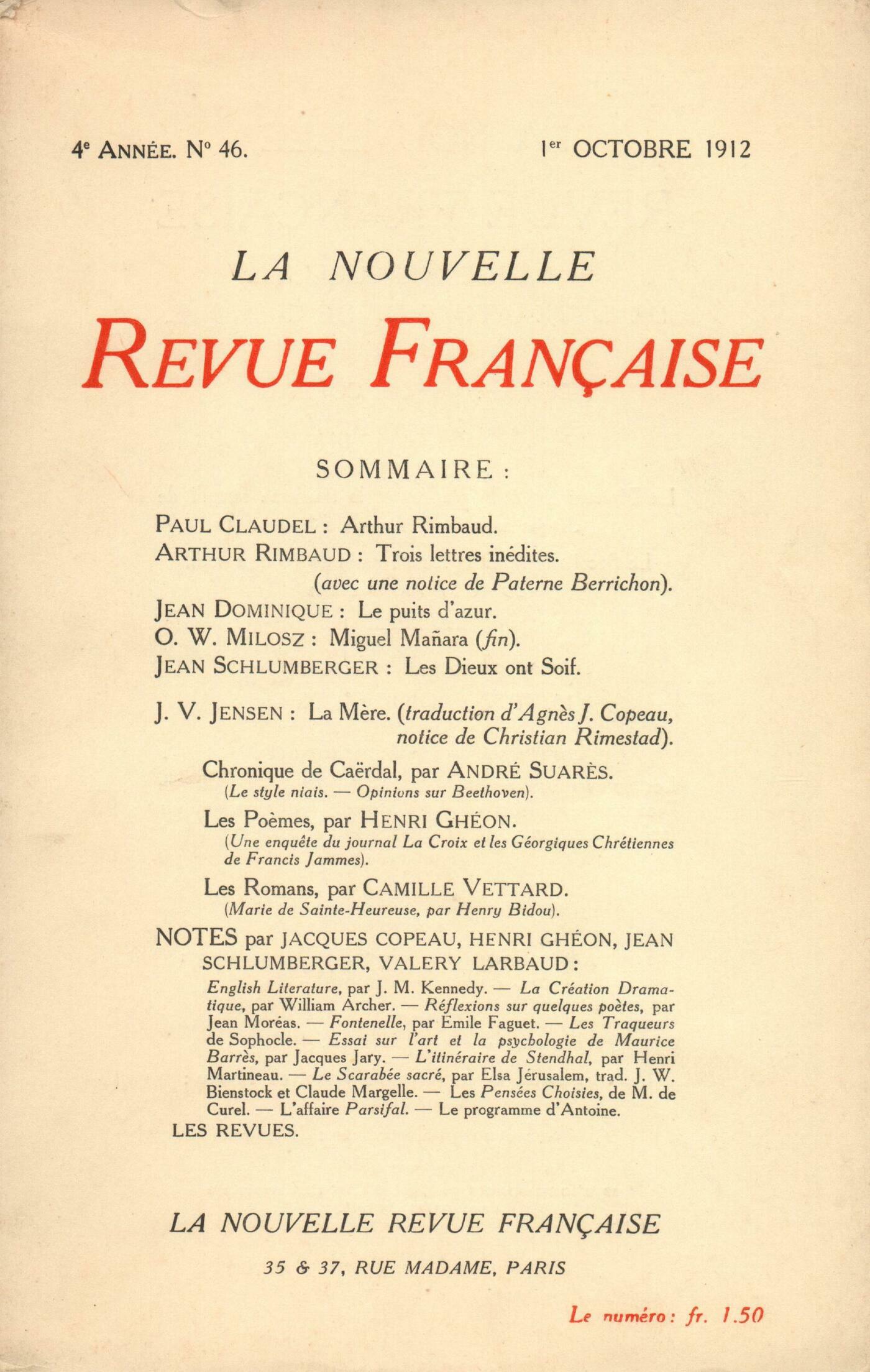 Paul Claudel, Arthur RimbaudPaterne Berrichon, Trois lettres inédites de RimbaudArthur Rimbaud, Trois lettres inéditesJean Dominique, Le puits d'azurO.W. Milosz, Miguel Mańara (fin)Jean Schlumberger, Les Dieux ont SoifChristian Rimestad, Johannes V. JensenJohannes V. Jensen, La MčreChronique de Caërdal : André Suarčs, Le style niais - Opinions sur BeethovenChronique des počmes : Henri Ghéon, Un enquęte du journal La Croix et les Géorgiques Chrétiennes de Francis JammesChronique des romans : Camille Vettard, Marie de Sainte-Heureuse, par Henry Bidou (Calmam-Lévy)Notes : Valery Larbaud, English Literature, by J. M. Kennedy (Stephen Swift and Co)Jacques Copeau, Play-making, a manual of craftmanship, by William Archer (Chapman and Hall)Henri Ghéon, Réflexions sur quelques počtes, par Jean Moréas (Mercure de France) - Fontenelle, textes choisis et commentés, par Émile Faguet (Plon)Jean Schlumberger, Les Traqueurs de Sophocle (Revue de Paris) - Essai sur l'art et la psychologie de Maurice Barrčs, par Jacques Jary (Émile-Paul) - L'itinéraire de Stendhal, par Henri Martineau (Albert Messein)Jacques Copeau, Le Scarabée sacré, par Elsa Jérusalem (Fasquelle)Jean Schlumberger, Les Pensées choisies de M. de Curel (Sansot) - L'Affaire ParsifalPascal Copeau, Le programme d'Antoine