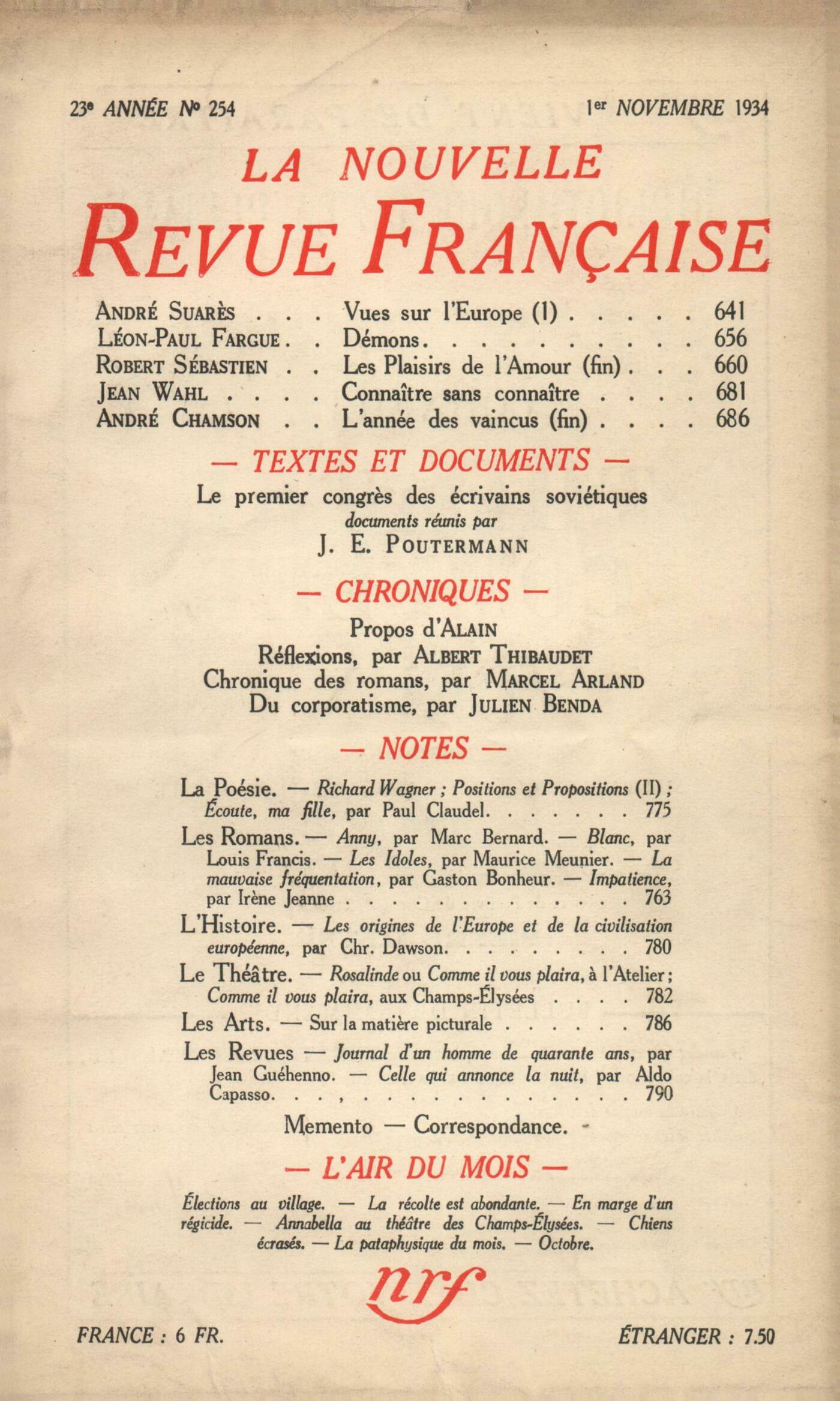 André Suarčs, Vues sur l'Europe (I)Léon-Paul Fargue, Les quatre journées d'Acajon Barogne : DémonsRobert Sébastien, Les Plaisirs de l'Amour (Fin)Jean Wahl, Connaître sans connaîtreAndré Chamson, L'année des vaincus (Fin)J. Pouterman, Le Congrčs des Écrivains soviétiques Alain, ProposRéflexions : Albert Thibaudet, La Comédie politiqueChronique des romans : Marcel Arland, Anny, par Marc Bernard - Blanc, par Louis Francis - Les Idoles, par Maurice Meunier - La Mauvaise Fréquentation, par Gaston Bonheur - Impatience, par Irčne JeanneJulien Benda, Du ŤcorporatismeťNotes : la poésie : Charles-Albert Cingria, Richard Wagner, par Paul Claudel (La Revue de Paris) - Écoute, ma fille, par Paul Claudel (Éditions de la Nouvelle Revue Française) - Positions et Propositions, II, par Paul Claudel (Éditions de la Nouvelle Revue Française)Notes : histoire : Julien Benda, Les origines de l'Europe et de la civilisation européenne, par Christopher Dawson (Rieder)Notes : le théâtre : Jean Schlumberger, Comme il vous plaira, de Shakespeare (Théâtre de l'Atelier et Théâtre des Champs-Élysées)Benjamin Crémieux, As you like itNotes : les arts : André Lhote, Sur la matičre picturaleRevue des revues : Jean Grenier - Jean Guéhenno, Journal d'un homme de quarante ansAldo Capasso, Celle qui annonce la nuit Anonymes, MémentoCorrespondance : H. Le Savoureux, Réponse ŕ M. MourgueL'air du mois : Jean Schlumberger, Élections au villageJulien Benda, La récolte est abondante - En marge d'un régicideAntonin Artaud, Annabella au Théâtre des Champs-ÉlyséesJacques Audiberti, Chiens écrasésRené Daumal, La pataphysique du moisHenri Pourrat, Octobre