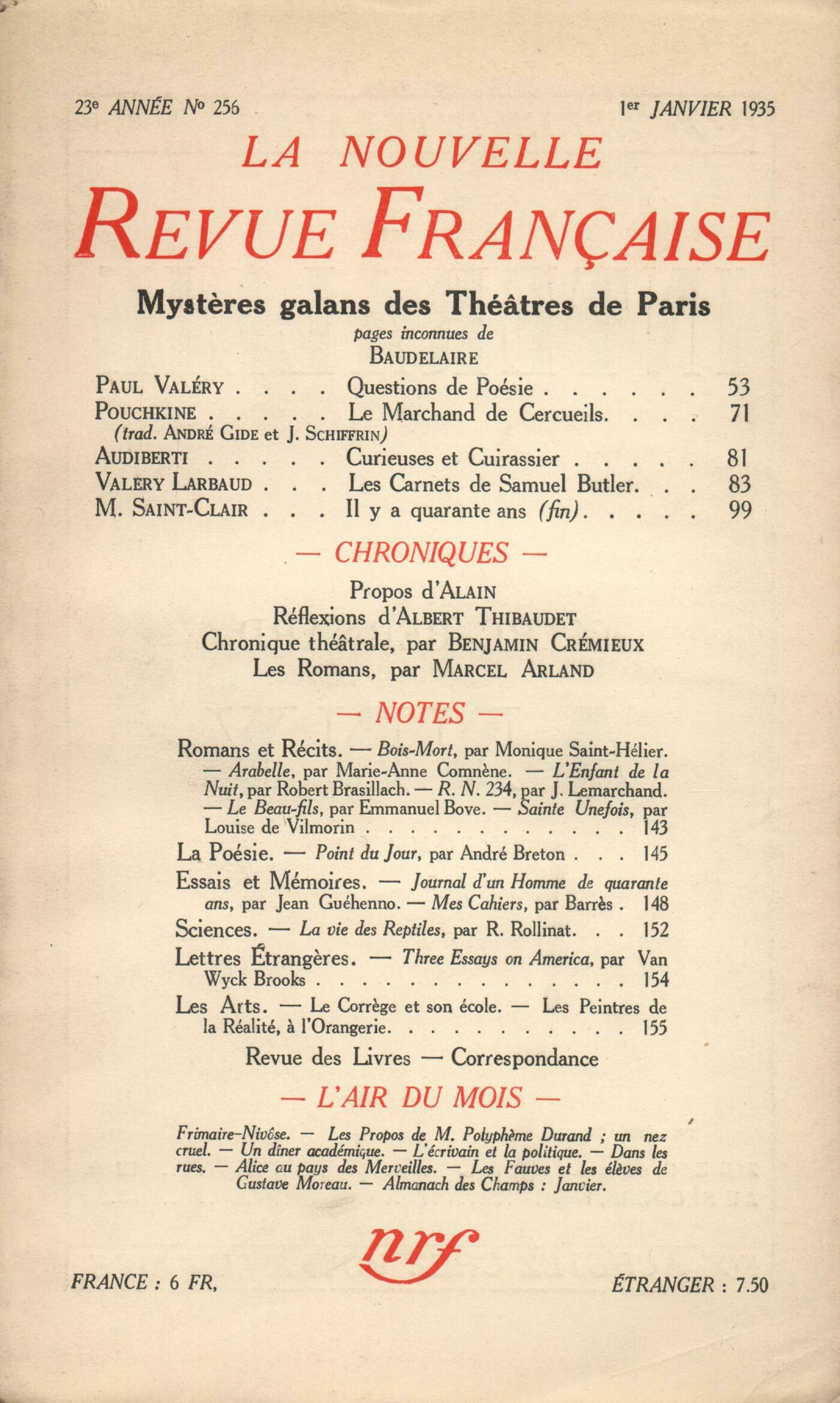 Jacques Crépet, Du Baudelaire inconnuCharles Baudelaire, Mystčres galans des théâtres de ParisPaul Valéry, Questions de PoésieAlexandre Pouchkine, Le marchand de cercueilsJacques Audiberti, Curieuses et cuirassierValery Larbaud, Les Carnets de Samuel ButlerM. Saint-Clair, Il y a quarante ans (Fin) Alain, ProposRéflexions : Albert Thibaudet, Les QuatreChronique dramatique : Benjamin Crémieux, Idylle et révolutionChronique des romans : Marcel Arland, Bois-Mort, par Monique Saint-Hélier - Arabelle, par Marie-Anne Comnčne - L'Enfant de la Nuit, par Robert Brasillach - R. N. 234, par Jacques Lemarchand - Le Beau-Fils, par Emmanuel BoveNotes : le roman : Jean Cocteau, Sainte-Unefois, par Louise de Vilmorin (Éditions de la N. R. F.)Notes : la poésie : A. Rolland de Renéville, Point du Jour, par André Breton (Éditions de la N. R. F.)Notes : essais et mémoires : André Malraux, Journal d'un homme de quarante ans, par Jean Guéhenno (Grasset)Jean Grenier, Mes cahiers, VIII, par Maurice BarrčsNotes : sciences : Jean Rostand, La vie des reptiles, par Raymond Rollinat (Delagrave)Notes : lettres étrangčres : Robert de Saint-Jean, Three essays of America, par Van Wyck Brooks (Dutton)Notes : les arts : André Lhote, Dessins du Corrčge et de son École - Les Ťpeintres de la réalitéť ŕ l'OrangerieRevue des livres : Denis Marion, Les Flambeurs d'hommes, par Marcel Griaule (Calmann-Lévy)Jean Guérin, La Bęte écarlate, par René Trintzius (Gallimard)Denis Marion, Un dur, par André Cayatte et Philippe Lamour (Nouvelles Éditions Latines) - Le procčs d'Oscar Wilde, par Hilary Pacq (N. R. F.)Boris de Schlzer, J.-S. Bach, par Julien Tiersot (Rieder)Correspondance : J. Pohl, Ŕ propos du Sonnet des VoyellesL'air du mois : Charles-Albert Cingria, Frimaire-NivoseTristan Derčme, Les Propos de M. Polyphčme Durand : D'un nez cruelJulien Benda, Banquet académique - L'écrivain et le politiqueEugčne Dabit, Dans les ruesAdrienne Monnier, Alice au pays des merveillesMarcel Arland, Les Fauves et les élčves de Gustave MoreauHenri Pourrat, Almanach des champs
