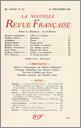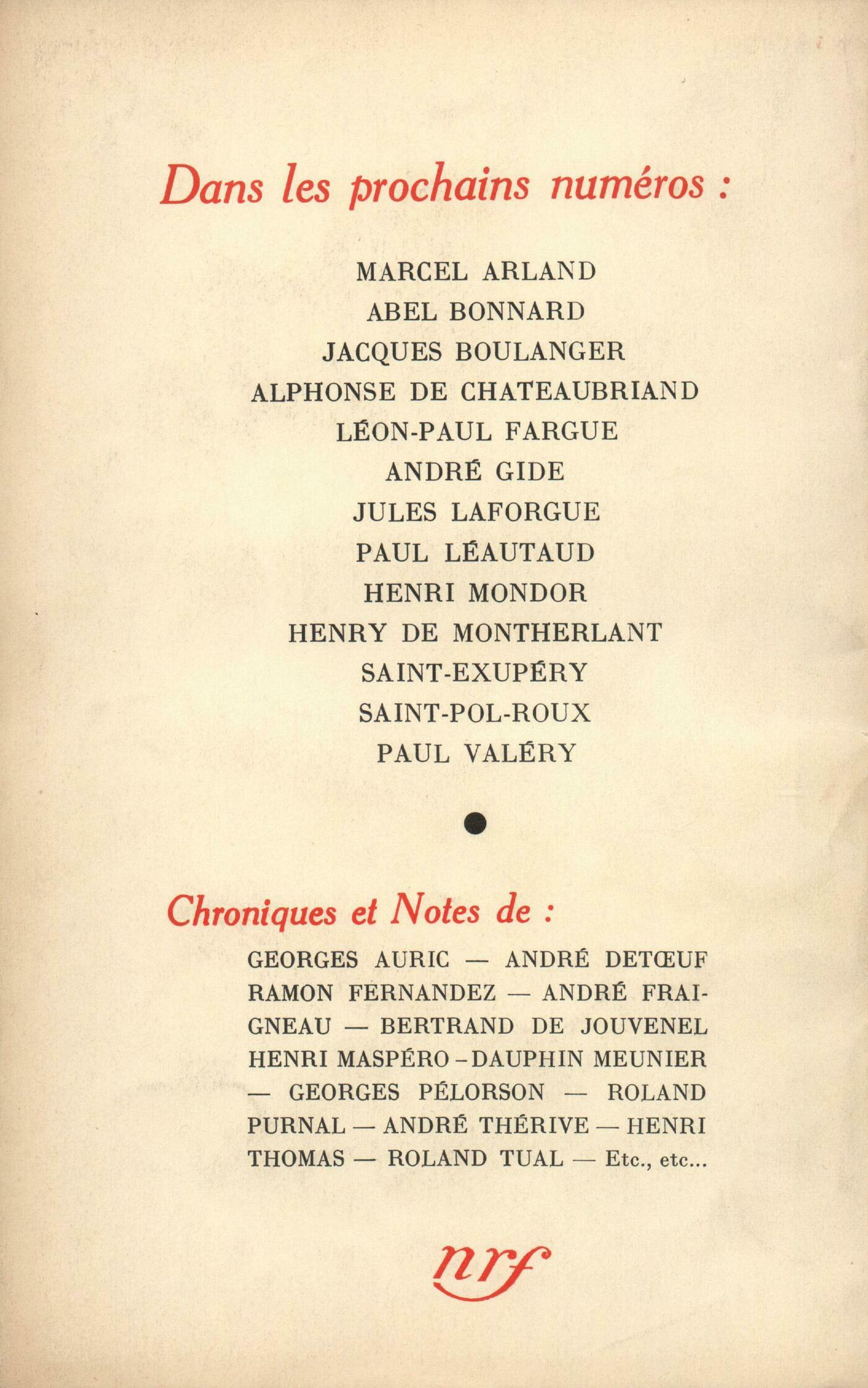 Pierre Drieu la Rochelle, Avant-proposJacques Chardonne, L'été ŕ La MaurieCharles Péguy, QuatrainsJacques Audiberti, PrisonArmand Robin, Temps passésMarcel Aymé, Les boîtes de peintureMarcel Jouhandeau, Les Enfants assistésJean Giono, Histoire des JasonAlfred Fabre-Luce, Lettre ŕ un AméricainPaul Morand, Le Festin de pierreAndré Gide, FeuilletsChroniques : Ramon Fernandez, Retour ŕ VauvenarguesChronique dramatique : Roland Purnal, La Grande Catherine, de Bernard Shaw (Théâtre de l'uvre) - L'Idiot du village, de R. Caillava (Théâtre des Arts)Chroniques : Alain, Vues sur le théâtreChronique musicale : Georges Auric, Reprise de Pelléas et Mélisande (Opéra-Comique)Notes : romans : André Fraigneau, Varouna, par Julien Green (Plon)Henri Thomas, Les inconnus dans la maison, par Simenon (Éditions de la N. R. F.) - Malempin, par Simenon (Éditions de la N. R. F.) - L'orange bleue, par Yassu Gauclčre (Éditions de la N. R. F.)Maurice Delarue, Le seau ŕ charbon, par Henri Thomas (Éditions de la N. R. F.)Notes : poésie : Pierre Drieu la Rochelle, Ma vie sans moi, par Armand Robin (Éditions de la N. R. F.)Notes : essais : André Thérive, Quand vivait mon pčre, par Léon Daudet (Grasset)Kléber Haedens, Au delŕ du nationalisme, par Thierry Maulnier (Éditions de la N. R. F.)Brice Parain, Logique et méthode chez Aristote, par J. M. Le Blond (Vrin)Notes : lettres étrangčres : Wladimir Weidlé, Die Entstehung des Historismus, par Friedrich Meinecke (Oldenbourg)Notes : correspondances : Claude Roy, Correspondance, I, de Paul Cambon (Grasset)André Thérive, Correspondance, de Louis Pasteur (Grasset)B. Rochot, Correspondance, du Pčre Marin MersenneNotes : les arts : Emmanuel Boudot-Lamotte, Permanence de la peintureLecture : Armand-M. Petitjean, Le moment de la honte