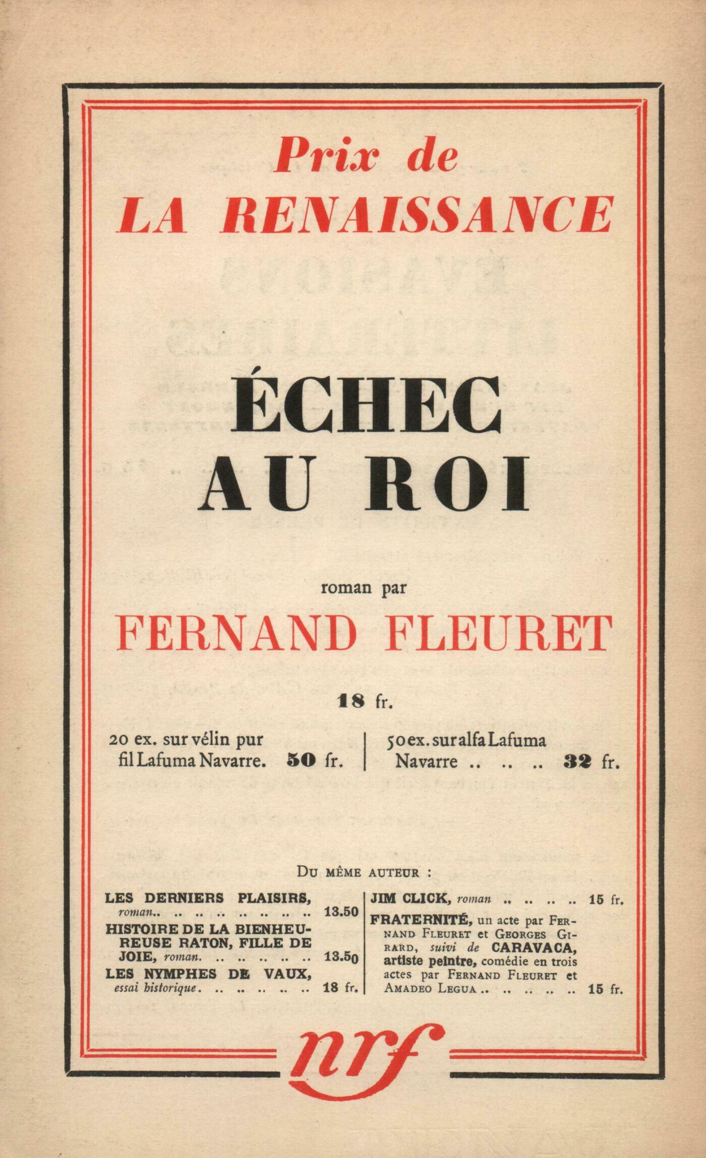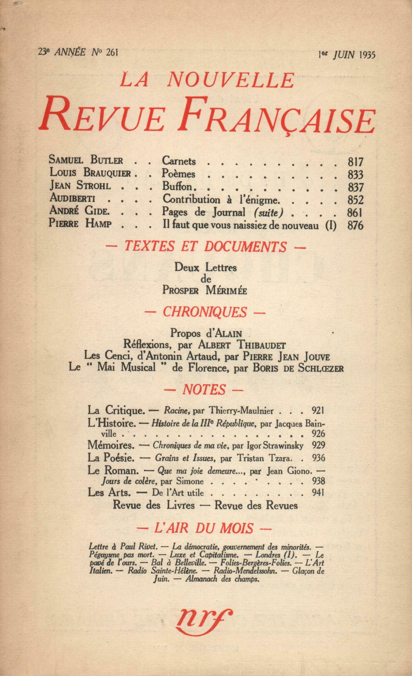 Samuel Butler, Carnets (Fragments)Louis Brauquier, PočmesJean Strohl, BuffonJacques Audiberti, Contribution ŕ l'énigmeAndré Gide, Pages de JournalPierre Hamp, Il faut que vous naissiez de nouveauProsper Mérimée, Deux lettres inédites Alain, ProposRéflexions : Albert Thibaudet, La fortune de la RépubliquePierre Jean Jouve, Les Cenci d'Antonin ArtaudChronique musicale : Boris de Schlzer, Le ŤMai musicalť de FlorenceNotes : la critique : Marcel Arland, Racine, par Thierry Maulnier (Redier)Notes : l'histoire : Julien Benda, La Troisičme République, par Jacques Bainville (Fayard)Notes : mémoires : Charles-Albert Cingria, Chroniques de ma vie, par Igor Strawinsky (Denoël et Steele)Notes : la poésie : A. Rolland de Renéville, Grains et Issues, par Tristan Tzara (Denoël et Steele)Notes : le roman : Marcel Arland, Que ma joie demeure, par Jean Giono (Grasset) - Jours de colčre, par Simone (Plon)Notes : les arts : André Lhote, De l'art utileRevue des livres : A. Rolland de Renéville, Anquetil-Duperron, par Raymond Schwab (Leroux)Henri Pourrat, Au cabaret des oiseaux, par Guy de La Mothe (Tours, Renart pendu) - Passage de la ligne, par Édouard Peisson (Grasset)Jean Vaudal, Maripepa, par Raymond Escholier (Albin Michel) Étiemble, Le ręve du Millet Jaune (Desclée de Brouwer)Les revues : Federico García Lorca, La Femme adultčreAndré Gide, Réponse ŕ Jean Schlumberger Collectifs, Adresse ŕ Thomas MannL'air du mois : Julien Benda, D'un nouveau PartiJean Grenier, La démocratie, gouvernement des minoritésJean Guérin, ŤPéguysme pas mortťPierre Hamp, Luxe et capitalismeFernand Léger, LondresAndré Gide, Le pavé de l'oursEugčne Dabit, Un bal ŕ BellevilleAdrienne Monnier, Folies-Bergčre-FoliesAndré Lhote, L'art italien de Cimabue ŕ TiepoloPierre Abraham, Radio Sainte-Hélčne - Radio-MendelssohnTristan Derčme, Les propos de M. Polyphčme Durand : Glaçon de juinHenri Pourrat, Almanach des champs