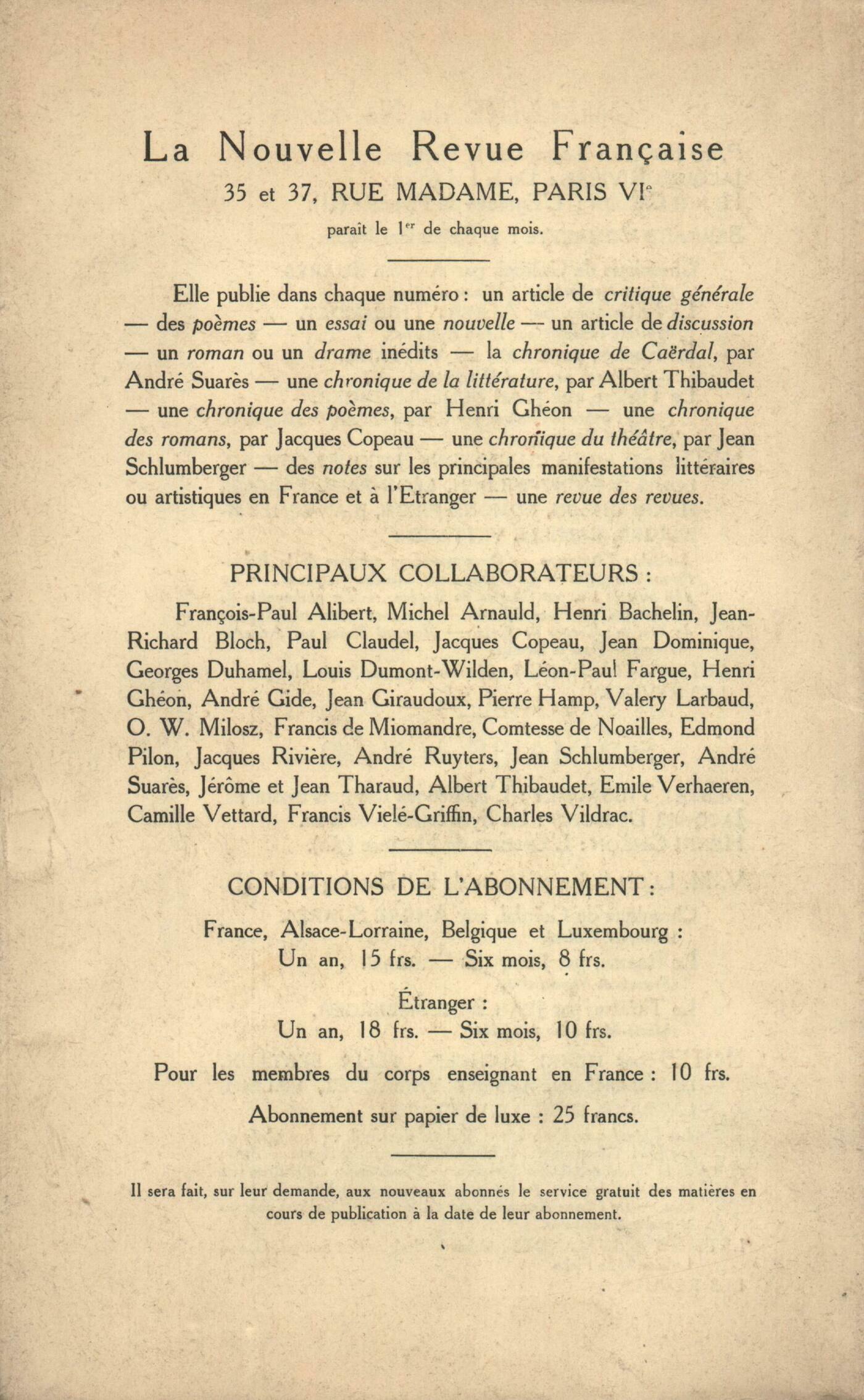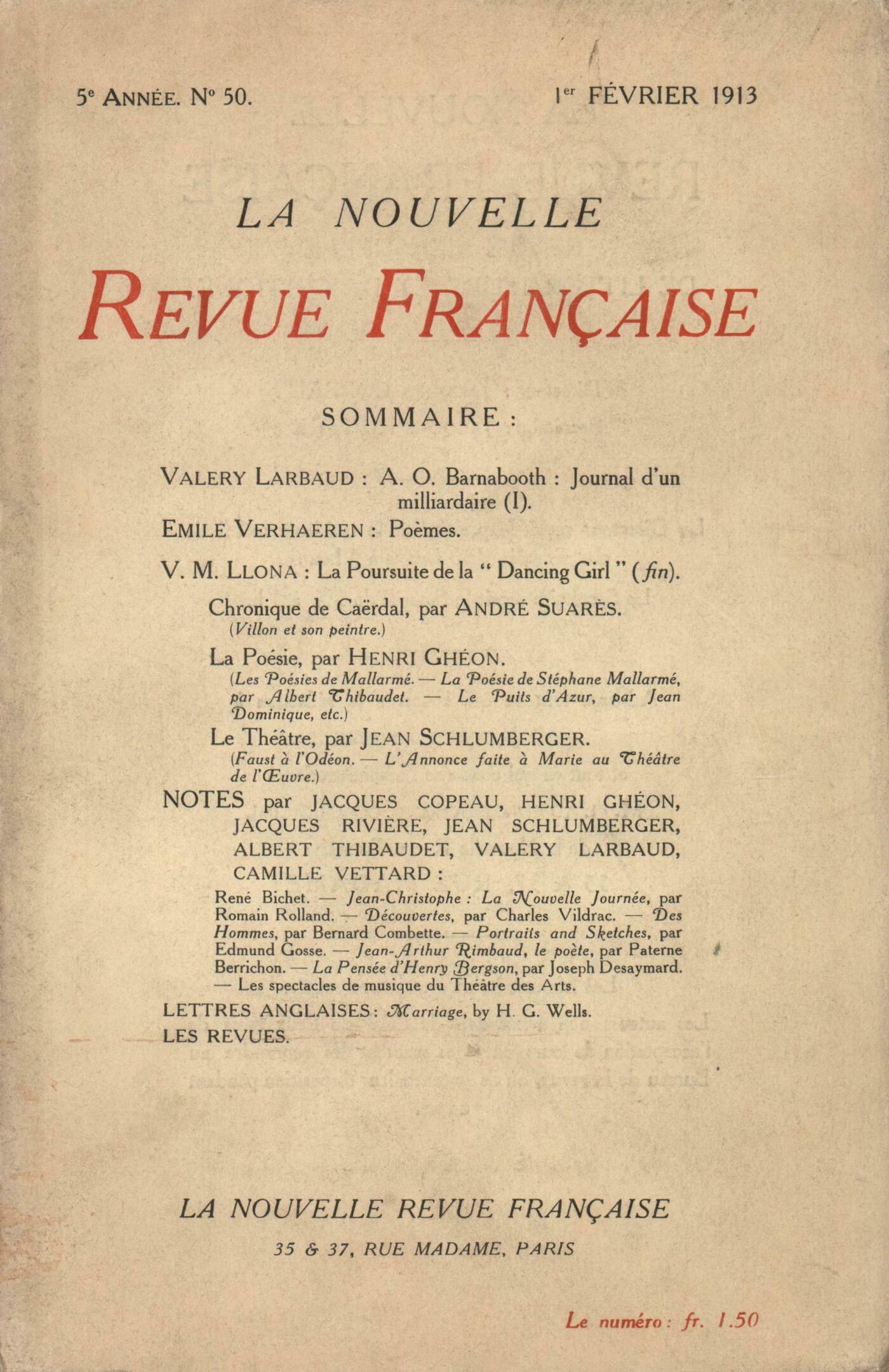 Valery Larbaud, A. O. Barnabooth : Journal d'un milliardaire (I)Émile Verhaeren, PočmesVictor Llona, La Poursuite de la ŤDancing Girlť (fin)Chronique de Caërdal : André Suarčs, Villon et son peintreChronique de la poésie : Henri Ghéon, Une édition complčte des Poésies de Mallarmé - La Poésie de Stéphane Mallarmé, par Albert Thibaudet - Le Puits d'Azur, par Jean Dominique - Toute mon âme, par Charles de Saint-Cyr - Décors et Chants, par Elsa Koeberlé - Présences, par P. J. Jouve - Les Apartés, par Henri Hertz - Apothéoses de météores, par Ch. A. Cantacuzčne - La Bohęme et mon cur, par Francis CarcoChronique du théâtre : Jean Schlumberger, Faust ŕ l'Odéon - L'Annonce faite ŕ Marie au Théâtre de l'uvreNotes : Jacques Rivičre, René BichetAlbert Thibaudet, Jean Christophe la Nouvelle Journée, par Romain RollandHenri Ghéon, Découvertes, par Charles Vildrac (Nouvelle Revue Française)Jacques Copeau, Des Hommes..., par Bernard Combette (Édition du Temps Présent)Jean Schlumberger, Portraits and Sketches, par Edmund Gosse (Heinemann)Jacques Rivičre, Jean-Arthur Rimbaud, le počte, par Paterne Berrichon (Mercure de France)Camille Vettard, La pensée d'Henri Bergson, par Joseph Desaymard (Mercure)Henri Ghéon, Deux Ťspectacles de musiqueť (Théâtre des Arts)Lettres anglaises : Valery Larbaud, Marriage, by H. G. Wells (Mac Millan)Revues : Anonymes, Revues Françaises - Revues étrangčres