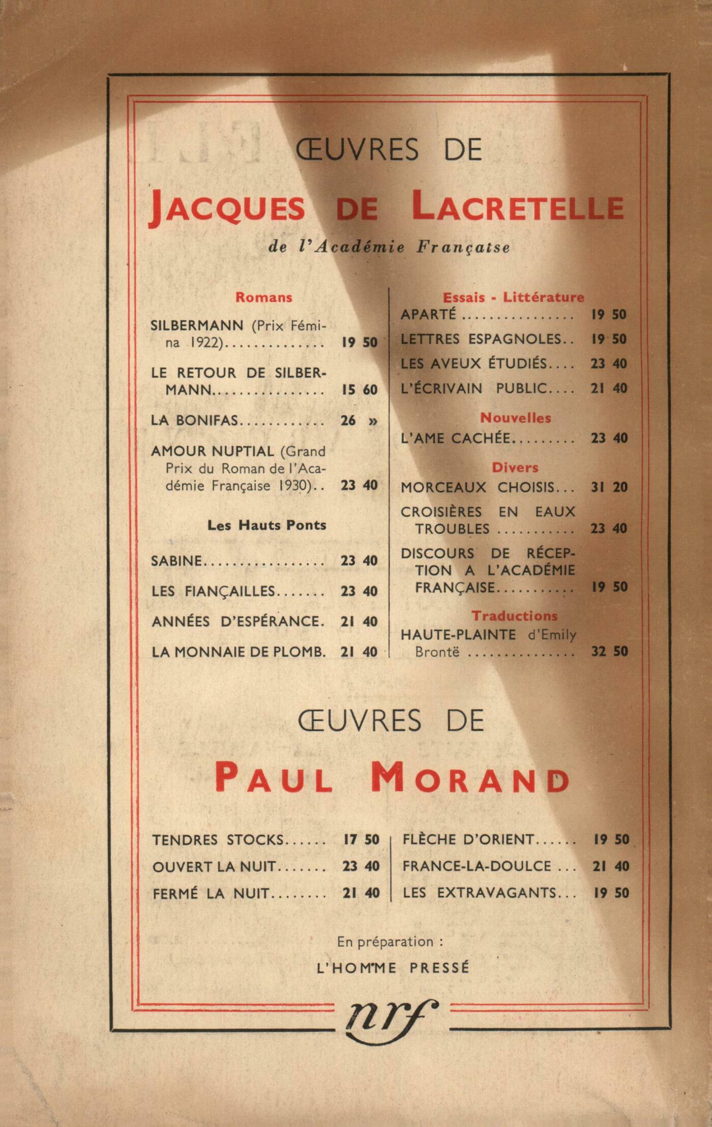 Marcel Jouhandeau, Minos et Moi ou Le carnet du chatClaude Vermorel, Marche de nuitBernard Fa˙, Caractčre de l'Esprit françaisJean Merrien, Une langue de citoyens français : le breton Alain, Les Aventures du CurRobert Francis, Caďn et AbelChroniques : Pierre Drieu la Rochelle, Ŕ certainsRamon Fernandez, De Melville ŕ GionoChronique des romans : Marcel Arland, Urujac, par Audiberti (Éditions de la N. R. F.) - Les Contes de Poindi, par Jean Mariotti - Paix sur les Champs, par Marie Gevers (Éditions Plon) - Port-Famine, par Jean Fréville (Flammarion)Chronique de la peinture : Jean Bazaine, Tour d'horizonChronique scientifique : Jean Rostand, Les étapes de la biologie, par Maurice Caullery (Presses Universitaires)Notes : poésie : Ramon Fernandez, Haute Solitude, par Léon-Paul FargueMaurice Chapelan, Audiberti, ou L'apprenti sorcierNotes : essais : A. Rolland de Renéville, Histoire de la littérature française contemporaine, I, II, par René Lalou (Presses Universitaires de France) - Mystiques de France, par Daniel-Rops (Corręa)Jacques Madaule, Ŕ propos de mystiqueAlfred Fabre-Luce, Montesquieu (Bernard Grasset) - Briand, V, par Georges Suarez (Plon)Fernand Lemoine, Notre avant-guerre, par Robert Brasillach (Plon) - L'Angleterre en guerre, par Georges Blond (Grasset) Anonymes, Revues - La honte de l'Institut