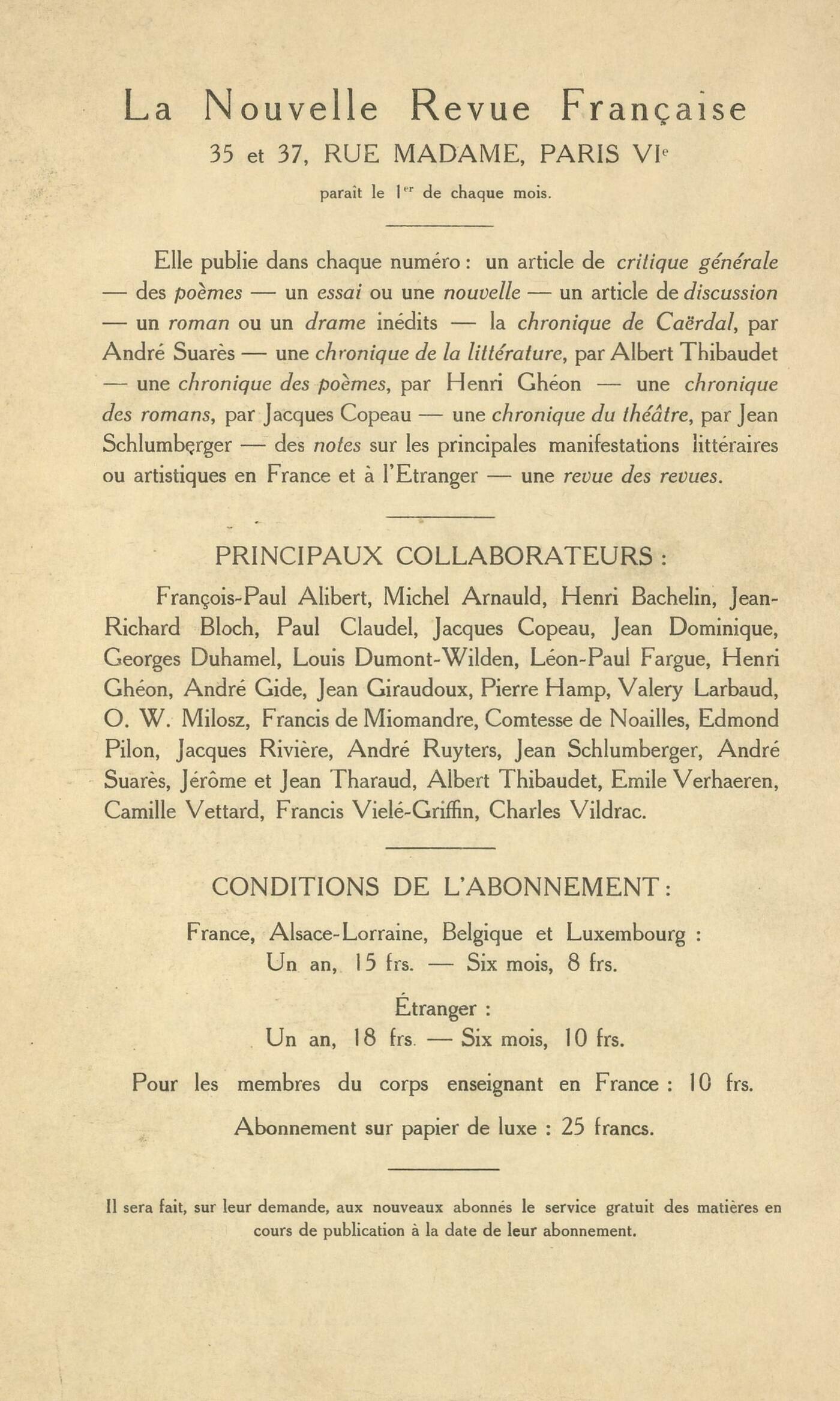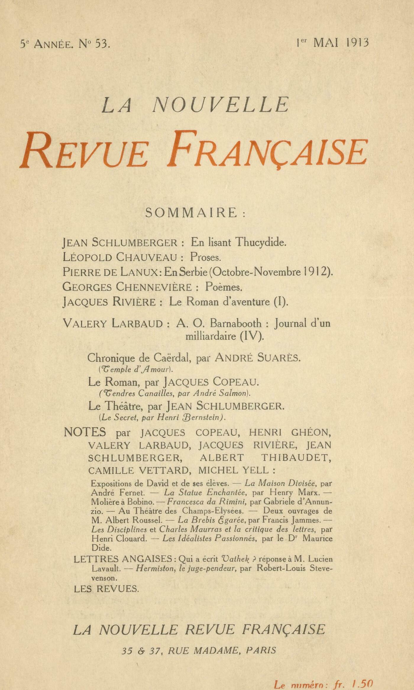 Jean Schlumberger, En lisant ThucydideLéopold Chauveau, ProsesPierre de Lanux, En Serbie (Octobre - novembre 1912)Georges Chennevičre, PočmesJacques Rivičre, Le Roman d'aventure (I)Valery Larbaud, A. O. Barnabooth : Journal d'un milliardaire (IV)Chronique de Caërdal : André Suarčs, Temple d'AmourChronique du roman : Jacques Copeau, Tendres Canailles, par André Salmon (Ollendorff)Chronique du théâtre : Jean Schlumberger, Le Secret, par Henri Bernstein (Bouffes Parisiens)Notes : Jacques Rivičre, Exposition de David et de ses élčves (Petit Palais des Champs Élysées)Jacques Copeau, La Maison Divisée, par André Fernet (Odéon) - La Statue Enchantée, par Henry Marx (Bernard Grasset) - Moličre ŕ BobinoJean Schlumberger, Francesca da Rimini, par Gabriele d'Annunzio (Calmann-Lévy)Henri Ghéon, Au Théâtre des Champs-Élysées - Deux ouvrages de M. Albert RousselJacques Copeau, La Brebis égarée de Francis Jammes (Théâtre de l'uvre)Albert Thibaudet, Les Disciplines, par Henri Clouard (Marcel Rivičre) - Charles Maurras et la critique des Lettres, par Henri Clouard (Nouvelle Librairie Nationale)Michel Yell, Les Idéalistes passionnés, par le docteur Maurice Dide (Félix Alcan)Lettres anglaises : Valery Larbaud, Qui a écrit Vathek ?, réponse ŕ M. Lucien LavaultCamille Vettard, Hermiston, le juge-pendeur, par Robert-Louis Stevenson (Fontemoing)Revues : Anonymes, Revues Françaises - Revues étrangčres