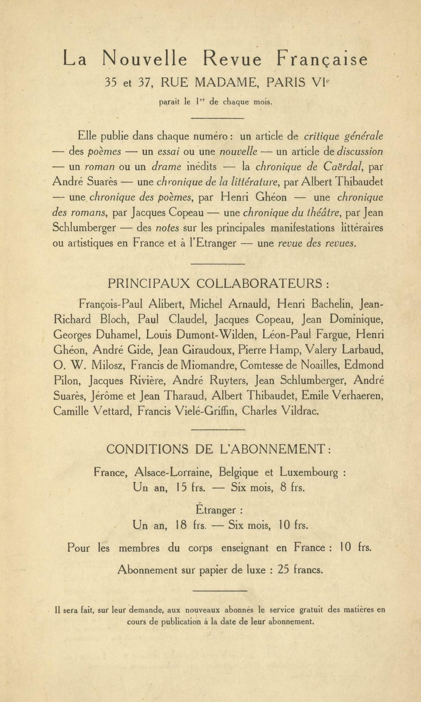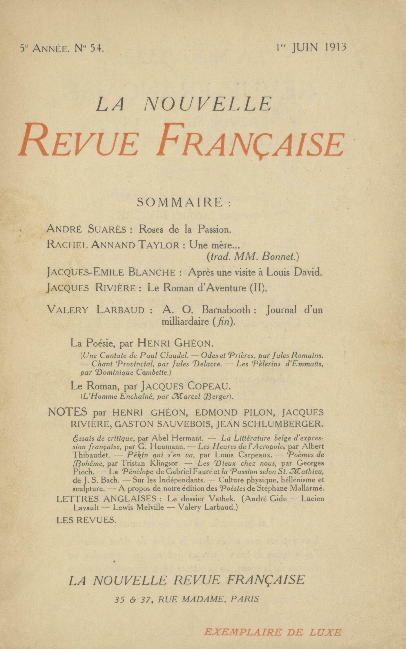 André Suarčs, Roses de la PassionRachel-Annand Taylor, Une mčre souhaite le bonheur de ses enfantsJacques-Émile Blanche, Aprčs une visite ŕ Louis DavidJacques Rivičre, Le Roman d'Aventure (II)Valery Larbaud, A. O. Barnabooth : Journal d'un milliardaire (fin)Chronique de la poésie : Henri Ghéon, Une cantate de Paul Claudel (Éd. de la Nouvelle Revue Française) - Odes et Pričres, par Jules Romains (Mercure de France) - Chant Provincial, par Jules Delacre (Eugčne Lamertin éd.) - Les Pčlerins d'Emmaüs, par Dominique Combette (Éd. du Temps Présent)Chronique du roman : Jacques Copeau, L'Homme Enchaîné, par Marcel Berger (G. Oudin et Cie, éd.)Notes : Jean Schlumberger, Essais de critique, par Abel Hermant (Bernard Grasset)Gaston Sauvebois, Le Mouvement littéraire belge d'expression française depuis 1880, par Albert Heuman (Mercure de France)Jean Schlumberger, Les Heures de l'Acropole, par Albert Thibaudet (Éd. de la Nouvelle Revue Française) - Pékin qui s'en va, par Louis Carpeaux (Maloine)Edmond Pilon, Počmes de Bohęme, par Tristan Klingsor (Mercure de France) - Les Dieux chez nous, par Georges Pioch (Ollendorff)Jacques Rivičre, La Pénélope de Gabriel Fauré (Théâtre des Champs-Élysées) - La Passion selon Saint-Mathieu de J. S. Bach (Théâtre des Champs-Élysées) - Sur les IndépendantsHenri Ghéon, Culture physique, hellénisme et sculptureE. et Genevičve Bonniot, Ŕ propos de notre édition des Poésies de Stéphane MallarméLettres anglaises : André Gide, Le Ťdossier Vathekť : lettre ŕ Valery LarbaudLucien Lavault, Le Ťdossier Vathekť : remarquesLewis Melville, Le Ťdossier Vathekť : une lettreValery Larbaud, Le Ťdossier Vathekť : remarquesRevues : Anonymes, Memento