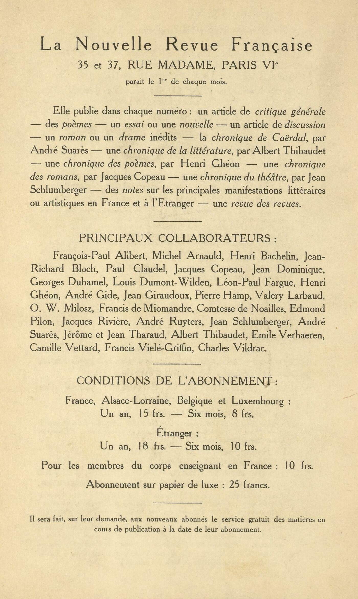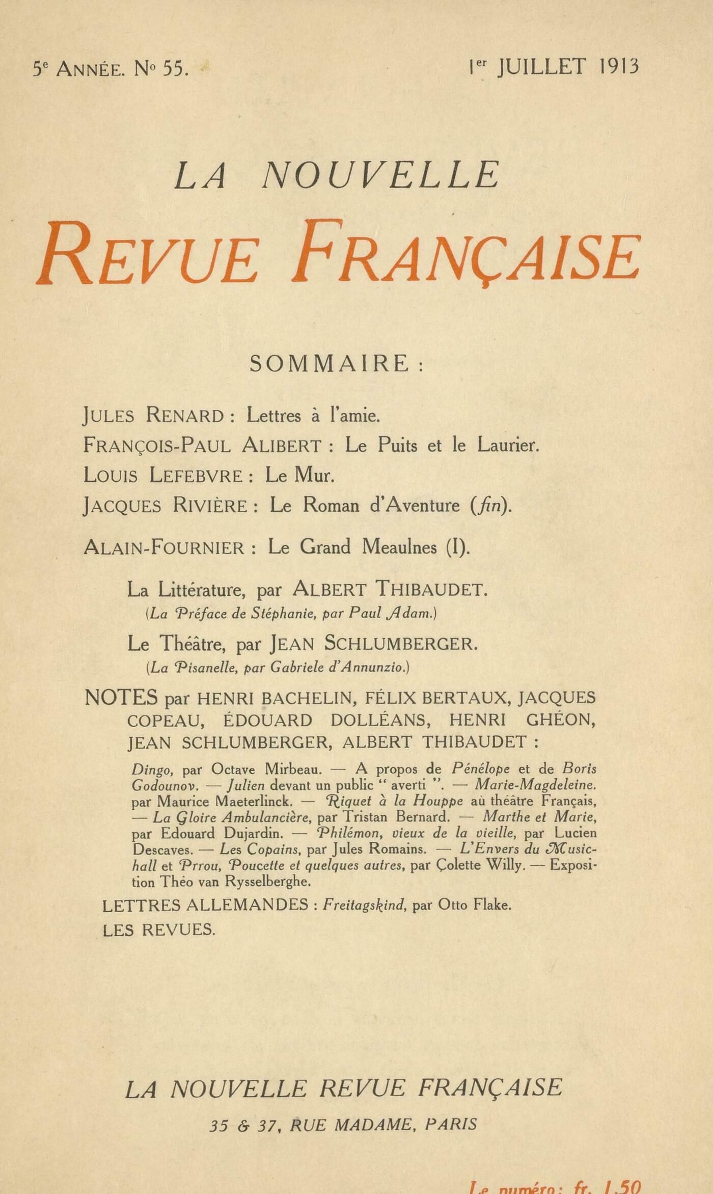 Jules Renard, Lettres ŕ l'amieFrançois-Paul Alibert, Le Puits et le LaurierLouis Lefebvre, Le MurJacques Rivičre, Le Roman d'Aventure (fin) Alain-Fournier, Le Grand Meaulnes (I)Chronique de la littérature : Albert Thibaudet, La Préface de Stéphanie, par Paul Adam (Fasquelle)Chronqiue du théâtre : Jean Schlumberger, La Pisanelle ou La Mort Parfumée, par Gabriele d'Annunzio (Théâtre du Châtelet)Notes : Jacques Copeau, Dingo, par Octave Mirbeau (Fasquelle)Henri Ghéon, Ŕ propos de Pénélope et de Boris Godounov. Réponse ŕ Jacques Rivičre et Pierre Lalo - Julien devant un public Ťavertiť (Opéra Comique)Jacques Copeau, Marie-Magdeleine, par Maurice Maeterlinck (Châtelet)Henri Ghéon, Riquet ŕ la Houppe (Théâtre Français)Jean Schlumberger, La Gloire ambulancičre, par Tristan Bernard (Comédie des Champs-Élysées)Henri Ghéon, Marthe et Marie, par Édouard Dujardin (Théâtre de l'uvre)Henri Bachelin, Philémon, vieux de la vieille, par Lucien Descaves (Ollendorff)Albert Thibaudet, Les Copains, par Jules Romains (Figuičre)Édouard Dolléans, L'Envers du music-hall, par Colette Willy (Flammarion) - Prrou, Poucette et quelques autres, par Colette Willy (Librairie des Lettres)Jean Schlumberger, Exposition Théo van Rysselberghe (Galerie Druet)Lettres allemandes : Félix Bertaux, Freitagskind, par Otto Flake (Fischer)