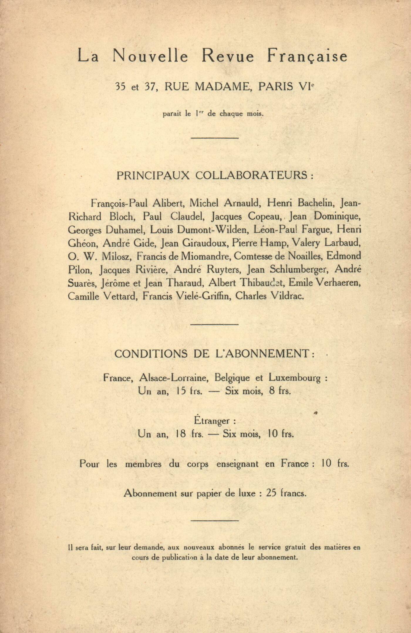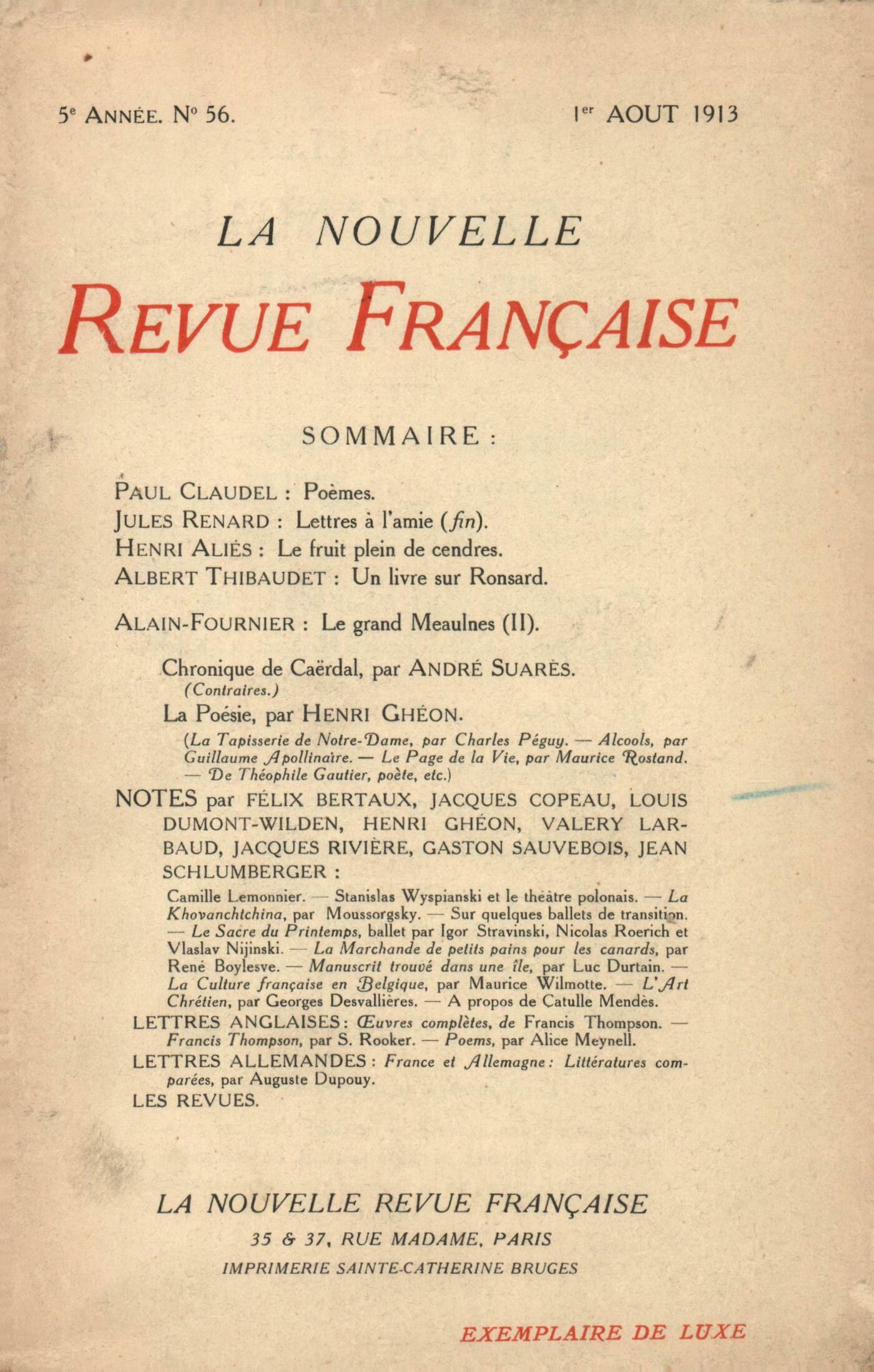 Paul Claudel, PočmesJules Renard, Lettres ŕ l'amie (fin)Henri Aličs, Le fruit plein de cendresAlbert Thibaudet, Un livre sur Ronsard Alain-Fournier, Le grand Meaulnes (II)Chronique de Caërdal : André Suarčs, ContrairesChronique de la poésie : Henri Ghéon, La Tapisserie de Notre-Dame, par Charles Péguy - Alcools, par Guillaume Apollinaire - Le Page de la Vie, par Maurice Rostand - De Théophile Gautier počte. Ŕ propos des poésies de M. J. L. Vaudoyer - L'Ombre qui tourne, par Marcel Drouët - Interludes, par René Chalupt - Une édition nouvelle des Cinq Grandes OdesNotes : Louis Dumont-Wilden, Camille LemonnierJacques Copeau, Stanislas Wyspianski et les représentations polonaisesJean Schlumberger, La Khovanchtchina de Moussorgski (Théâtre des Champs-Élysées)Henri Ghéon, Sur quelques ballets de transition (Daphnis et Chloé, la Tragédie de Salomé, Jeux)Jacques Rivičre, Le Sacre du Printemps, par Igor Stavinsky, Nicolas Rrich et Vlaslav Nijinski (Théâtre des Champs-Élysées)Henri Ghéon, La Marchande de petits pains pour les canards, par René Boylesve (Calmann-Lévy) - Manuscrit trouvé dans une île, par Luc Durtain (Georges Crčs et Cie)Gaston Sauvebois, La Culture française en Belgique, par Maurice Wilmotte (H. Champion)Henri Ghéon, Art chrétien, par Georges Desvalličres (Revue de la Jeunesse) - Devant le monument de Catulle MendčsLettres anglaises : Valery Larbaud, The Works of Francis Thompson (Burns and Oates) - Francis Thompson, by S. Rooker (Herbert et Daniel) - Poems, par Alice Meynell (Burns and Oates)Lettres allemandes : Félix Bertaux, France et Allemagne : littératures comparées, par Aug. Dupouy (Delaplane)Revues : Anonymes, Revues Françaises - Revues allemandes