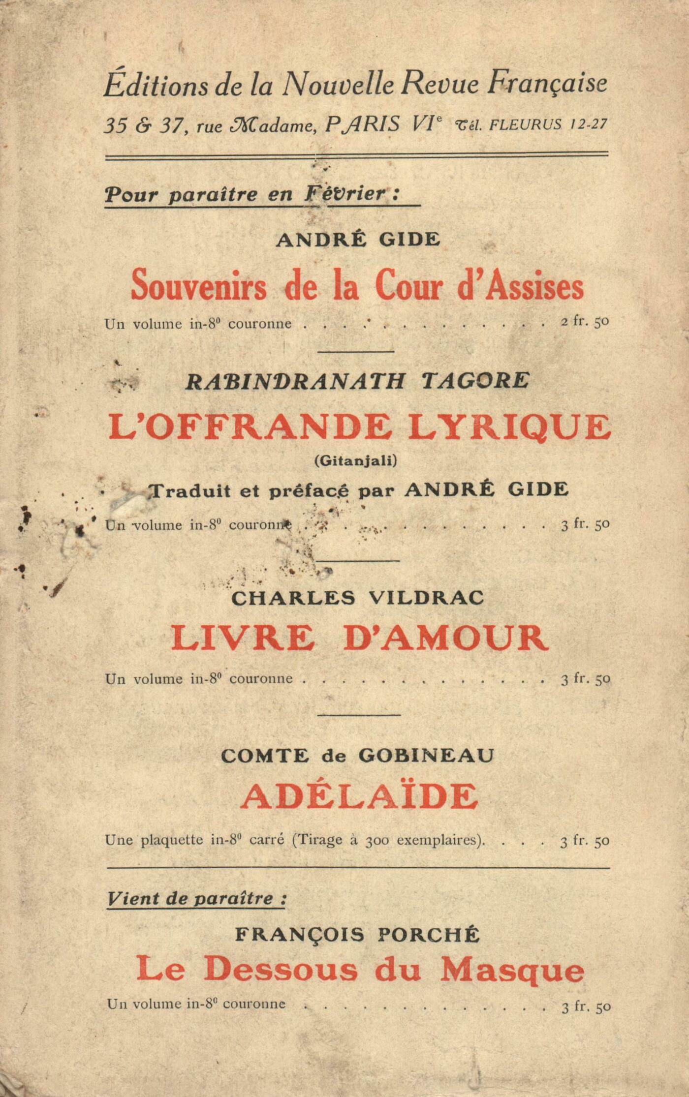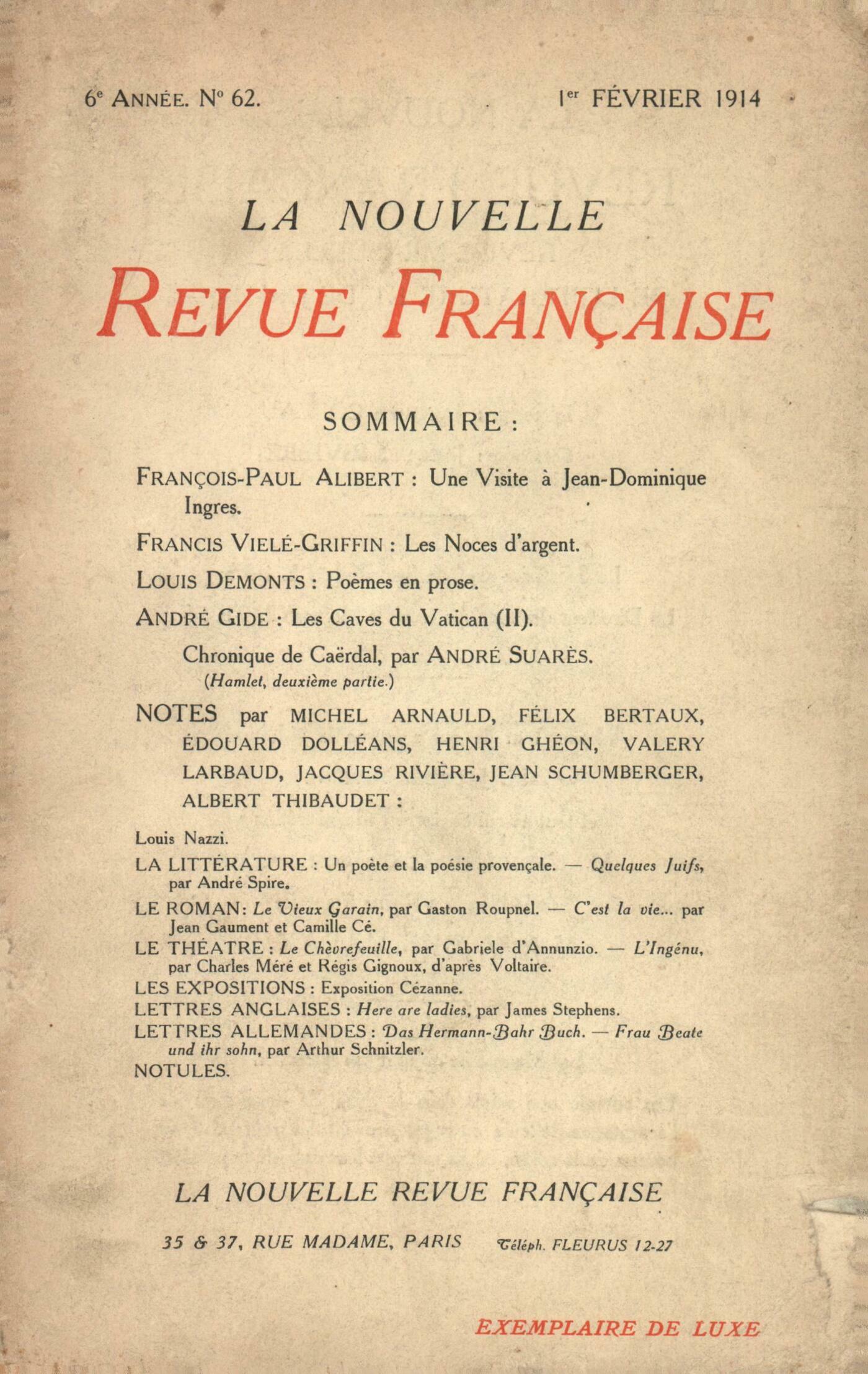 François-Paul Alibert, Une Visite ŕ Jean-Dominique IngresFrancis Viélé-Griffin, Les Noces d'argentLouis Demonts, Počmes en proseAndré Gide, Les Caves du Vatican (II)Chronique de Caërdal : André Suarčs, Hamlet (suite)Notes : Jean Schlumberger, Louis NazziAlbert Thibaudet, Un počte et la poésie provençaleMichel Arnauld, Quelques Juifs (Israël Zangwill, Otto Weininger, James Darmesteter), par André Spire (Mercure de France)Édouard Dolléans, Le Vieux Garain, par Gaston Roupnel (Fasquelle)Michel Arnauld, C'est la vie (dans la Province d'Hier), par Jean Gaument et Camille Cé (Ernest Figuičre)Henri Ghéon, Le Chčvrefeuille, par Gabriele d'Annunzio (Porte Saint-Martin) - L'Ingénu, par Charles Méré et Régis Gignoux (Théâtre Michel)Jacques Rivičre, Exposition Cézanne (Galerie Bernheim jeune)Lettres anglaises : Valery Larbaud, Here are Ladies, par James Stephens (Édition Tauchnitz)Lettres allemandes : Félix Bertaux, Das Hermann-Bahr-Buch (S. Fischer Verlag) - Frau Beate und ihr Sohn, par Arthur Schnitzler (S. Fischer Verlag)Notules : Anonymes, La Fille de l'Homme, par Maurice Quillot - Kaligouça, le Cur-Fidčle, par André Lichtenberger (Calmann-Lévy) - Essais de critique littéraire et philosophique, par René Gillouin (Bernard Grasset) - Études et recherches, par Albert de Bersaucourt (Mercure de France) - Le Trésor du tourisme : L'Italie septentrionale (dir. Christian Beck) (Mercure de France) - La Sculpture vénitienne, par Pierre de Bouchaud (Bernard Grasset) - Les Murs du temps (1e et 2e séries), par Alfred Capus (Bernard Grasset) - Maximes morales et immorales, par Étienne Rey (Bernard Grasset) - Les petites choses qui font plaisir qui vexent qui flattent, par Émile Berr (Bernard Grasset) - Au hasard de la vie, par Édouard Lockroy (Bernard Grasset)Michel Arnauld, Ombres françaises et visions anglaises, par le Comte d'Haussonville (Bernard Grasset)Albert Thibaudet, King Harald, par Luc Durtain (Georges Crčs) Anonymes, La voie sacrée, par Jules Laroche (B. Grasset)