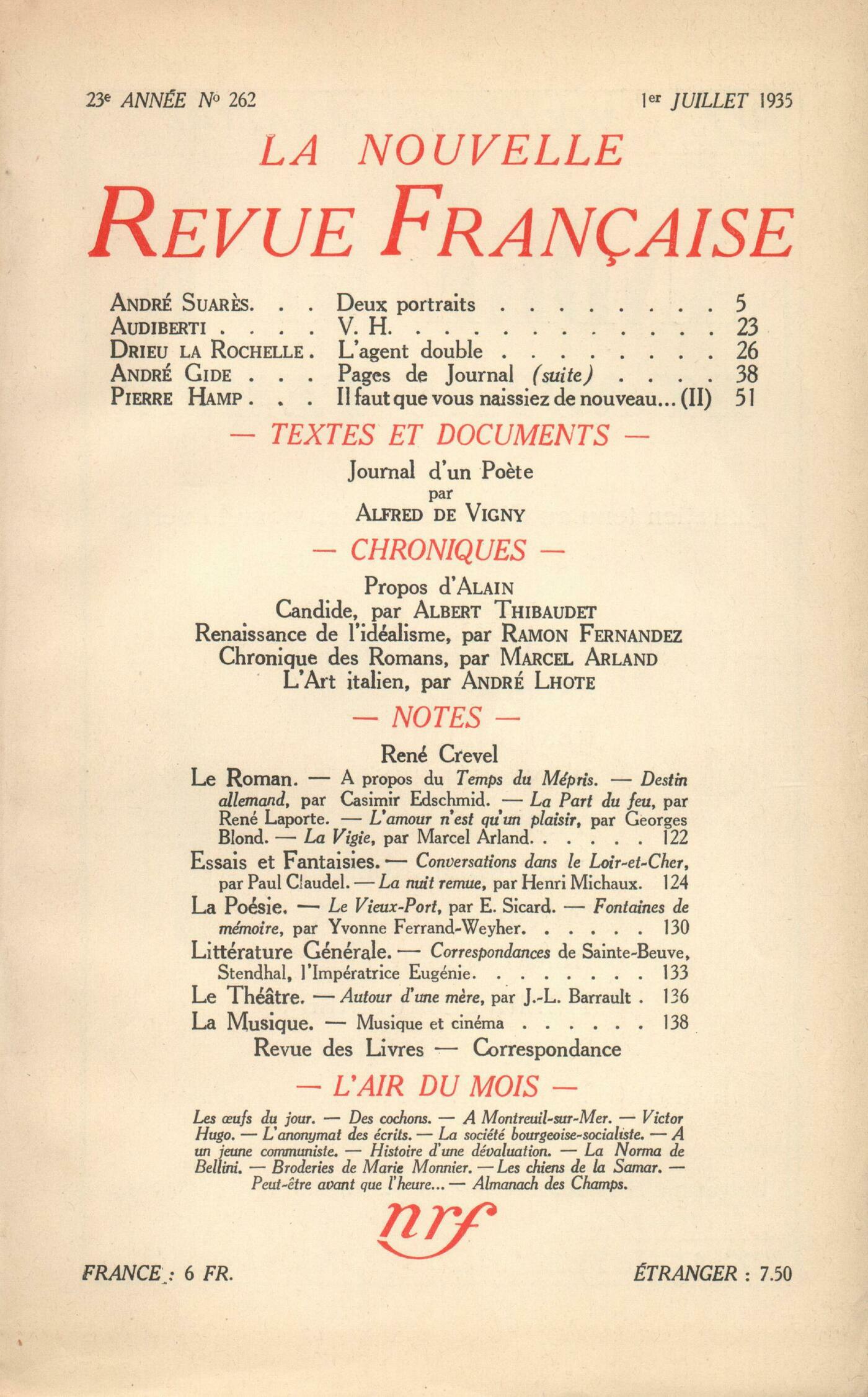 André Suarčs, Deux portraitsJacques Audiberti, V. H.Pierre Drieu la Rochelle, L'agent doubleAndré Gide, Pages de JournalPierre Hamp, Il faut que vous naissiez de nouveau... (II)Fernand Baldensperger, Avant-propos au Journal d'un počteAlfred de Vigny, Journal d'un počte Alain, ProposRéflexions : Albert Thibaudet, Candide?Ramon Fernandez, La renaissance de l'idéalismeChronique des romans : Marcel Arland, Ŕ propos du Temps du mépris, d'André Malraux - Destin allemand, par Kasimir Edschmid - La part du feu, par René Laporte - L'amour n'est qu'un plaisir, par Georges BlondAndré Lhote, L'art italien et les artistes françaisMarcel Jouhandeau, René CrevelNotes : le roman : Jean Vaudal, La Vigie, par Marcel Arland (Éditions de la N. R. F.)Notes : essais et fantaisies : Charles-Albert Cingria, Conversations dans le Loir-et-Cher, par Paul Claudel (Éditions de la N. R. F.)Pierre Leyris, La Nuit remue, par Henri Michaux (Éditions de la N. R. F.)Notes : la poésie : Jean Grenier, Le Vieux Port, par Émile Sicard (Cahiers du Sud) - Le Pilote, par Louis Brauquier (Mirages)Jean Guérin, Fontaines de mémoire, par Yvonne Ferrand-Weyher (Le Divan)Notes : littérature générale : Jean Prévost, Correspondance de Sainte-Beuve (Stock) - Correspondance de Stendhal (Le Divan) - Correspondance de l'impératrice Eugénie (Le Divan)Notes : le théâtre : Antonin Artaud, Autour d'une mčre, de Jean-Louis Barrault (Théâtre de l'Atelier)Notes : la musique : Boris de Schlzer, Musique et cinémaRevue des livres : Marc Bernard, Les damnés de la terre, par Henry Poulaille (Grasset)Ramon Fernandez, Le péché du monde, par Maxence Van der Meersch (Albin Michel)Jean Guérin, La Treizičme Heure, par Élisabeth de Gramont (Grasset)Correspondance : André Gide, Lettre ŕ Albert ThibaudetL'air du mois : Samuel Butler, Devant Doctor's Commons - Des ufs du jour - La traversée de la Manche - Des cochons - Ŕ Montreuil-sur-MerJean Guérin, Cinquantenaire de V. H.Julien Benda, L'anonymat des écritsPierre Hamp, La société bourgeoise-socialisteJulien Benda, Ŕ un jeune communisteDenis Marion, Histoire d'une dévaluationBoris de Schlzer, La Norma de BelliniRené Daumal, Les broderies de Marie MonnierAdrienne Monnier, Les chiens de la SamarTristan Derčme, Les Propos de M. Polyphčme Durand : ŤPeut-ętre, avant que l'heure...ťHenri Pourrat, Almanach des champs