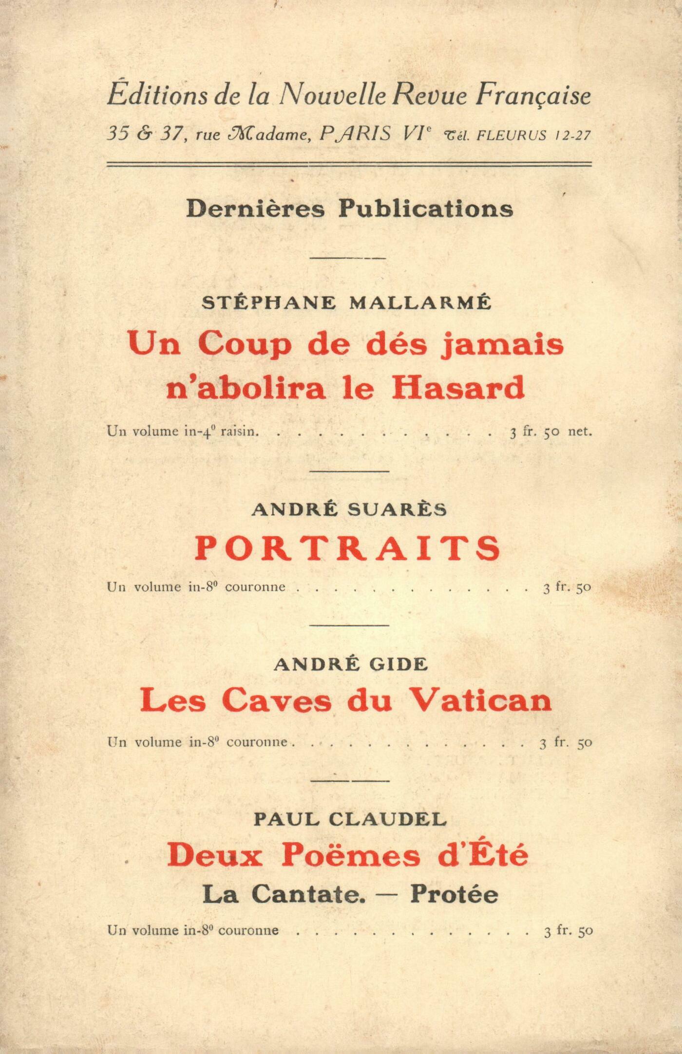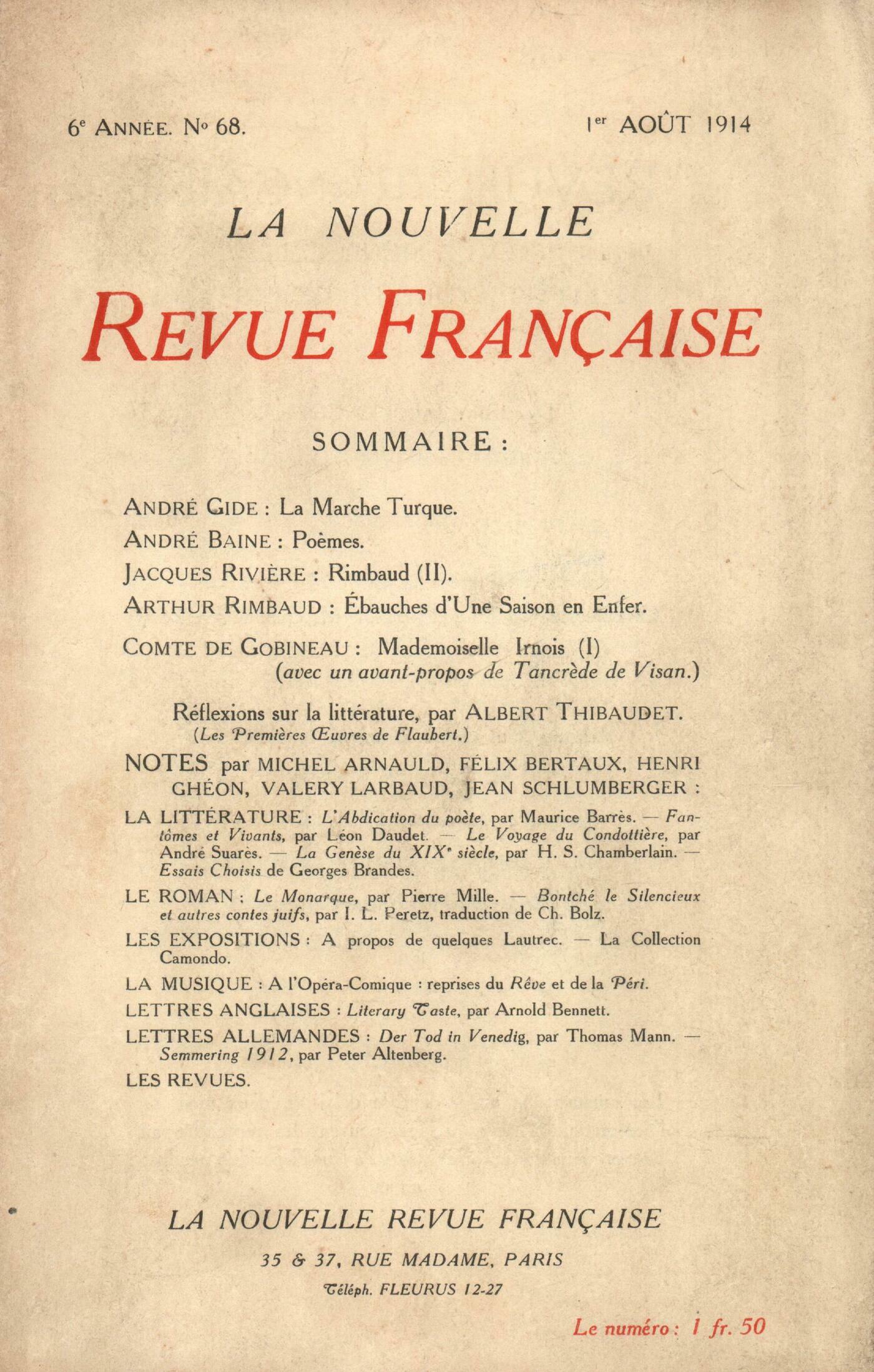André Gide, La Marche TurqueAndré Baine, PočmesJacques Rivičre, Rimbaud (II)Arthur Rimbaud, Ébauches d'Une Saison en EnferTancrčde de Visan, Avant-proposArthur de Gobineau, Mademoiselle Irnois (I)Réflexions sur la littérature : Albert Thibaudet, Premičres uvres, par Gustave Flaubert (Fasquelle)Notes : Michel Arnauld, L'Abdication du Počte, par Maurice Barrčs (Georges Crčs)Albert Thibaudet, Fantômes et Vivants, par Léon Daudet (Nouvelle Librairie Nationale) - Voyage du Condottičre, par André Suarčs (Émile-Paul) - La genčse du XIXe sičcle, par Houston-Steward Chamberlain (Payot) - Essais choisis, par Georges Brandčs (Mercure de France)Michel Arnauld, Le Monarque, par Pierre Mille (Calmann-Lévy) - Bontché le Silencieux et autres contes juifs, par Isaac Leibusch PeretzHenri Ghéon, Ŕ propos de quelques Lautrec (Galerie Manzi)Jean Schlumberger, La collection CamondoHenri Ghéon, Ŕ l'Opéra-Comique : reprise du Ręve et de la PériLettres anglaises : Valery Larbaud, Literary Taste, par Arnold BennettLettres allemandes : Félix Bertaux, Der Tod in Venedig, par Thomas Mann (S. Fischer) - Semmering 1912, de Peter Altenberg (S. Fischer)