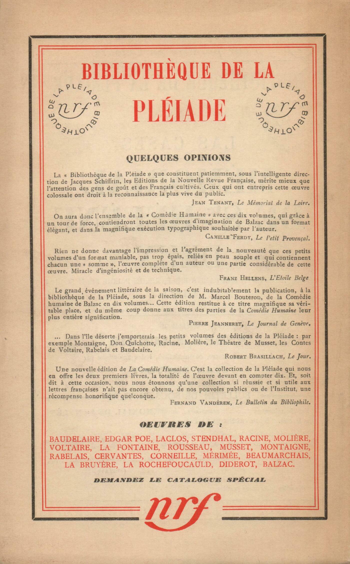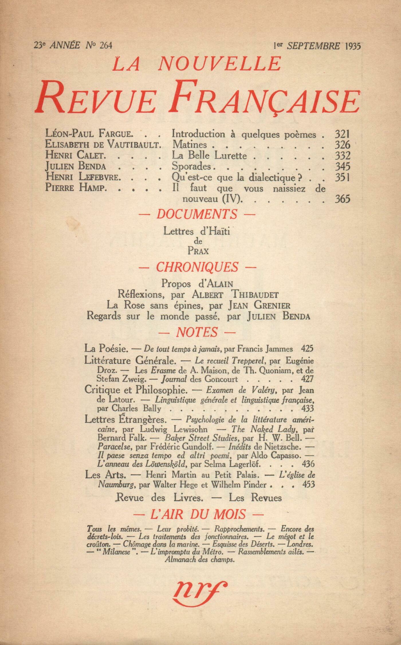 Léon-Paul Fargue, Introduction ŕ quelques počmesÉlisabeth de Vautibault, PočmesHenri Calet, La Belle LuretteJulien Benda, Sporades (II)Henri Lefebvre, Qu'est-ce que la dialectique?Pierre Hamp, Il faut que vous naissiez de nouveau (IV)Jean Prax, Lettres d'Haďti Alain, ProposRéflexions : Albert Thibaudet, Un tricentenaireJean Grenier, La Rose sans épinesScholies : Julien Benda, Regards sur le monde passéNotes : la poésie : Émilie Noulet, De tout temps ŕ jamais, par Francis Jammes (Éditions de la N. R. F.)Notes : littérature générale : Charles-Albert Cingria, Le Recueil Trepperel, par Eugénie Droz (Librairie Droz)Bernard Groethuysen, Érasme, par Albert Maison (Gallimard) - Érasme, par Th. Quoniam (Desclée de Brouwer) - Érasme, grandeur et décadence d'une idée, par Stefan Zweig (Grasset) - uvres, I, II, III, d'Érasme (Ŕ l'enseigne du Pot cassé)Léon Deffoux, Journal, I, II, des Goncourt (Flammarion et Fasquelle)Notes : critique et philosophie : Jean Wahl, Examen de Valéry, par Jean de Latour (Gallimard)René Daumal, Linguistique générale et linguistique française, par Ch. Bally (Leroux)Notes : lettres étrangčres : Maurice-Edgar Coindreau, Psychologie de la littérature américaine, par Ludwig Lewisohn (Rieder)Georges Lafourcade, The Naked Lady ou La vie d'Adah Isaacs Menken, par Bernard Falk (Hutchinson) - Baker Street Studies (Constable)Denis de Rougemont, Paracelse, par Frédéric Gundolf (Je sers)Jean Prévost, Les inédits de NietzscheJean Wahl, Ŕ la Nuit et autres počmes, par Aldo Capasso (Mirages) - Il paese senza tempo ed altri poemi, par Aldo Capasso (La Prora) - Saper distinguere, par Aldo Capasso (Emiliano degli Orfini)Émilie Noulet, L'Anneau des Lowensköld, de Selma Lagerlöf (Je sers)Notes : les arts : André Lhote, Henri Martin au Petit PalaisAntonin Artaud, L'Église de Naumburg, par Walter Hege et Wilhelm Pinder (Deutscher Kunstverlag)Revue des livres : Marcel Caster, La Cité perdue, par Henri Pourrat (Éditions Spes)Henri Pourrat, Le Počme de la Sainte Liturgie, par Maurice Zundel (Desclée de Brouwer)Marcel Caster, Contrée de l'espoir, par Noël-Jeandet (Hors commerce)René Daumal, L'évolution du sens des mots depuis le XVIe sičcle, par Edmond HuguetRevue des revues : Georges Pelorson, L'Année PoétiqueDenis de Rougemont, Recherches philosophiquesJean Guérin, MémentoL'air du mois : Julien Benda, Tous les męmes - Leur probité - RapprochementsL. Rivier, Encore des décrets-loisJean Prévost, Les traitements des fonctionnairesPierre Hamp, Le mégot et le croutonPaul Souffron, Chômage dans la marineAdrienne Monnier, Esquisse des DésertsFernand Léger, Londres (Fin)Pierre Marois, ŤMilaneseťTristan Derčme, Les propos de M. Polyphčme Durand : L'impromptu du métroJacques Delamain, Rassemblements ailésHenri Pourrat, Almanach des champs