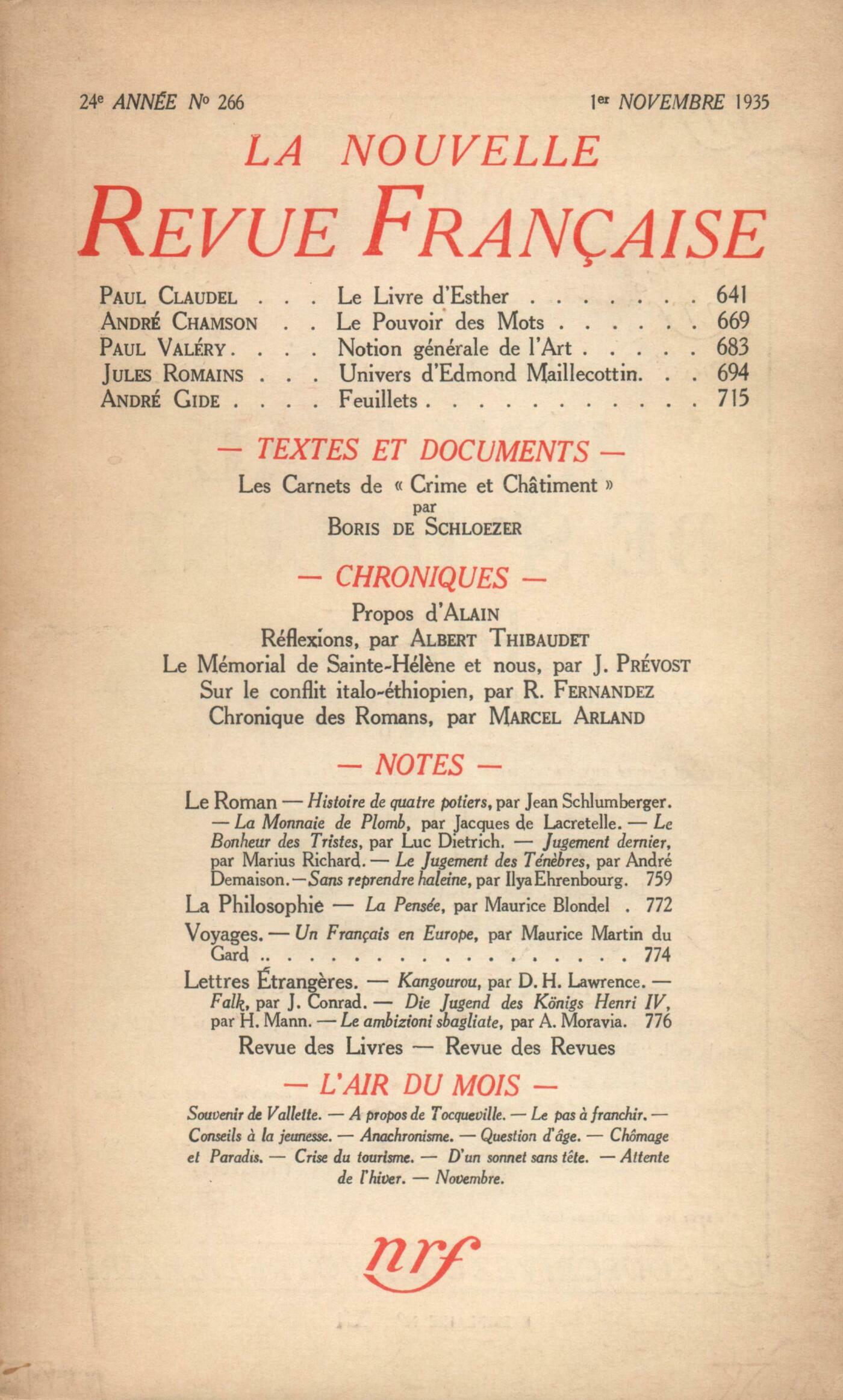 Paul Claudel, Le Livre d'EstherAndré Chamson, Le pouvoir des motsPaul Valéry, Notion générale de l'artJules Romains, Univers d'Edmond MaillecottinAndré Gide, Feuillets retrouvésBoris de Schlzer, Les carnets de Crime et Châtiment Alain, ProposRéflexions : Albert Thibaudet, Une VoléeJean Prévost, Le Mémorial de Sainte-Hélčne et nousRamon Fernandez, Remarques sur le conflit italo-éthiopienChronique des romans : Marcel Arland, Histoire des Quatre Potiers, par Jean Schlumberger - La monnaie de plomb, par Jacques de Lacretelle - Le bonheur des tristes, par Luc Dietrich - Jugement dernier, par Marius RichardNotes : le roman : Émilie Noulet, Le jugement des ténčbres, par André Demaison (Grasset)André Malraux, Sans reprendre haleine, par Ilya Ehrenbourg (Éditions de la N. R. F.)Notes : la philosophie : Ramon Fernandez, La pensée, par Maurice Blondel (Alcan)Notes : voyages : Henri Pourrat, Un Français en Europe, par Maurice Martin du Gard (Flammarion)Notes : lettres étrangčres : Denis Marion, Kangourou, par D. H. Lawrence (Éditions de la N. R. F.)Jean Vaudal, Falk, par Joseph Conrad (Éditions de la N. R. F.)Félix Bertaux, Die Jugend des Königs Henri Quatre, par Heinrich Mann (Querido)Benjamin Crémieux, Le Ambizioni Sbagliate, par Alberto Moravia (Mondadori)Revue des livres : Henri Pourrat, Ŕ l'amie dormante, par Mélot du Dy (Denoël et Steele)Eugčne Dabit, La Vache enragée, par George Orwell (N. R. F.)Revue des revues : Anonymes, Les ŤAmis de Charles-Louis Philippeť - Pour rendre un théâtre ŕ CopeauL'air du mois : Adrienne Monnier, Un souvenir d'Alfred ValletteAndré Gide, LecturesJulien Benda, Le pas ŕ franchir - Conseils ŕ la jeunesseCharles-Albert Cingria, AnachronismeJean Prévost, Question d'âge (Suite)Pierre Hamp, Chômage et paradisAndré Lhote, Crise du tourismeTristan Derčme, Les Propos de M. Pholyphčme Durand : D'un sonnet sans tęteJacques Delamain, Attente de l'hiverHenri Pourrat, Almanach des champs