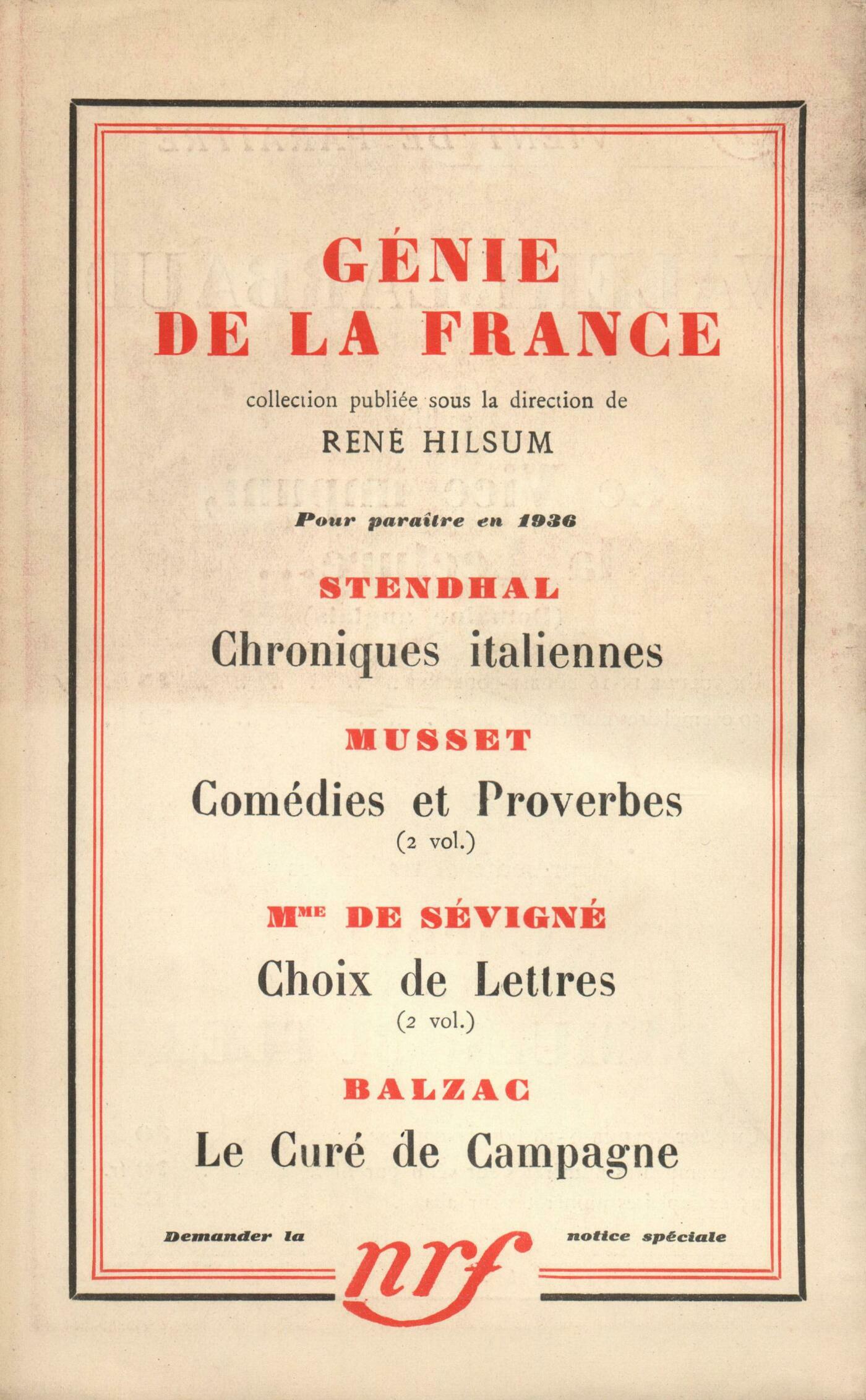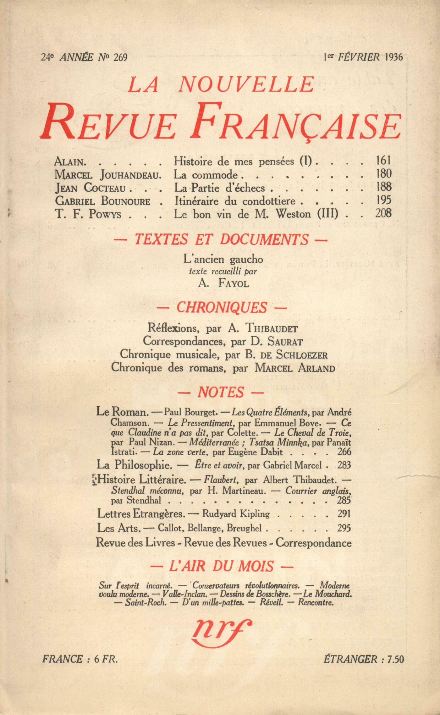 Alain, Histoire de mes pensées (I)Marcel Jouhandeau, La commode ou Je suis héritičre de mon petit-filsJean Cocteau, La Partie d'échecsGabriel Bounoure, Itinéraire du CondottiereTheodore Francis Powys, Le bon vin de M. Weston (III)André Fayol, L'ancien gauchoRéflexions : Albert Thibaudet, Cinéma et littératureDenis Saurat, Baudelaire, Rimbaud, la CabaleChronique musicale : Boris de Schlzer, Sur les concerts d'orgueChronique des romans : Marcel Arland, Paul Bourget - Les Quatre Éléments, par André Chamson - Le Pressentiment, par Emmanuel BoveNotes : le roman : Émilie Noulet, Ce que Claudine n'a pas dit, par Colettte (Ferenczi)Jean Vaudal, Le Cheval de Troie, par Paul Nizan (Éditions de la N. R. F.)Henri Calet, Tsatsa-Minnka, par Panaďt Istrati (Rieder) - Méditerranée, par Panaďt Istrati (Rieder)Marc Bernard, La Zone Verte, par Eugčne Dabit (Éditions de la N. R. F.)Notes : la philosophie : Bernard Groethuysen, Ętre et avoir, par Gabriel Marcel (Ferdinand Aubier)Notes : histoire littéraire : Léon Bopp, Gustave Flaubert, par Albert Thibaudet (Éditions de la N. R. F.)Pierre Ličvre, Stendhal méconnu, par Henri Martineau (Les Terrasses de Lourmarin)Jean Prévost, Courrier anglais, par Stendhal (Le Divan)Notes : lettres étrangčres : Pierre Abraham, Rudyard KiplingNotes : les arts : André Lhote, Callot, Bellange, BreughelRevue des livres : Auguste Bréal, Introduction ŕ la peinture hollandaise, par Paul Claudel (N. R. F.)Jean Guérin, Mythologie générale (Larousse) Étiemble, Staline, par Boris Souvarine (Plon)Revue des revues : Alain, ŤCet art n'était pas le mienť Anonymes, MémentoL'air du mois : Denis de Rougemont, Sur l'esprit incarnéPierre Hamp, Les conservateurs révolutionnairesCharles-Albert Cingria, Moderne voulu moderneÉlie Richard, Valle Inclan, qui vient de mourirJacques Audiberti, Les dessins de Jean de BosschčreDenis Marion, Le MouchardAlbert Uriet, Saint-RochTristan Derčme, Les propos de M. Polyphčme Durand : D'un mille-pattes qui mourutJacques Delamain, RéveilHenri Pourrat, Rencontre