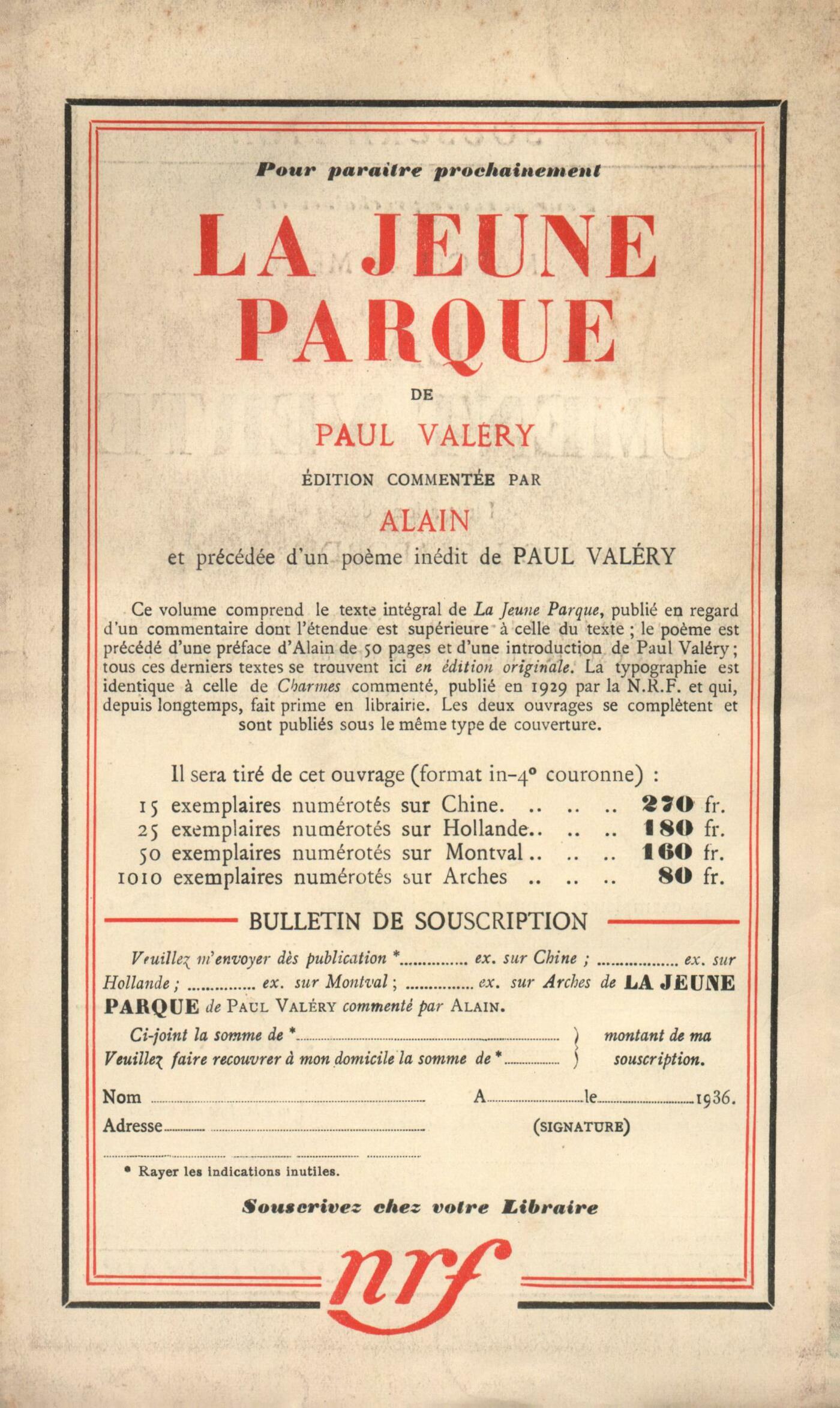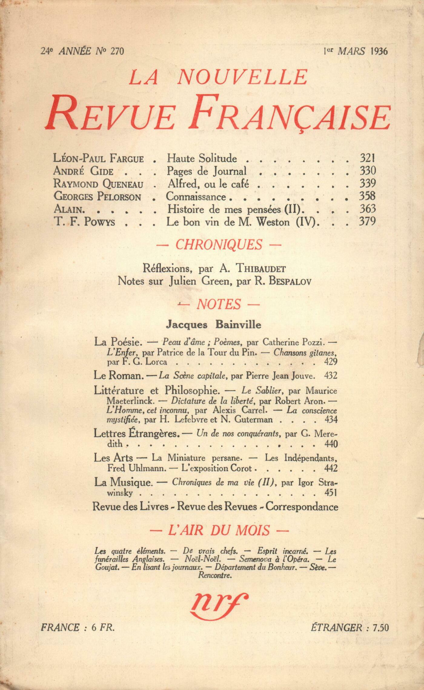 Léon-Paul Fargue, Haute SolitudeAndré Gide, Pages de JournalRaymond Queneau, Alfred ou Le caféGeorges Pelorson, Connaissance Alain, Histoire de mes pensées (II)Theodore Francis Powys, Le bon vin de M. Weston (IV)Réflexions : Albert Thibaudet, Présences du passéRachel Bespaloff, Notes sur Julien GreenBenjamin Crémieux, Jacques BainvilleNotes : la poésie : Julien Lanoë, Peau d'âme, par Catherine Pozzi (Corręa) - Počmes, par Catherine Pozzi (Mesures)Georges Pelorson, L'Enfer, par Patrice de la Tour du Pin (Mirages) - Chansons gitanes, par Federico Garcia Lorca (Cahiers de Barbarie)Notes : le roman : Jean Wahl, La Scčne capitale, par Pierre Jean Jouve (N. R. F.)Notes : littérature et philosophie : A. Rolland de Renéville, Le Sablier, par Maurice Maeterlinck (Fasquelle)Denis de Rougemont, Dictature de la liberté, par Robert Aron (Grasset)Roger Caillois, L'homme, cet inconnu, par Alexis Carrel (Plon) Étiemble, La Conscience mystifiée, par N. Guterman et H. Lefebvre (Éditions de la N. R. F.)Notes : lettres étrangčres : Georges Lafourcade, Un de nos conquérants, par George Meredith (Éditions de la N. R. F.)Notes : les arts : Louis Massignon, Sur l'origine de la miniature persaneAndré Lhote, Les Indépendants Fred UhlmanEugčne Dabit, Exposition CorotCharles-Albert Cingria, Chroniques de ma vie, II, par Igor Strawinsky (Denoël et Steele)Revue des livres : Jean Vaudal, L'homme-sec, par François Barberousse (N. R. F.) - Alias, par Maurice Sachs (N. R. F.)Jean Guérin, Les cinq femmes de la maison, par Michel Davet (Plon) - Le village en fęte, par Élie Rabourdin (N. R. F.) - Connais ton cur, par Jacques Chenevičre (Calmann-Lévy) - La flamme sauvage, par Ludovic Massé (Grasset) - Le rendez-vous, par Henri Duclos (Grasset)Marcel Arland, Bécagrun, par Raoul Stéphan (Albin Michel)Jean Guérin, Sait-on jamais?, par Vicki Baum (Stock)Revues et journaux : Anonymes, Jean Guéhenno quitte Europe - Romain Rolland a soixante-dix ansAntoine de Saint-Exupéry, Perdus dans les sablesLéon Chestov, Kierkegaard et la philosophie existentielleJean Paulhan - Armand-M. Petitjean, Imagination et réalisationCorrespondance : Jacques Morland, Lettre ŕ Paul LéautaudPierre Lamare, Une lettreGuy de Traversay, Lettre ŕ André MalrauxL'air du mois : André Gide, Les Quatre ÉlémentsJulien Benda, De vrais chefs - De l'esprit incarnéPaul Nizan, Les funérailles anglaisesAdrienne Monnier, Noël-NoëlJulie Sazonova, Mlle Sémenova ŕ l'OpéraDenis Marion, Le GoujatA. Rolland de Renéville, En lisant les journauxTristan Derčme, Les Propos de M. Polyphčme Durand : Département du bonheurJacques Delamain, Montée de sčveHenri Pourrat, Rencontre